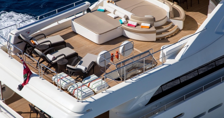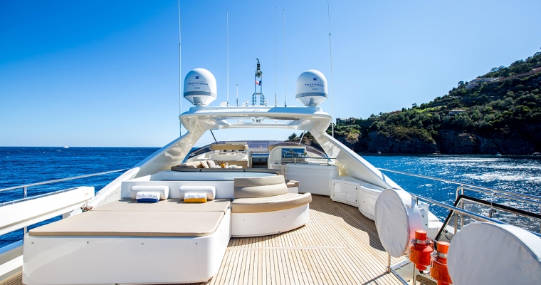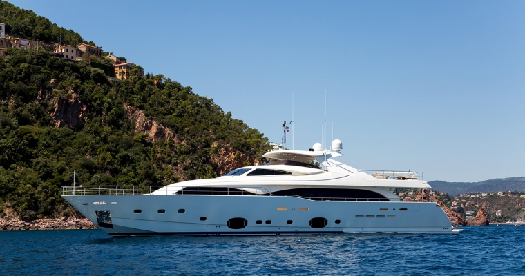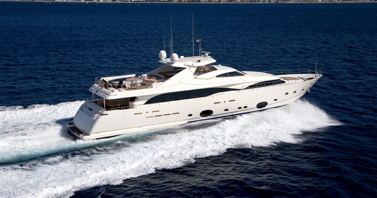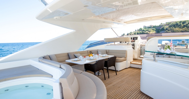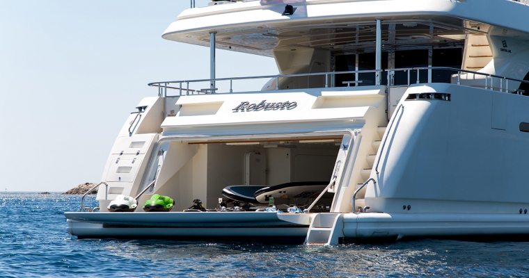 With the elegant curves characteristic of Ferretti, ROBUSTO is visually striking. With a length of 34 meters and a beam of more than 7 meters, this model is spacious. The excellent guest cabins benefit from large windows and the saloon and dining area offer generous living areas. The spacious interior, coupled with the excellent quality finish, leave the guests in no doubt they are on board a very special yacht. The large flybridge with a shallow Jacuzzi has seating, sunpads, a bar area with BBQ and an area to enjoy alfresco dining under shade if you wish. The swim platform, created when the garage door is open, offers a great area for everyone on board to enjoy life by the sea. For those requiring stability entering the water from ROBUSTO, she has a solid staircase which enters into the water from the swim platform down to approximately 5' below the water line. With an incredibly versatile berthing arrangement to suit either 2 families or a mix of adults, ROBUSTO is the quintessential charter yacht. With 5 guest cabins in total, comprising 3 doubles (1 of which can convert to a twin) and 2 single berth cabins, each equipped with 2 additional Pullman bunk-style berths (therefore sleepiZero Speed Stabilizers & running. For those requiring stability entering the water from ROBUSTO, she has a solid staircase which enters into the water from the swim platform down to approximately 5' below the water line. Photos available upon request. Event charters: maximum of 50 guests on board at quayside with bar service only. Maximum 30 with personal bar service. Dining in Saloon and main aft deck sits 10 comfortably, 12 can be accommodated. Dining on sundeck for 10 guests under shade. Aft area with sun pads have no shade. Cruising limited to no more than 60nm from a safe haven.ng up to 3 in each).