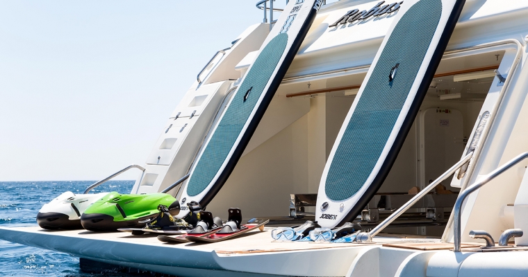 Tenders & Toys: Tender: 2016 Williams 460 Sports Jet tender 2 x Seabobs 2 x Kayaks 2 x Paddle Boards Wakeboards (Adult & Child) Waterskis Inflatable toys Snorkelling gear Board games Audio Visual Equipment and Deck Facilities: Satellite 70\\\\\\\" TV in saloon with Bose Bluetooth. Linked TVs in Master suite & aft deck. TV\\\\\\\'s in all guest cabins with Freeview TV. Flip down TV on main aft deck. Internet 3G with Wifi. Communications: Internal telephone system