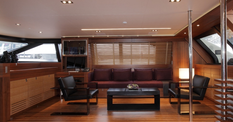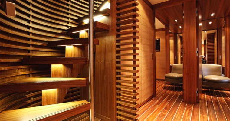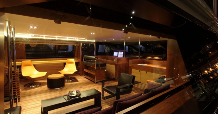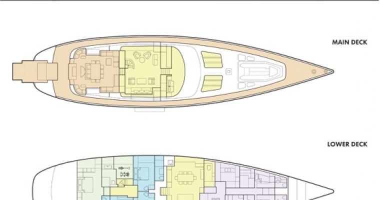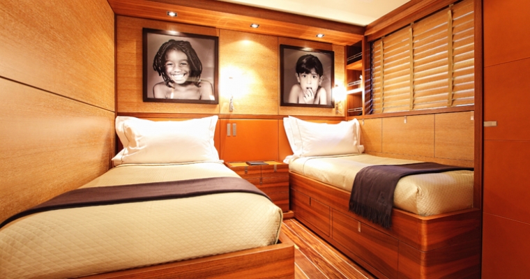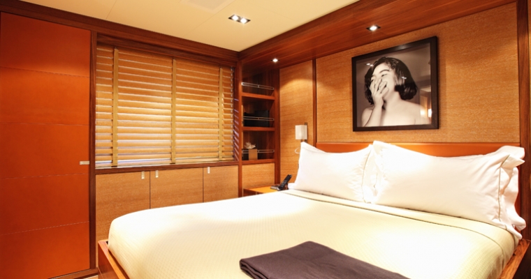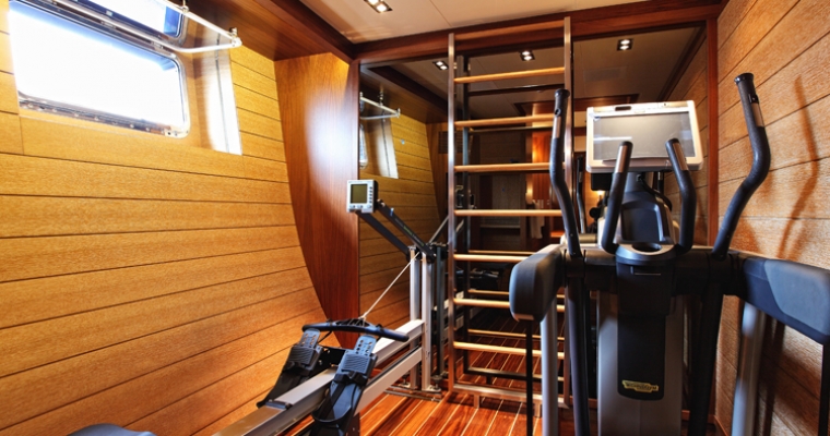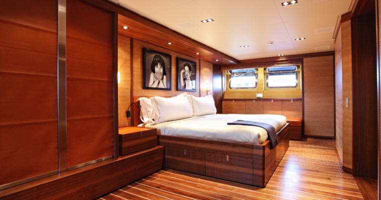 Full width master cabin aft with king size master bed. The master has ample wardrobe space and is beautifully fitted out with excellent natural light. It features a professional massage bed and shiatsu machine which is elegantly hidden away and furthermore boasts an ensuite with large Turkish steam shower as well as a full gym. She boasts two comfortable double cabins with queen size beds, in addition the final twin cabin with pullman can easily converted to a double cabin this gives sleeping opportunities for up to 9 guests in either 3 doubles and one twin plus pullman or four doubles plus pullman. All the accomodation is beautifully finished and decorated NOTE: The Master's head room is 205cm as per the drawings, and is the same for all guest areas and the upper salon. Artwork seen in brochure images is no longer on board.