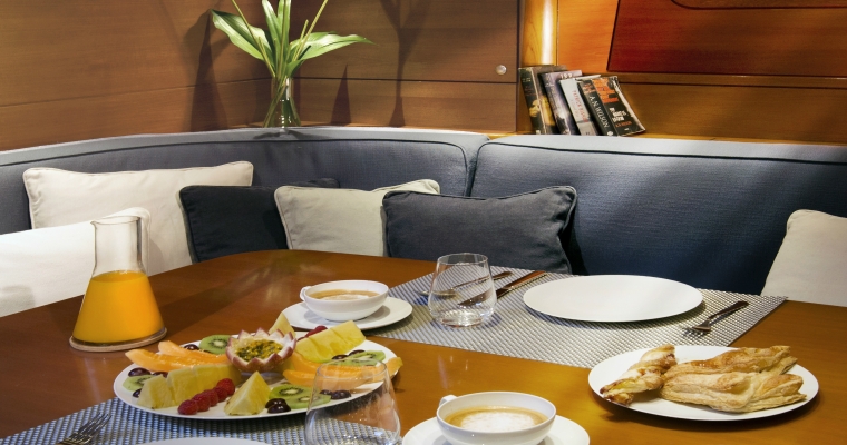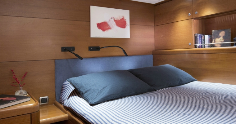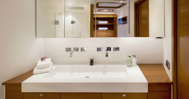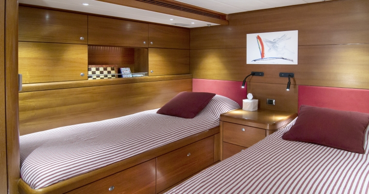 MUZUNI offers a three cabin layout comprising of a new double master cabin and ensuite (2014), guest double and guest twin. The Crew are located aft with the Crew mess and Navigation area