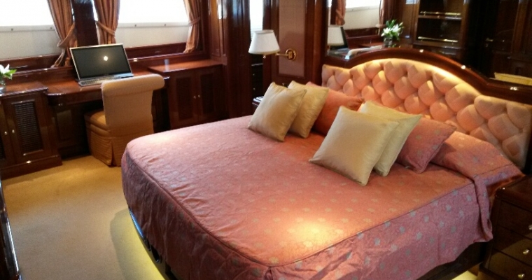 Full beam master cabin on main deck, bed size 190 x 190 cm - Full beam VIP cabin on lower deck, bed size 190 x 190 cm - 2 x twin bed cabins on lower deck, bed size 190 x 80 cm (plus one pullman for a child in the starboard twin cabin, bed size 170 x 65 cm)