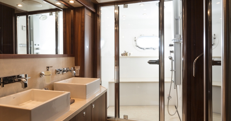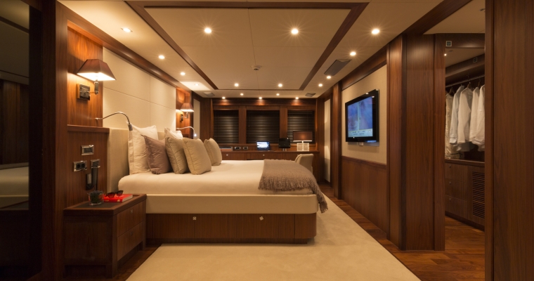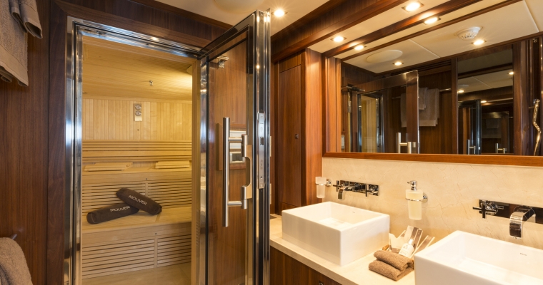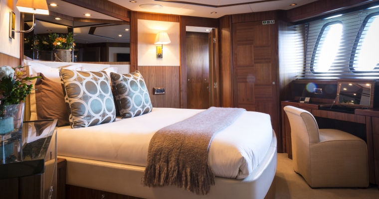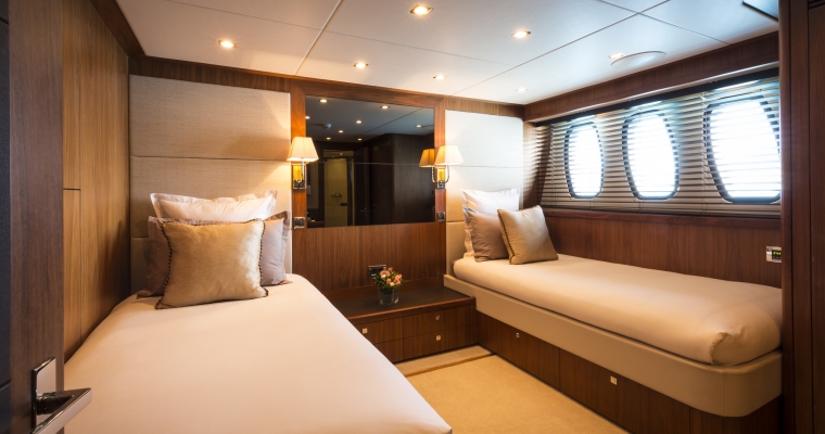 Master Cabin with king sized bed with ensuite bathroom - Shower room, (Steam room/shower) - Sauna - Dressing room with safe Two Double Cabins with queen sized bed - Bathroom - Safe Two Twin Cabins with single beds - Beds slide and fix together to make a comfortable king. - Bathroom - One twin cabin has a Pullman bed.