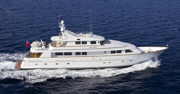 Motor yacht Lady Ellen is ideal for experiencing the waters on an East Med charter with her clean lines and soft interior. Built in 1996 by Benetti, an extensive 2016 refit ensured she is updated with a whole range of modern amenities. The 36m sleeps 10 guests in five cabins and offers a host of entertainment from her flybridge Jacuzzi to onboard watertoys. With a steel hull and aluminium superstructure, find onboard a spacious main salon with its large dining area, an impressive skylounge ideal for entertaining and, perhaps the highlight, the flybridge with its Jacuzzi hot tub and surrounding sun beds. Luxury yacht Lady Ellen is powered by two Caterpillar engines that allow her to cruise comfortably at speeds between 11 and 13 knots. Featuring a dedicated and professional crew of seven led by Captain Yannis Antonaros, she is an excellent charter yacht for luxury vacations.