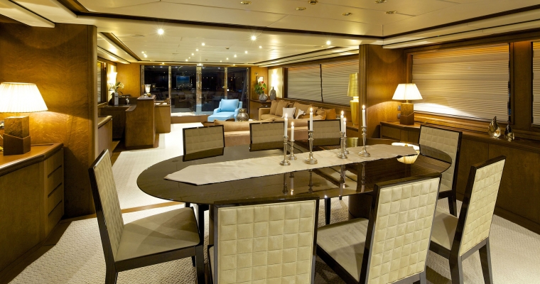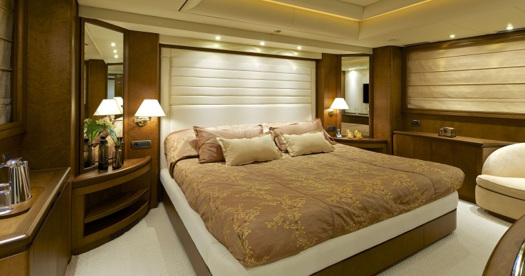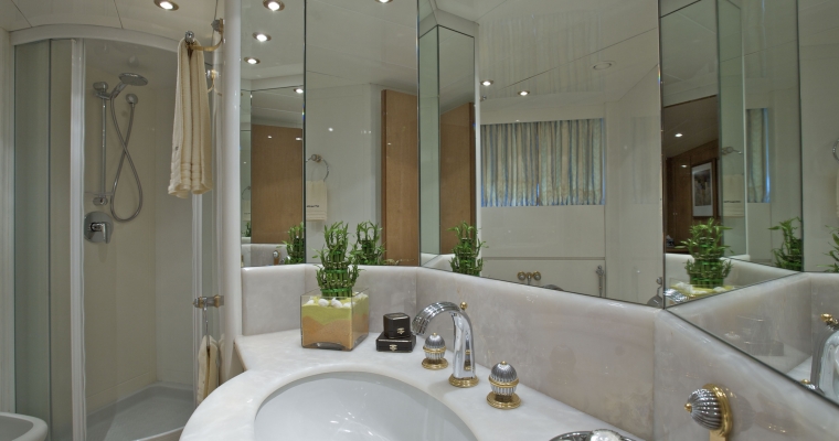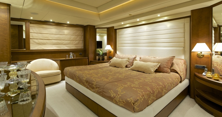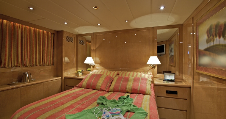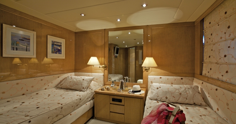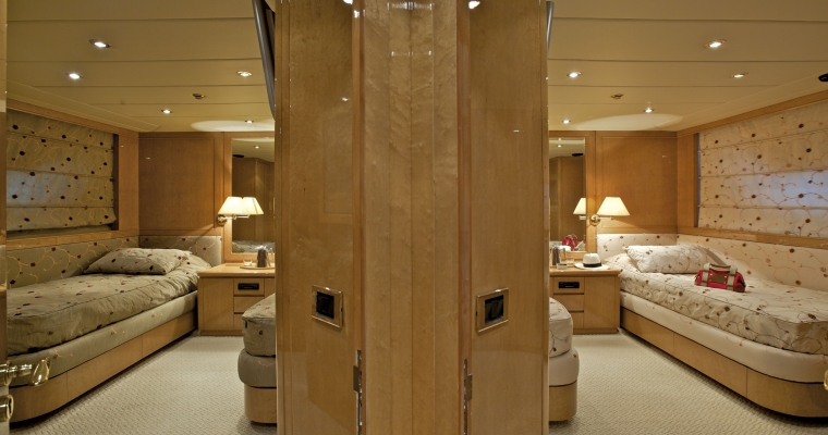 Main deck: One full beam Master cabin with king-size bed; Jacuzzi. hydro massage shower and walk-in closet. Lower deck: Two VIP cabins with queen size beds, and two cabins with twin beds. En-suite facilities in all cabins.