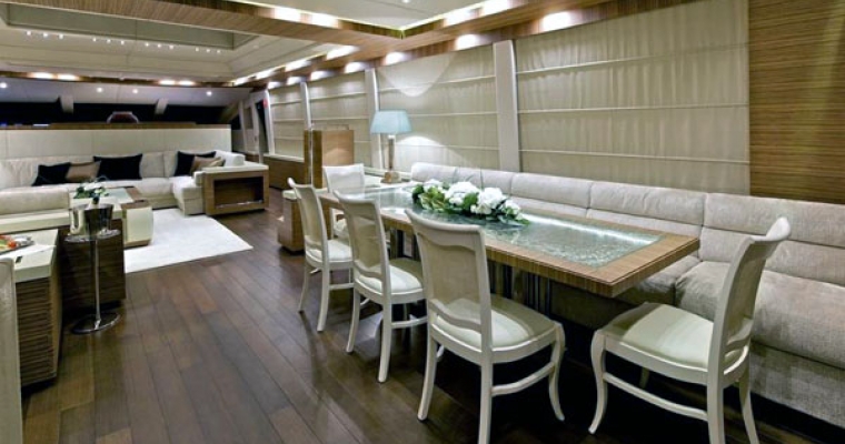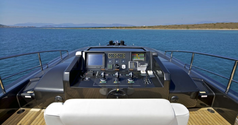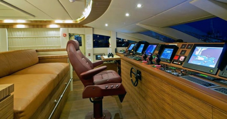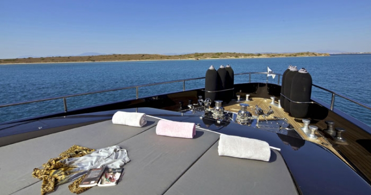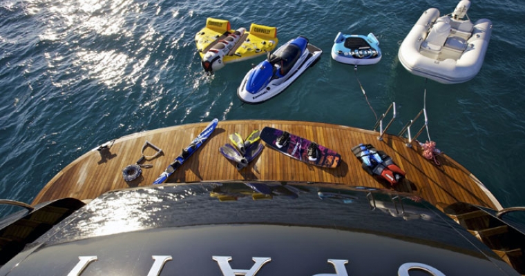 Tenders & Toys: One ZAR 5.30m tender with 140hp outboard, one jet ski 3 seat Kawasaki, sea bob, water ski equipment, wake board, tubes, stand up paddle SUP fishing and snorkeling equipment. Fly board upon request. Rendezvous diving only. Audio Visual Equipment and Deck Facilities: LCD Monitors, Home Cinema System and AV surround system in all staterooms and salons. CD/DVD/Blue Ray/mp3 player, PS3, PS4, Satellite receivers, ios devices compatibility, Airplay, Apple tv, I pads. Communications: SATCOM, Satellite and 4G Internet connection at all areas.