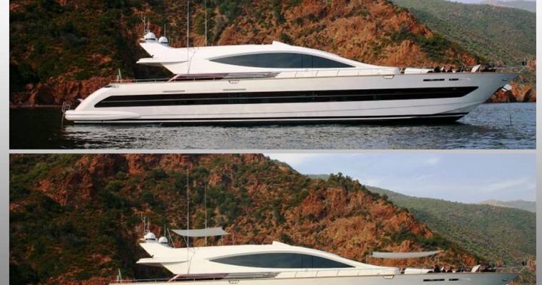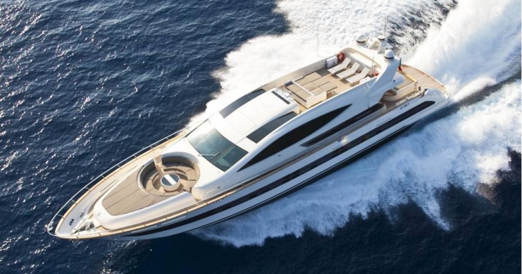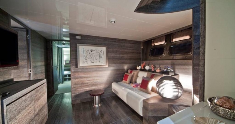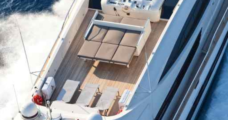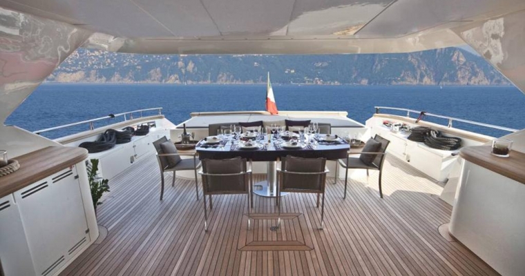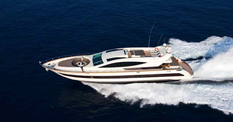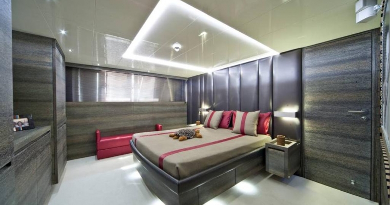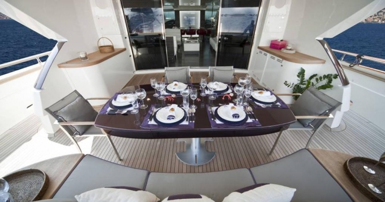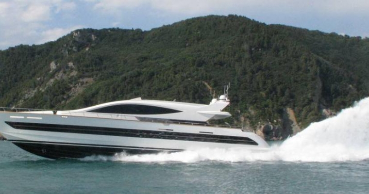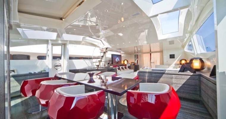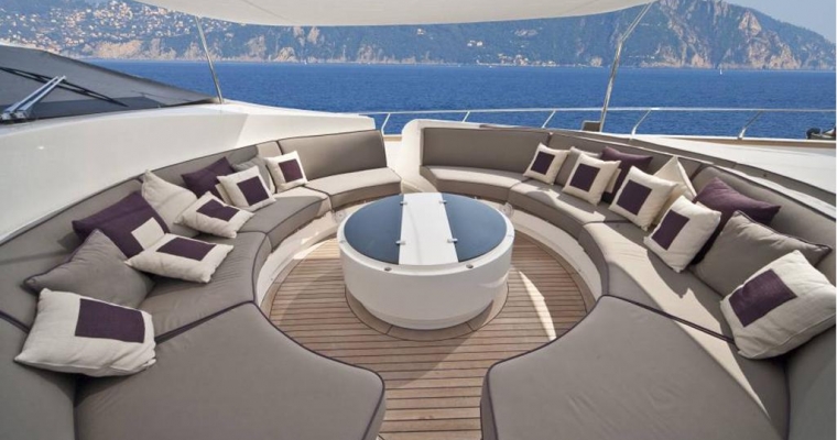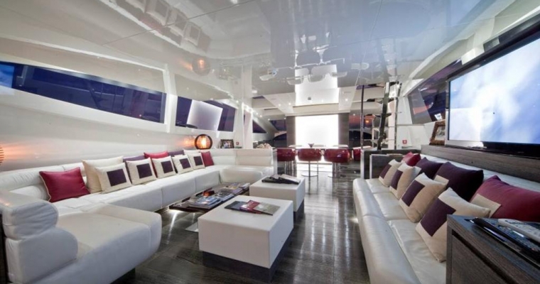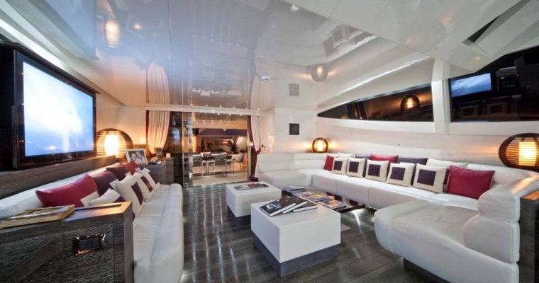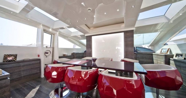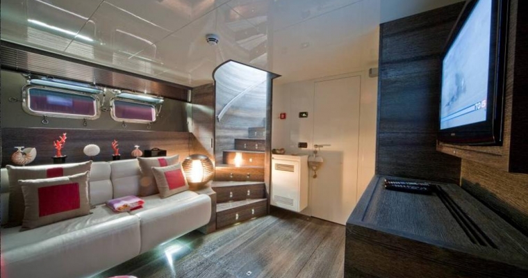 Successful Cerri shipyard model with modern design and fast hull (up to 40 knots). Wide living areas either inside or on deck. Toby offers a huge salon with warm décor, bright colour sofas, dining table and Fendi Home chairs; a full width opening sunroof gives brightness to the area. Forward a lower salon with library and Tv screen. Wide deck spaces with a very spacious top deck where the three seater driving chair block is a multifunction unit that turns in a large sundeck area; chaises longues complete the comfortable uppoerdeck space. On maindeck forward Toby offers a large sundeck area and a huge circular settee that can accommodate up to 20 guests comfortably seated (ideal for alfresco dining), under the shadow of a bimini top. Astern (cockpit) there's a large dining table for 10 guests with frigobar and a comfortable sundeck space with matresses.