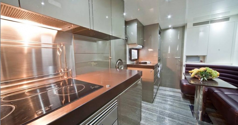 10 guests in 5 suites: 1) Owner suite with king size bed, small private office and a very spacious bathroom 2) midship double bedded Vip cabin with ensuite head 3) twin cabin with ensuite head 4) twin cabin with ensuite head 5) second VIP suite with double bed forward and ensuite toilet Day head on upperdeck