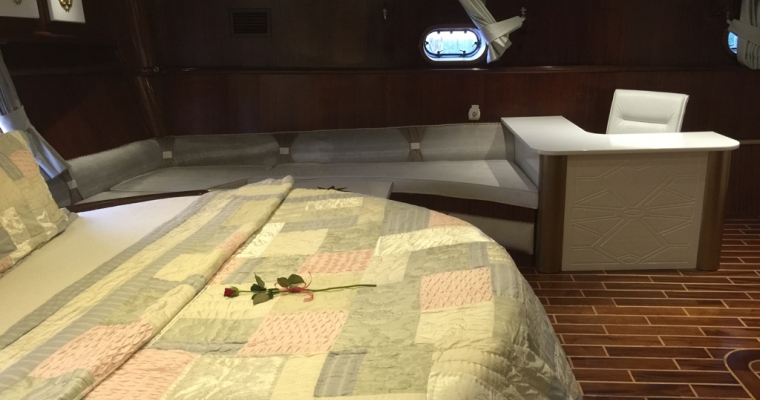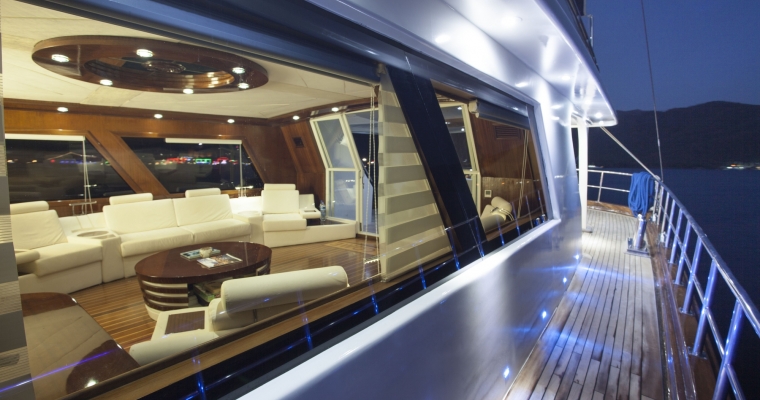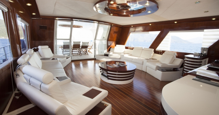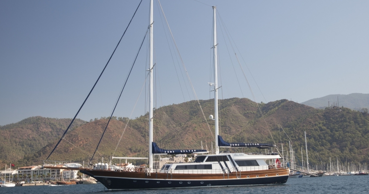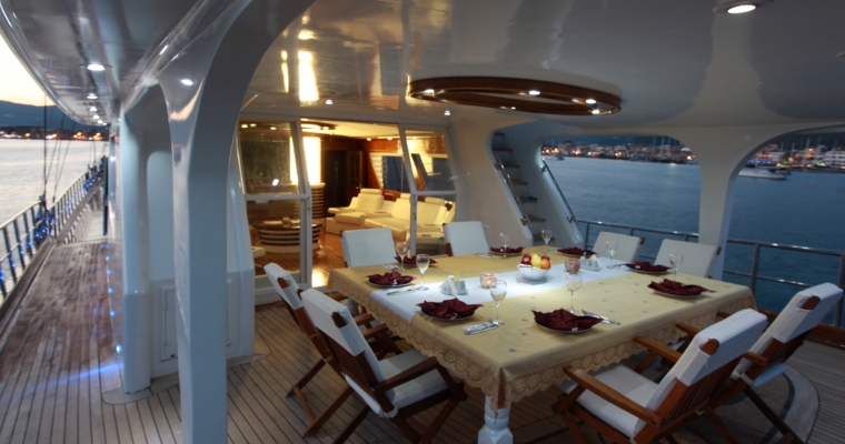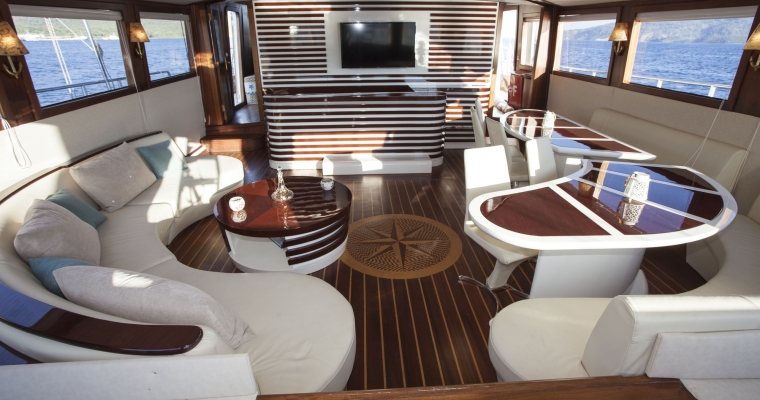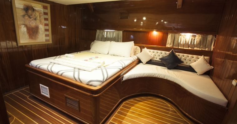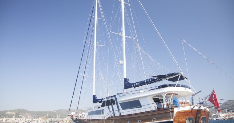 Esma Sultan is a luxurious and elegant charter yacht, both in appearance and facilities, first released into the Mediterranean in 2008, where she resides. She is a beautiful blend of classic lines, expanse and rich furnishings. This combination of traditional beauty and contemporary luxury is all that can be expected from the first class designer, Nurser Celikoz, with interior styling by Ali Riza Turan, and has been built to Lloyd standard for construction and design. Esma Sultan gulet is in her own league for space both on deck and in her luscious interior. She accommodates up to 14 guests in her spacious 7 cabins which are ensuite and furnished with TV and DVDs. The master cabin is replete with an 8ft round bed and jacuzzi additional to the ensuite. Light floods into the room through the 2 large windows with a view onto the sea. There are 4 cabins which are queen sized and 2 cabins are a combined queen and single setting. There are four dining spaces available; at the back of the yacht with seating of up to 14 guests on the long dining table. There are 2 alternative areas to dine in a more relaxed setting; at the front, on the flybridge and a dedicated interior dining saloon. Esma Sultan includes her own chef able to prepare gastronomical delights as well as having her own host and crew. The flybridge has been created as your ultimate relaxation space; there are sun loungers complete with an 8 person jacuzzi with an ipod docking base. Inside are two saloons boasting spacious seating, and LCD TV, DVD and music system. The interior of the Esma Sultan is styled and built in rich polished wood of diverse tones to capture the light set against her light leather furnishings for comfort and light. There are ample water toys and tenders for you to use and enjoy, and Wifi is available through luxury gulet Esma Sultan for your comfort. Come and discover a piece of paradise with Esma Sultan.