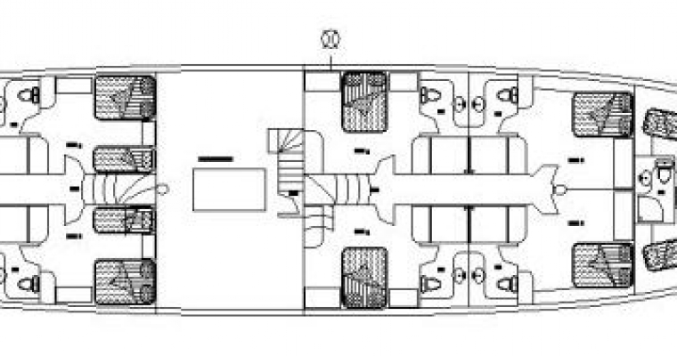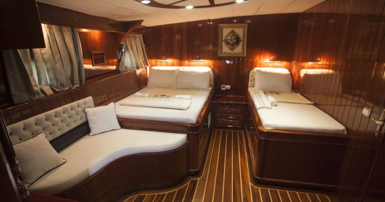 1 Master Suite 4 Double cabins 2 Double cabins with additional one single bed All cabins have en-suite facilities, safe box and hair dryers.