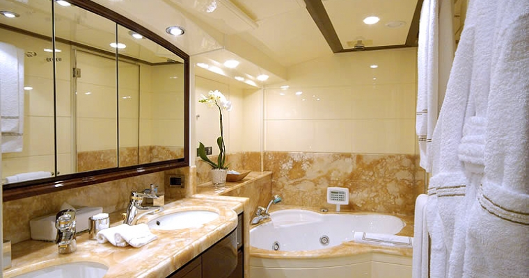 One Master Cabin with double bed. bathroom ensuite with jacuzzi Two double guest cabins , each with bathroom ensuite Two twin cabins (the twin beds have been enlarged) each with an extra pullman bed and their bathroom ensuite