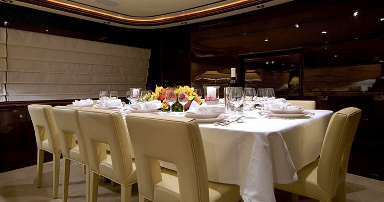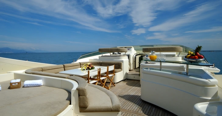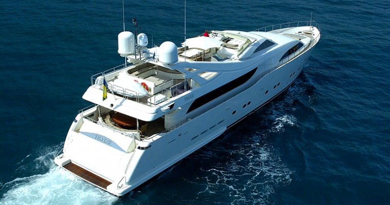 TWO-KAY (ex: Bo Veerle, Rasha) is the first Custom Line 112 flagship yacht by Ferretti, launched in 2001, with a refit in 2016, she measures 34m (112ft) and can accommodate up to 10 guests in 5 cabins. Built to the highest standards by the Zuccon International Project workshop, with great attention to external and internal design, the latter in collaboration with the CRN engineering division of which Custom Line is part, TWO-KAY offers a modern interior with clean lines. She is a very practical yacht with a good functional layout and neutral pleasing decor. Her salon is comfortable, cozy and offers ample seating space, with three sofas to port side, around a big coffee table. It leads on to the open plan formal dining area, large enough to seat a group of 10/12 people, ideal for indoor meals in the company of family and friends. Her full beam master suite is located forward of the main deck, whilst the 4 guest staterooms are located below. This luxurious motor yacht also offers striking exterior styling with teak decks and an excellent aft deck area where it is possible to enjoy shaded alfresco dining. She also boasts a lovely Flybridge with a vast sunbathing area, Jacuzzi, settees and a barbecue, ideal for entertainment out in the sun. The stern area offers a spacious garage large enough for a 5 metre tender and a jet ski and this charter yacht offers all sorts of toys for the pleasure of the water lovers. TWO-KAY has 2 x MTU 12V4000, V12 diesel engines rated 2040 kw @ 2.100 rpm each with ZF direct drive gearbox. She cruises at speeds of 23 knots with top speeds of 27 knots.