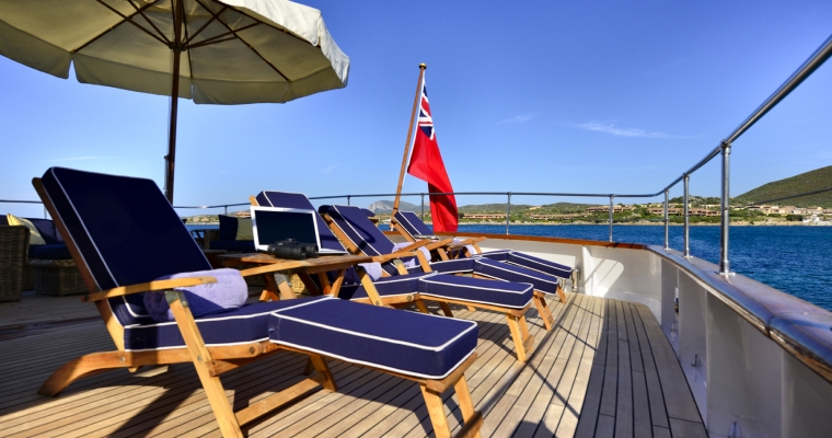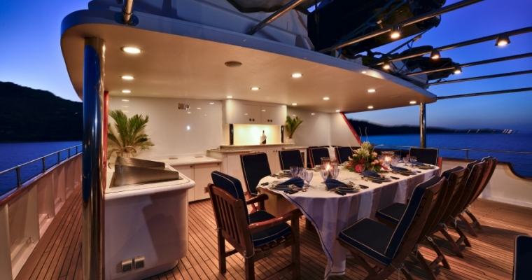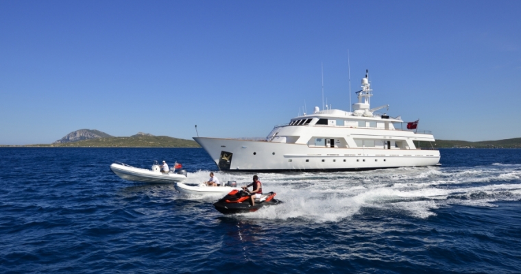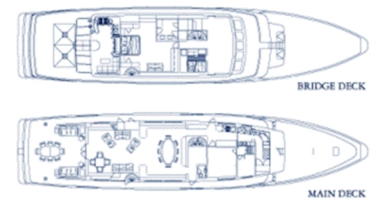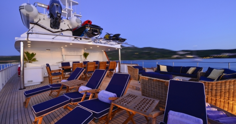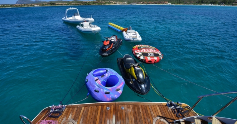 Tenders & Toys: Full assortiment inflatable 1 rib Capelli with 30 hp outboard engine 1 rib Novurania 530 with 115hp outboard engine Reflex wakeboard 1 Yamaha jet skis 1 waverunner Seadoo RXT-X aS260 Water skis Audio Visual Equipment and Deck Facilities: Colour TV and hi-fi stereo, video player in dining area , bar and saloon Colour TV’s, hi-fi and video’s in Master and VIP cabins Sun awnings on sundeck Hydraulic passerelle