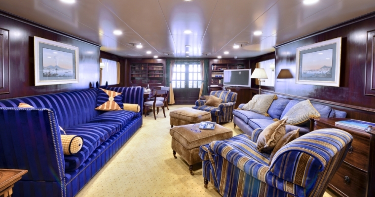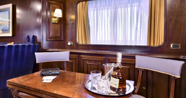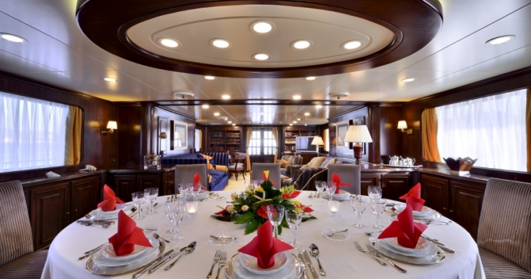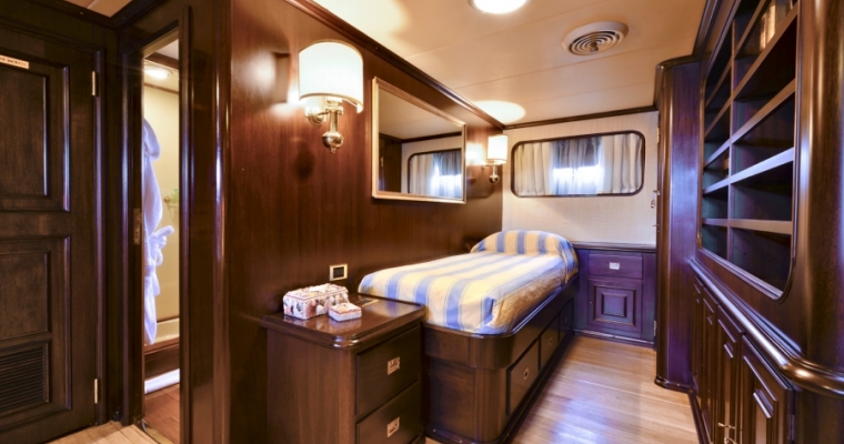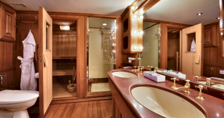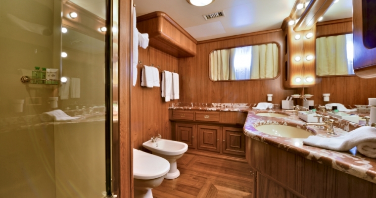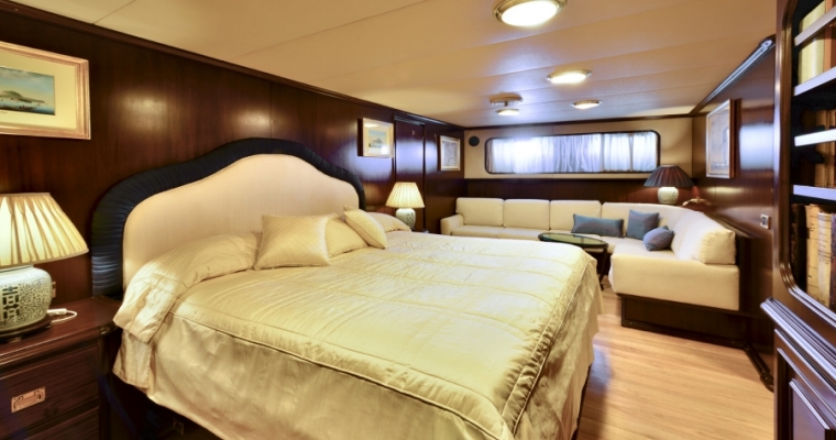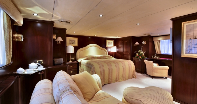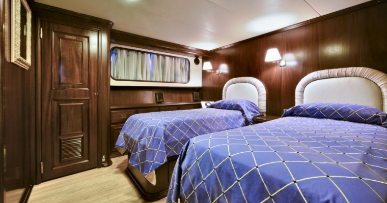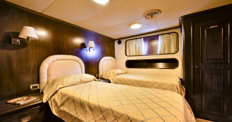 MASTER SUITE: The master cabin on the upper deck has study and lounge areas together with a sauna in the en suite shower. The cabin has a queen sized bed, en suite bathroom, is fully air conditioned and fitted with TV, telephone and CD player. VIP CABIN 1 AND 2: Situated on the lower deck , both VIP cabins are en suite, air conditioned, have queen sized beds and are fitted with TV, telephone and CD players. The VIP cabin 2 has an en suite Jacuzzi and lounge area. The VIP cabin 2 has an occasional extra bed which can be used by arrangement. TWIN ROOMS: The twin cabins have shower rooms en suite