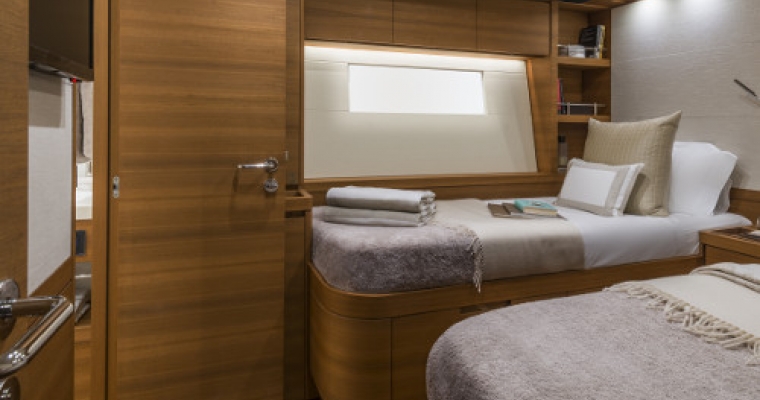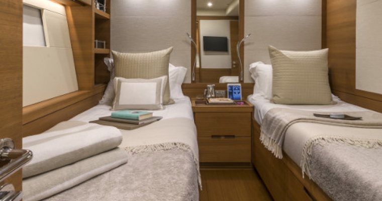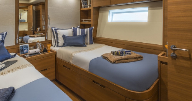 4 cabins - 1 Master Cabin (double), 1 VIP cabin (double), 2 Guest Cabins (both twin bunks). There are 3 cabins for the crew (Captain stbd, Crew port and Hostess stbd opposite to the Galley)
