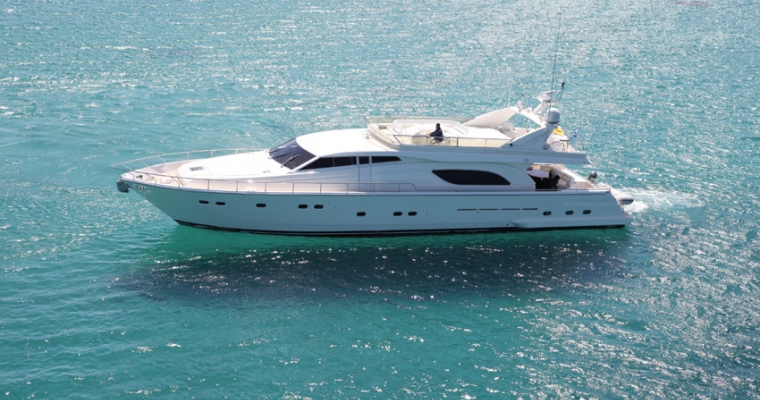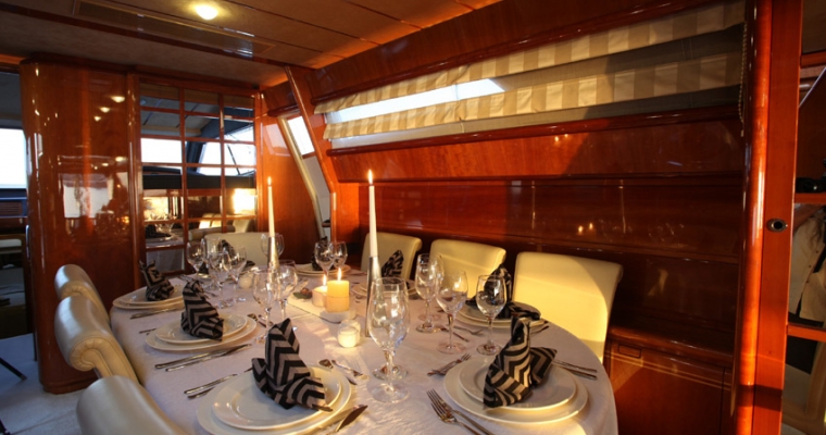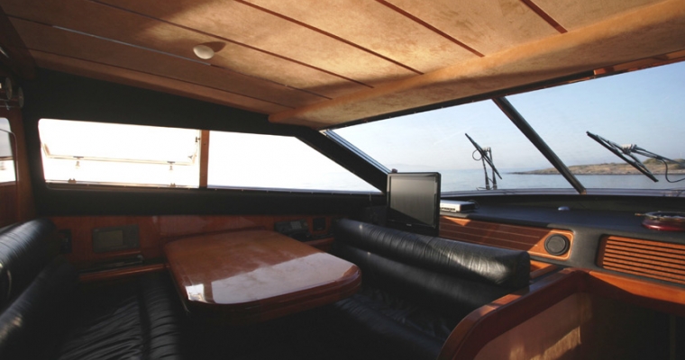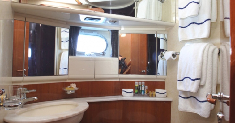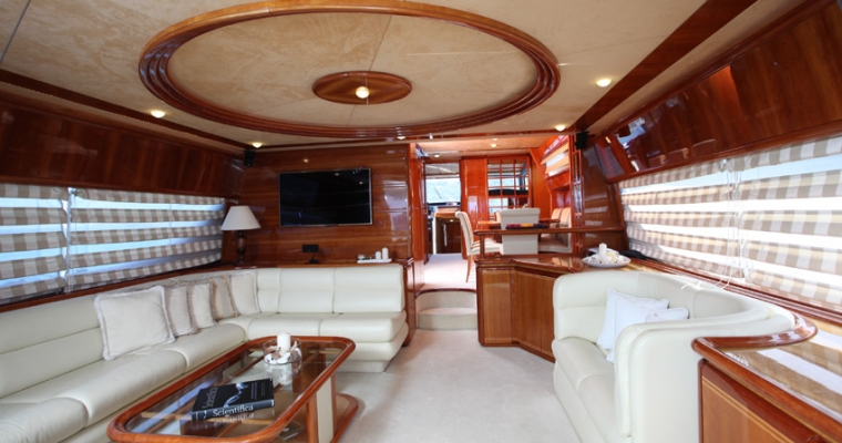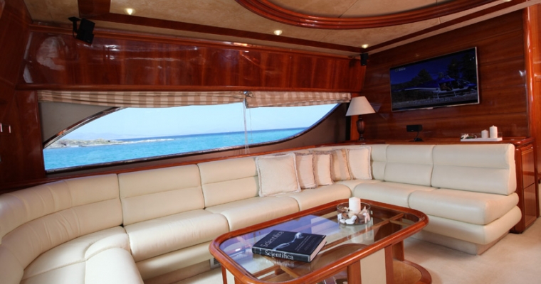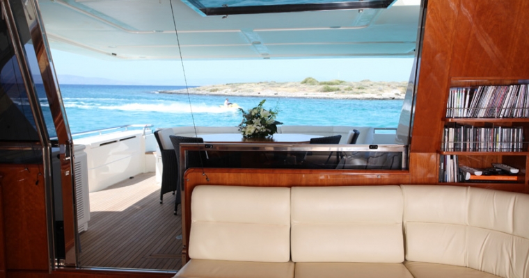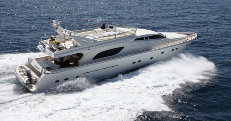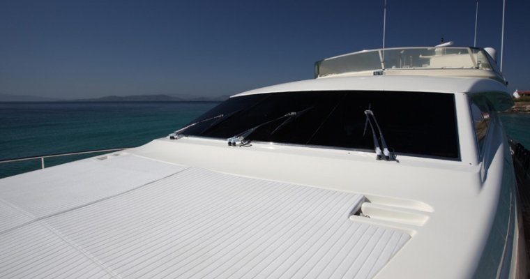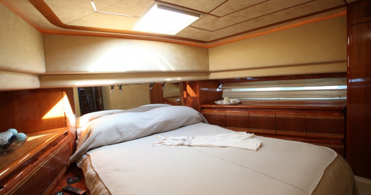 KENTRAVROS II is a fast Ferretti of 80 feet in length cruising at 33 knots! She accommodates up to 8 passengers in four staterooms. The full width of the yacht Master cabin has a king sized bed, a settee, dressing table and en suite bath with a bath tub. The VIP cabin, with a queen-sized bed, like the Master cabin has en suite facilities, an LCD TV and surround stereo system. The other two cabins have twin beds and en suite facilities. A unique combination of wood and a light and fresh interior throughout the yacht provides a welcoming and comfortable ambience. The Salon boasts a state of the art entertainment center with satellite TV, DVD and B+O stereo surround system. Guests can enjoy gourmet dinning either inside at the raised dining room or al fresco on the spacious aft covered deck. The Sun Deck is a favorite place for most guests as they can lounge and sunbathe in pure privacy.