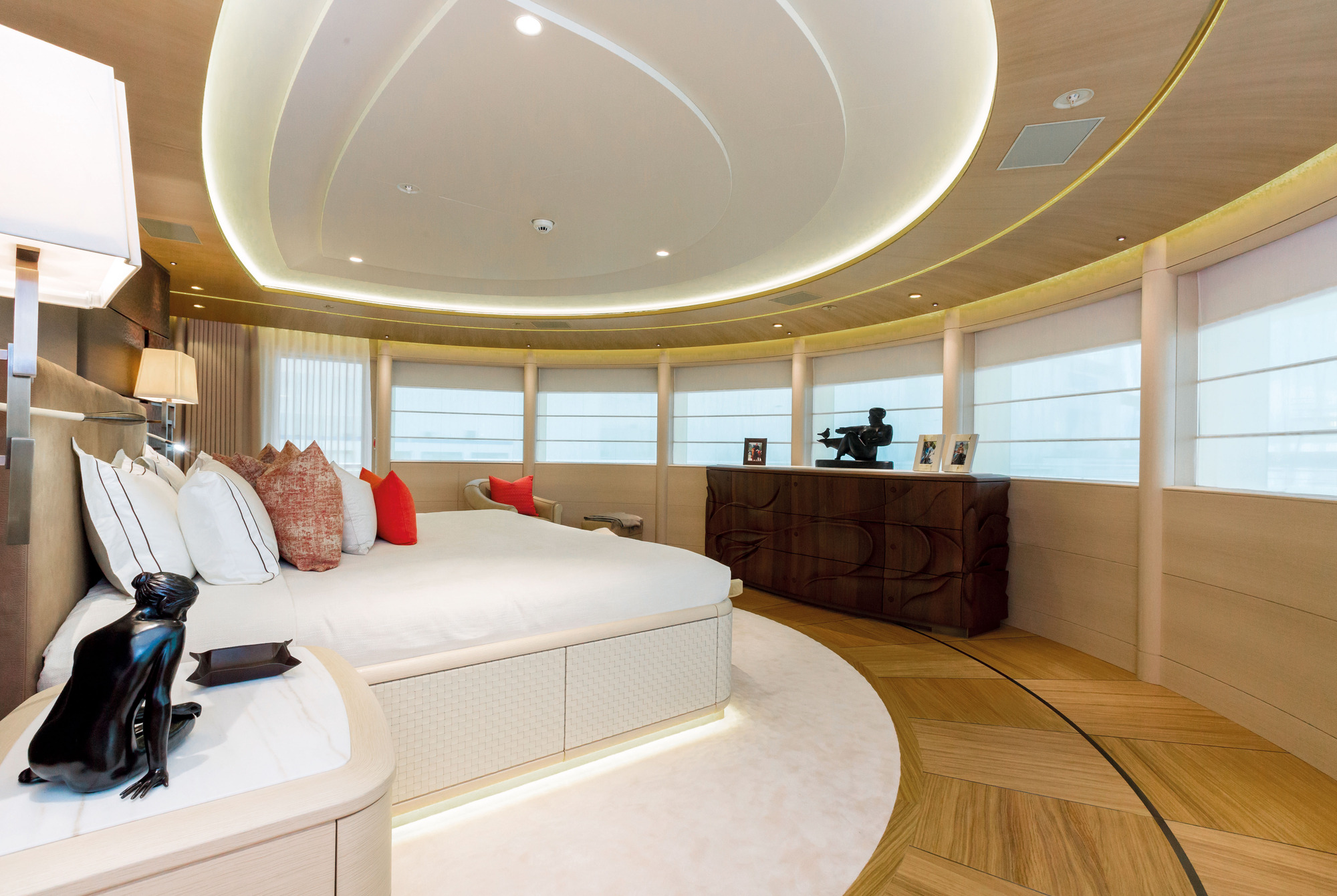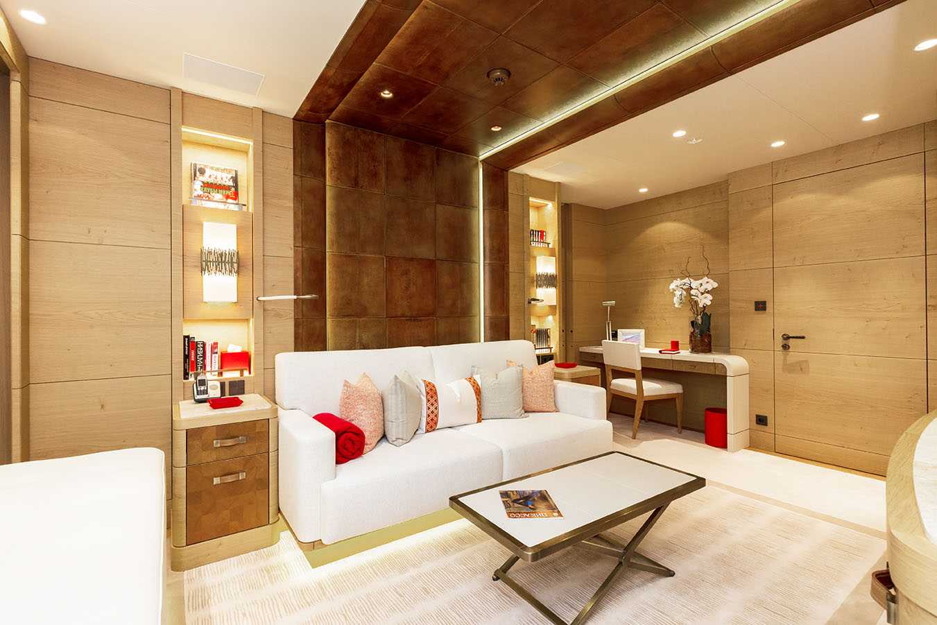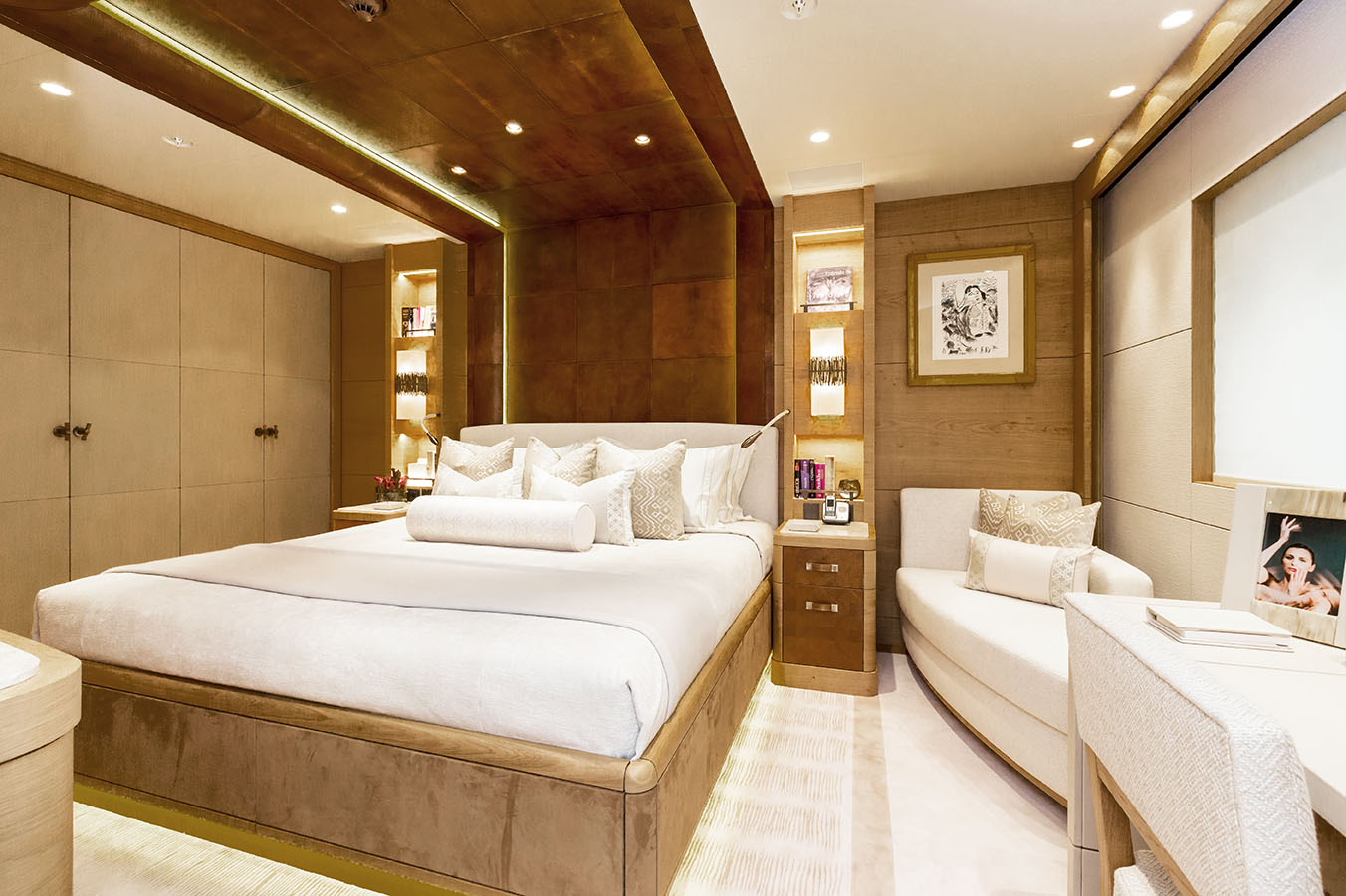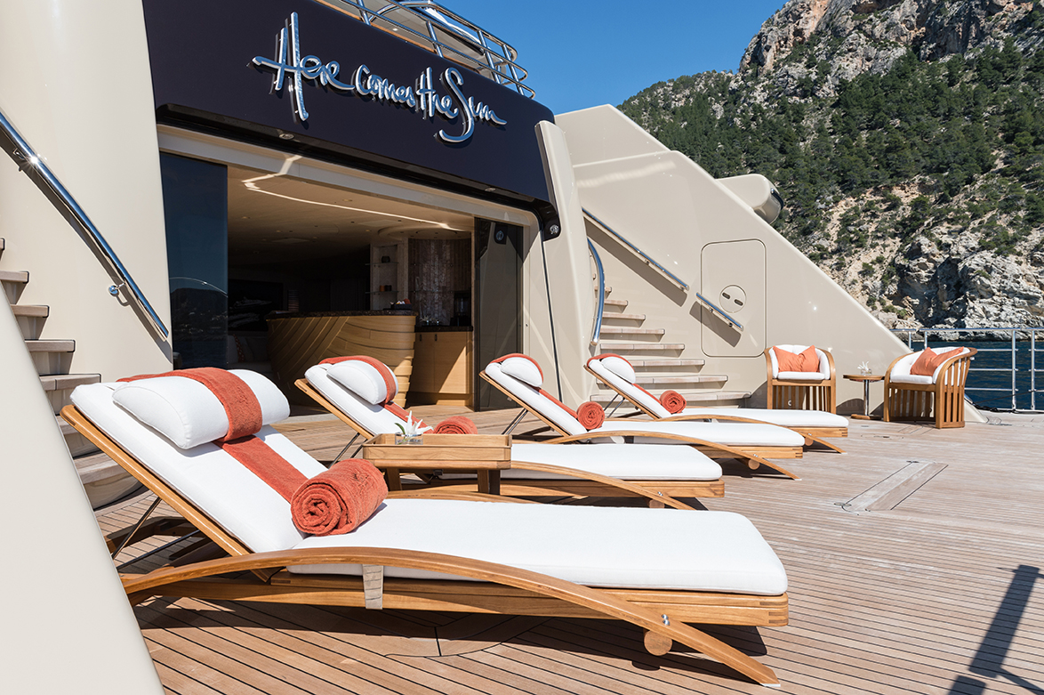HERE COMES THE SUN has a very well-thought layout offering a lot of versatility and roominess. The yacht features a beautiful Master suite apartment and a VIP suite on the upper deck and 7 luxurious staterooms on the main deck. Four of these seven cabins can convert to 2 VIP cabins with ensuite and lounging areas. A staff cabin is also located on the bridge deck. - Master suite apartment looking forward and starboard side, walk through dressing room, 180 degree panoramic view, ensuite with shower. The master also features two sliding doors on each side of the suite to allow fresh air in the room (weather permitting and not in navigation). The Master suite features a custom made bed 250 x 210 cm. Owner's office - VIP suite on port side, featuring a King size bed, walk through dressing room and ensuite with shower. - 2 spacious VIP suites with lounging area, walk in dressing room and ensuite with tub and shower on main deck. These 2 suites can be partitioned so as to create 4 staterooms instead, each with ensuite facilities. All cabins feature king size beds. - 3 large guest staterooms with walk in dressing room and ensuite with shower on the main deck. All three cabins feature king size beds - Queen size bed staff cabin on the bridge deck with ensuite with shower.