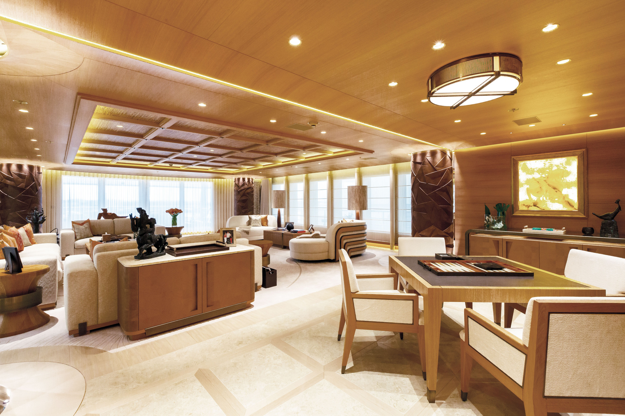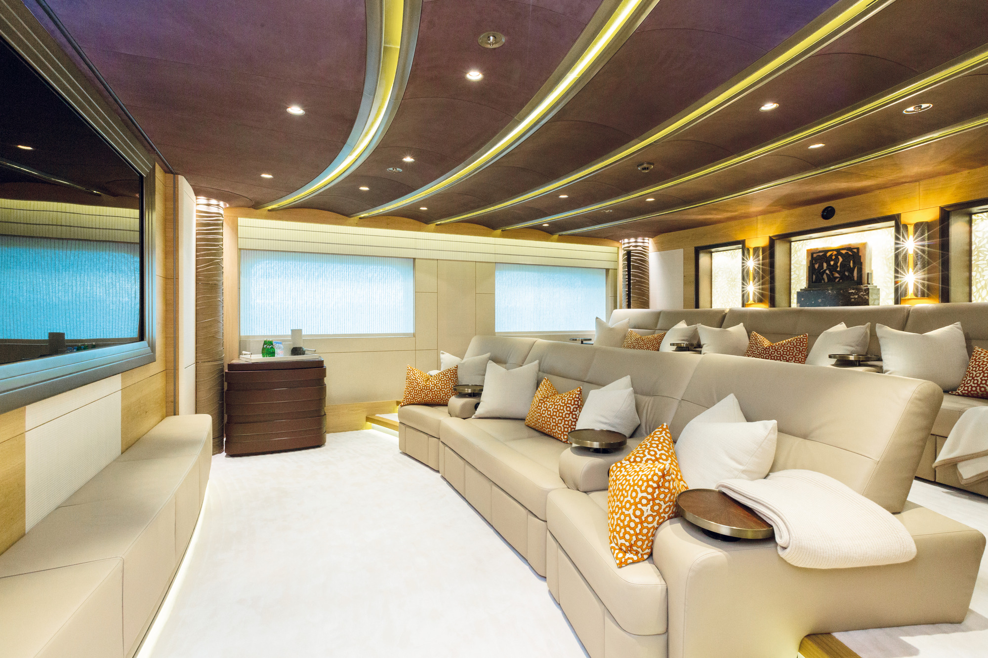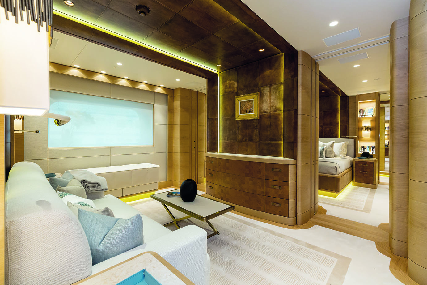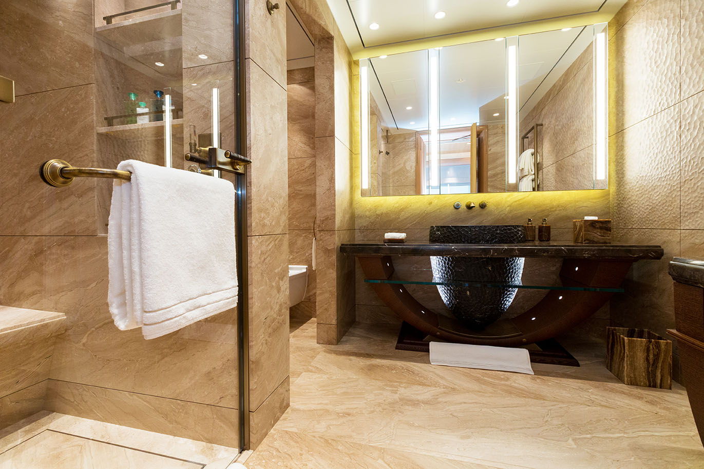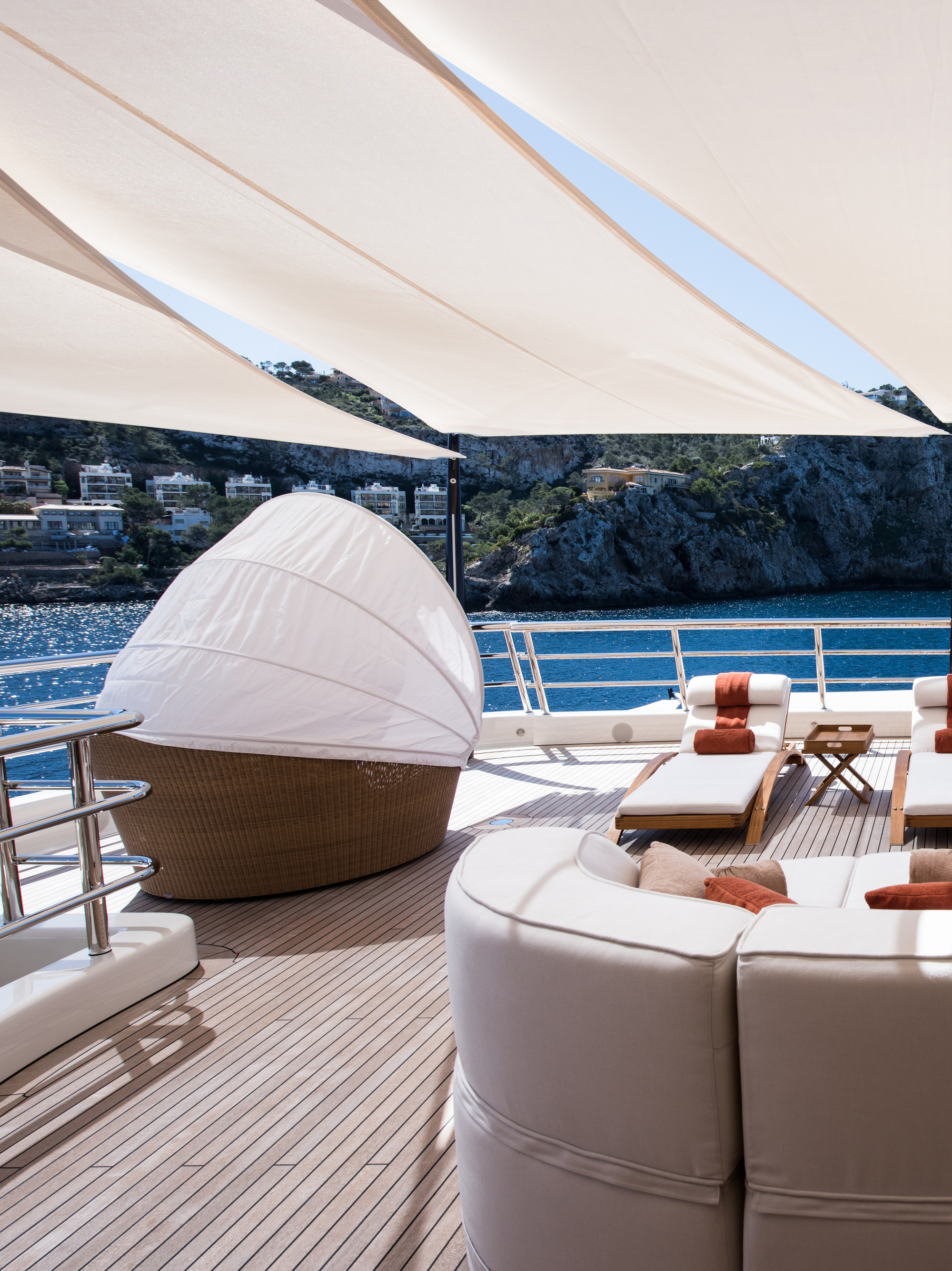 HERE COMES THE SUN has a very well-thought layout offering a lot of versatility and roominess. The yacht features a beautiful Master suite apartment and a VIP suite on the upper deck and 7 luxurious staterooms on the main deck. Four of these seven cabins can convert to 2 VIP cabins with ensuite and lounging areas. A staff cabin is also located on the bridge deck. - Master suite apartment looking forward and starboard side, walk through dressing room, 180 degree panoramic view, ensuite with shower. The master also features two sliding doors on each side of the suite to allow fresh air in the room (weather permitting and not in navigation). The Master suite features a custom made bed 250 x 210 cm. Owner's office - VIP suite on port side, featuring a King size bed, walk through dressing room and ensuite with shower. - 2 spacious VIP suites with lounging area, walk in dressing room and ensuite with tub and shower on main deck. These 2 suites can be partitioned so as to create 4 staterooms instead, each with ensuite facilities. All cabins feature king size beds. - 3 large guest staterooms with walk in dressing room and ensuite with shower on the main deck. All three cabins feature king size beds - Queen size bed staff cabin on the bridge deck with ensuite with shower.