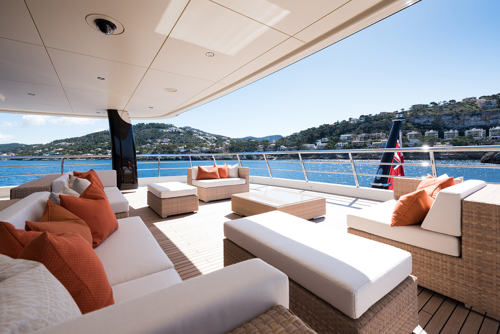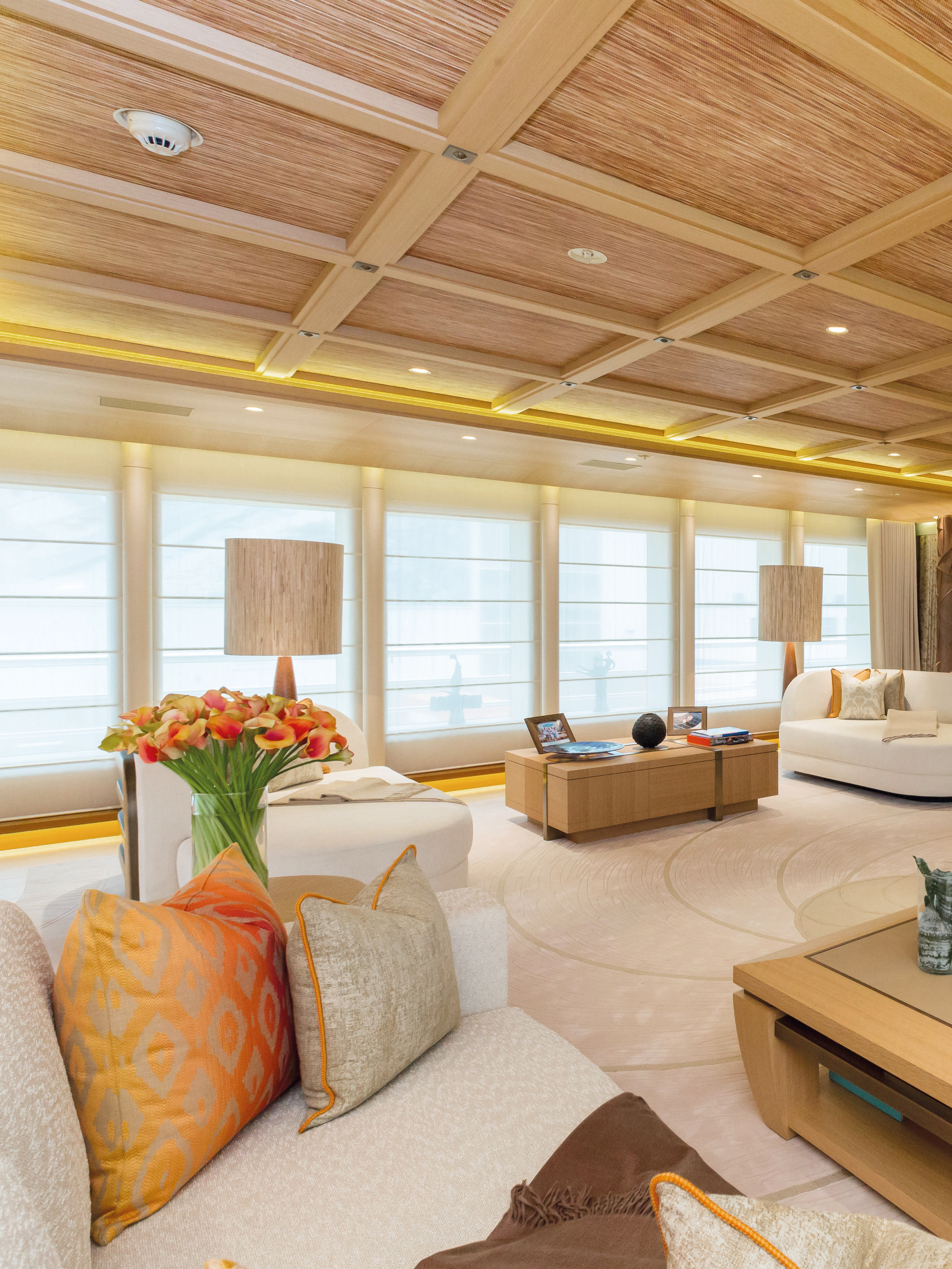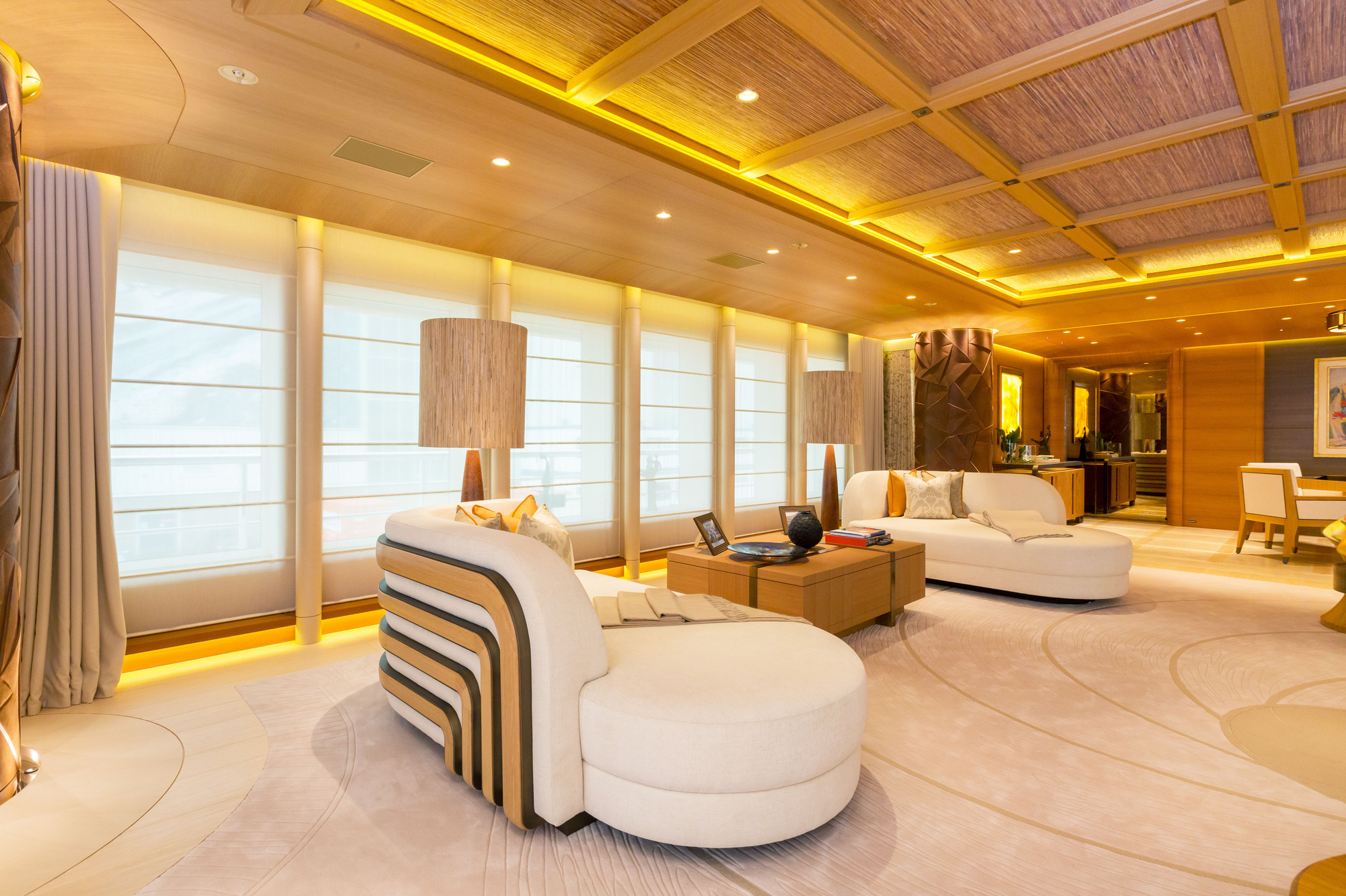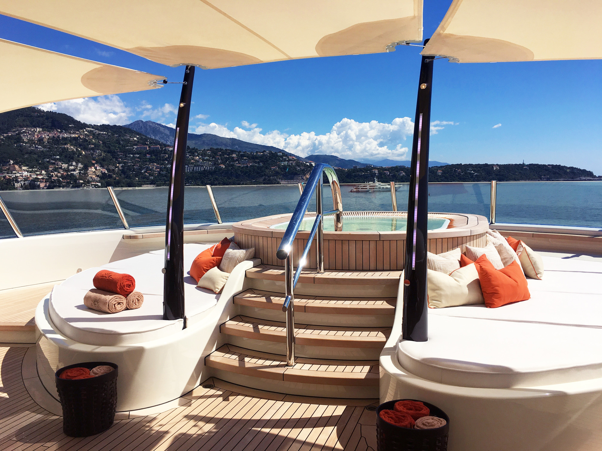 HERE COMES THE SUN has a very well-thought layout offering a lot of versatility and roominess. The yacht features a beautiful Master suite apartment and a VIP suite on the upper deck and 7 luxurious staterooms on the main deck. Four of these seven cabins can convert to 2 VIP cabins with ensuite and lounging areas. A staff cabin is also located on the bridge deck. - Master suite apartment looking forward and starboard side, walk through dressing room, 180 degree panoramic view, ensuite with shower. The master also features two sliding doors on each side of the suite to allow fresh air in the room (weather permitting and not in navigation). The Master suite features a custom made bed 250 x 210 cm. Owner's office - VIP suite on port side, featuring a King size bed, walk through dressing room and ensuite with shower. - 2 spacious VIP suites with lounging area, walk in dressing room and ensuite with tub and shower on main deck. These 2 suites can be partitioned so as to create 4 staterooms instead, each with ensuite facilities. All cabins feature king size beds. - 3 large guest staterooms with walk in dressing room and ensuite with shower on the main deck. All three cabins feature king size beds - Queen size bed staff cabin on the bridge deck with ensuite with shower.