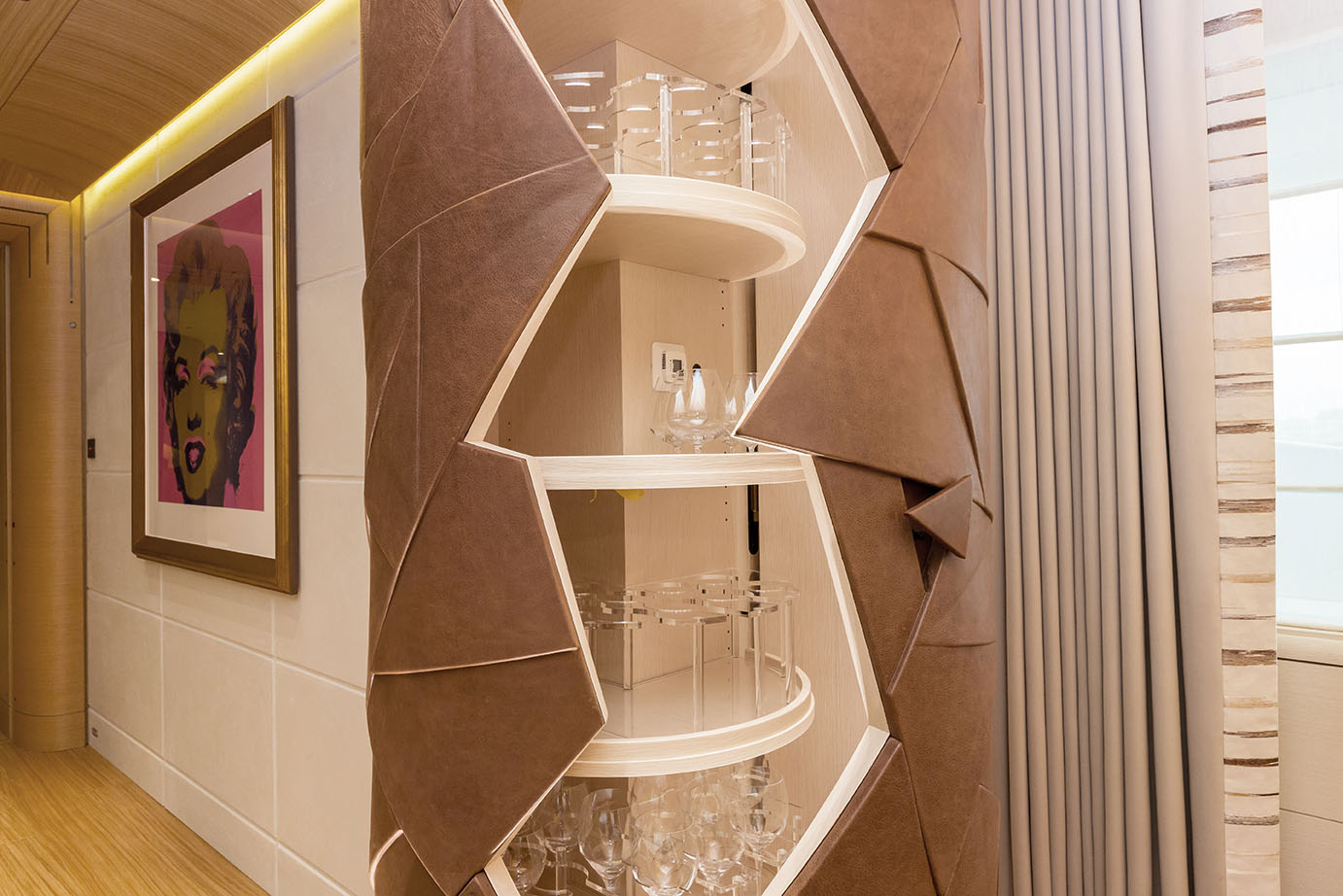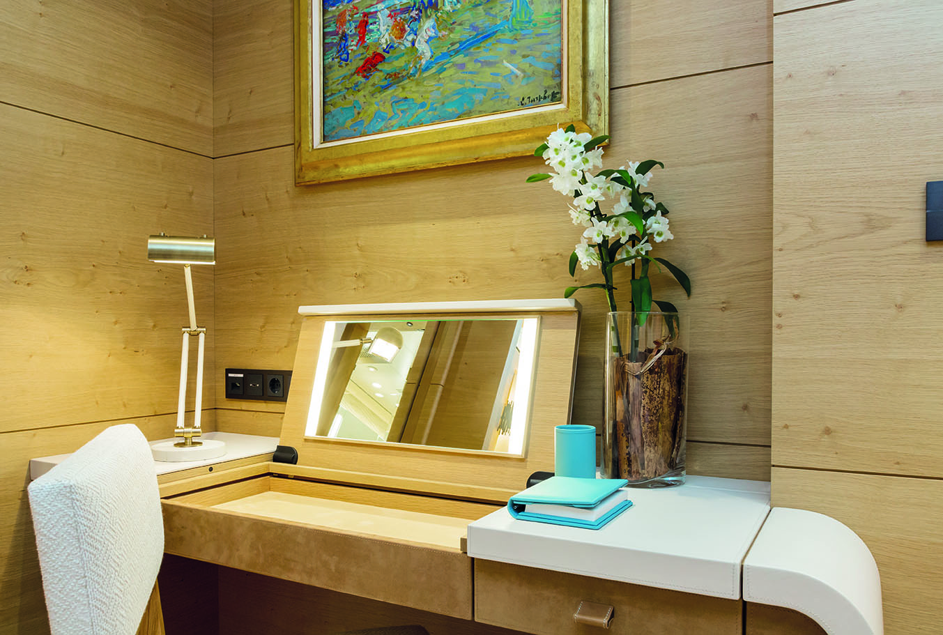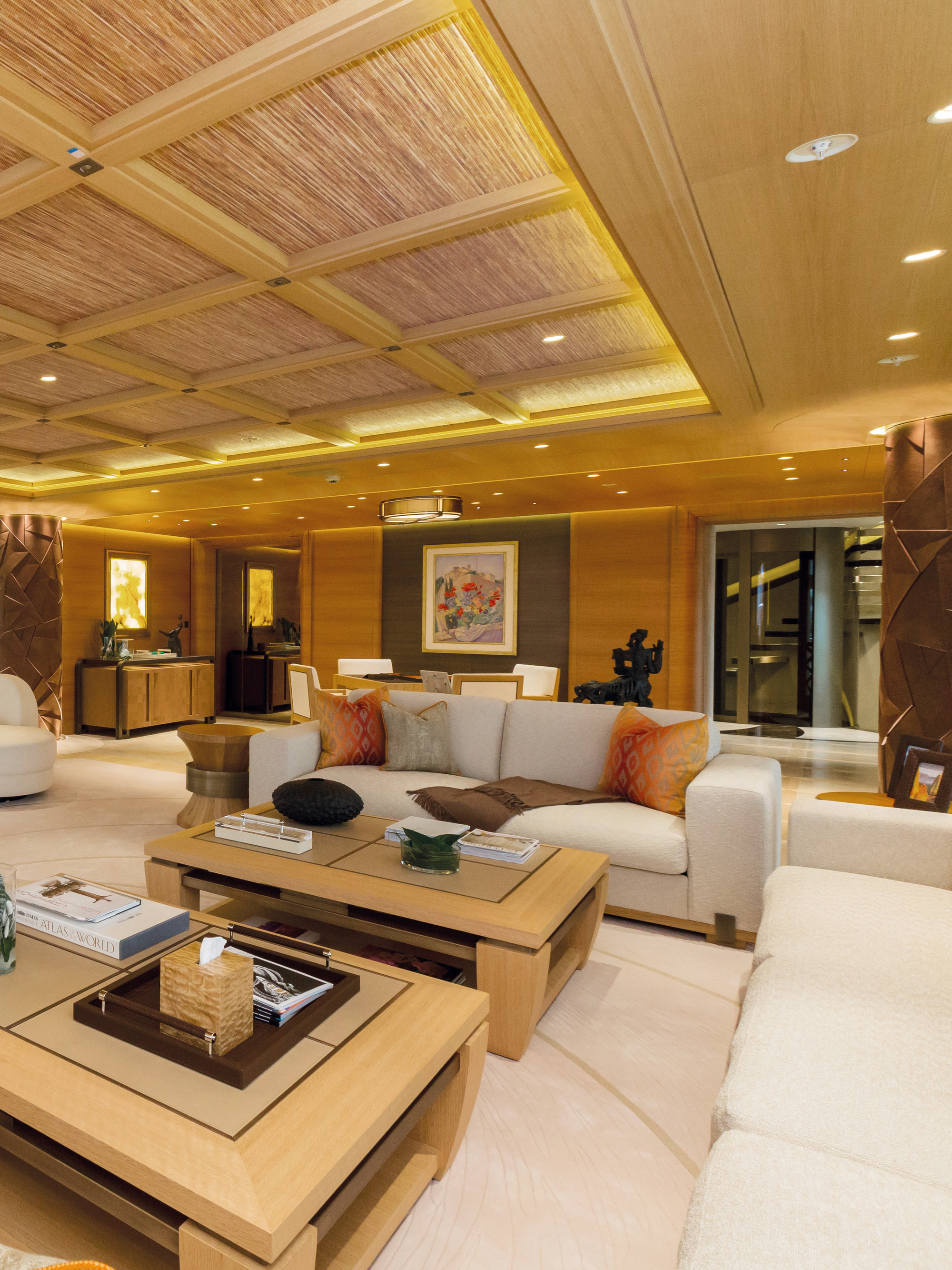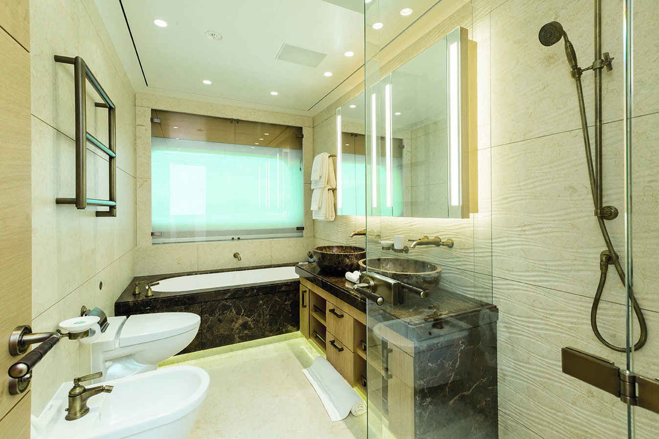 HERE COMES THE SUN has a very well-thought layout offering a lot of versatility and roominess. The yacht features a beautiful Master suite apartment and a VIP suite on the upper deck and 7 luxurious staterooms on the main deck. Four of these seven cabins can convert to 2 VIP cabins with ensuite and lounging areas. A staff cabin is also located on the bridge deck. - Master suite apartment looking forward and starboard side, walk through dressing room, 180 degree panoramic view, ensuite with shower. The master also features two sliding doors on each side of the suite to allow fresh air in the room (weather permitting and not in navigation). The Master suite features a custom made bed 250 x 210 cm. Owner's office - VIP suite on port side, featuring a King size bed, walk through dressing room and ensuite with shower. - 2 spacious VIP suites with lounging area, walk in dressing room and ensuite with tub and shower on main deck. These 2 suites can be partitioned so as to create 4 staterooms instead, each with ensuite facilities. All cabins feature king size beds. - 3 large guest staterooms with walk in dressing room and ensuite with shower on the main deck. All three cabins feature king size beds - Queen size bed staff cabin on the bridge deck with ensuite with shower.
