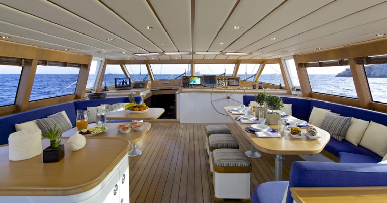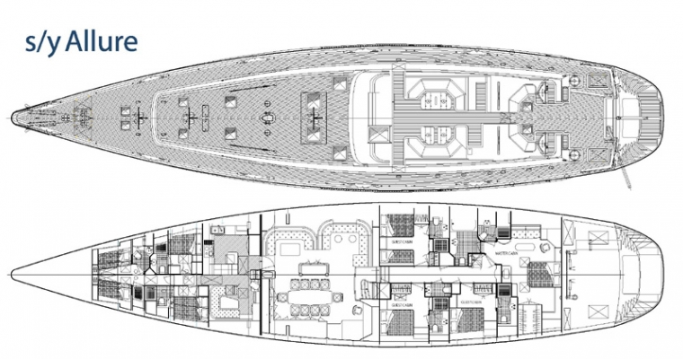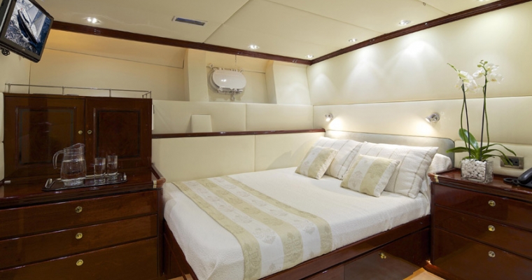 Guest Accommodation is located in Lower Deck: One Master cabin with double bed. Two cabins with a double bed in each. One cabin with one double bed, one single bed and a Pullman berth. All cabins are located in the lower deck and have en suite facilities.