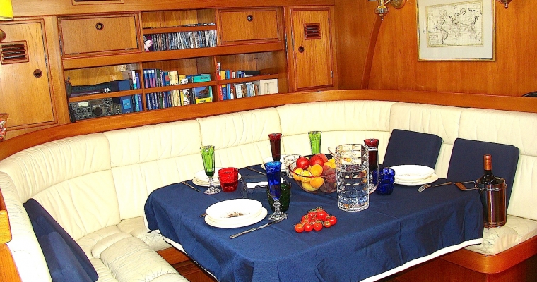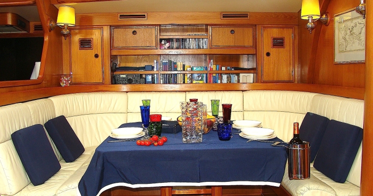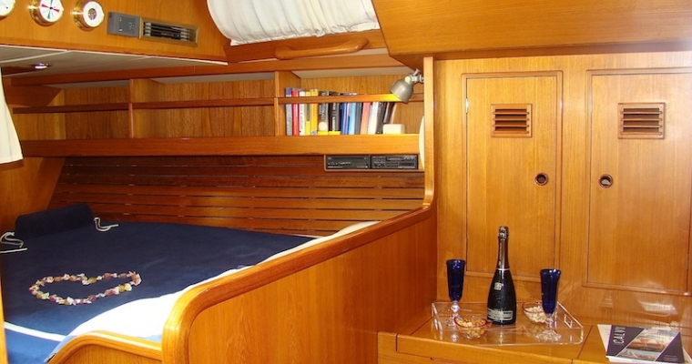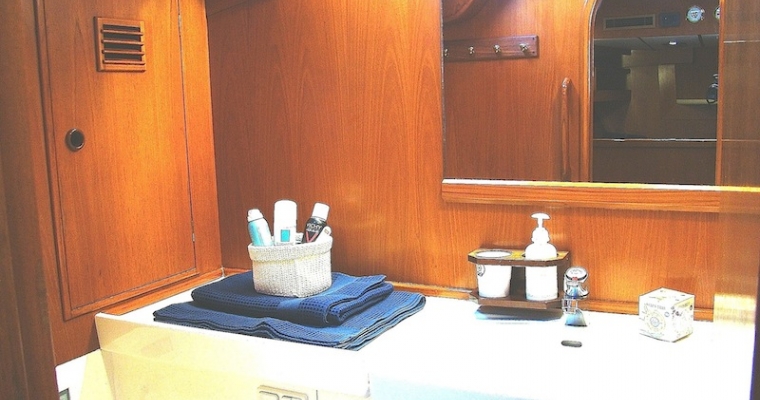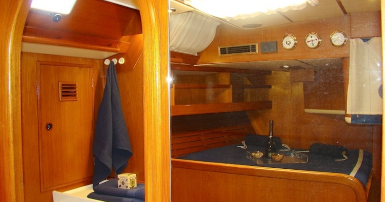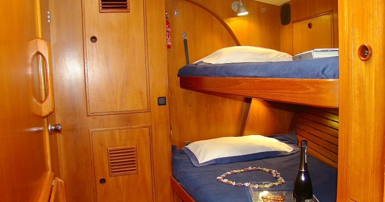 Master cabin aft on port with double bed, sitting table and shower room ensuite. Small twin cabin in companion way ideal for children with upper and lower berths. Two double twin cabins forward with upper and lower berths convertible to single cabin and sharing shower room. Forward cabin for crew with separate access to deck. Aft pilot berth for Captain.