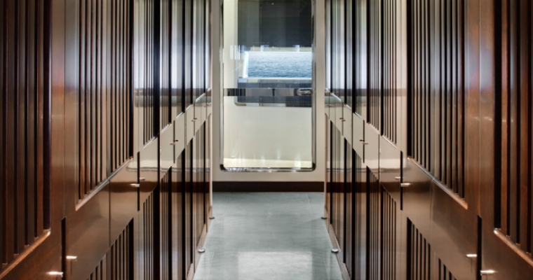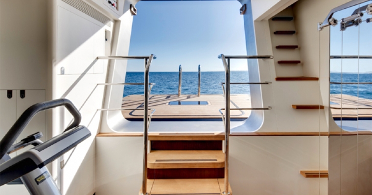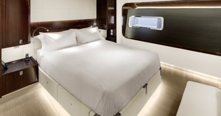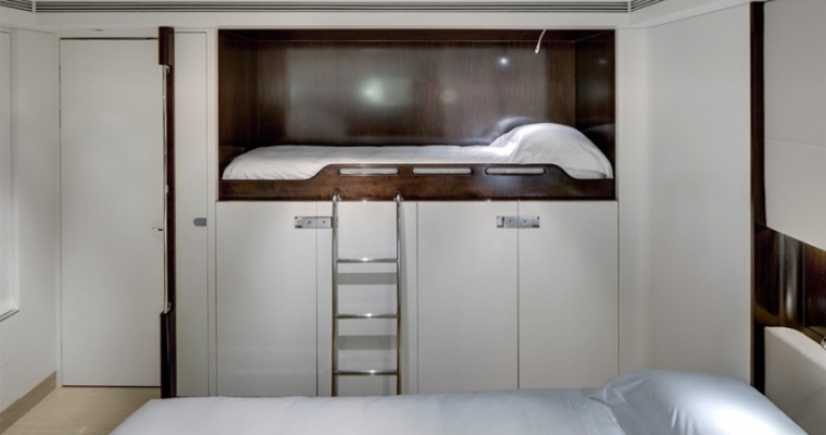 Full Beam master with lounge area and office , his and hers bathrooms Two double cabins with King Size beds One cabin with a double bed , a fixed single bed and a pullman. One cabin with two fixed single beds, an upper bunk single as well as a pull-out single best suited to a child. The gym within the midarrette contains 2 pullman single berths ideally suited to staff.