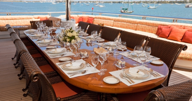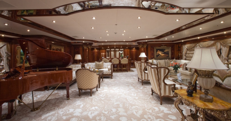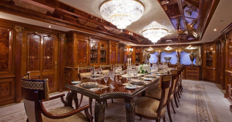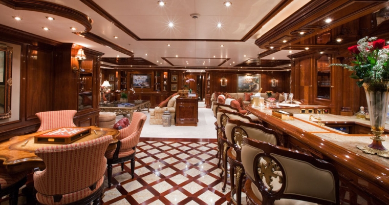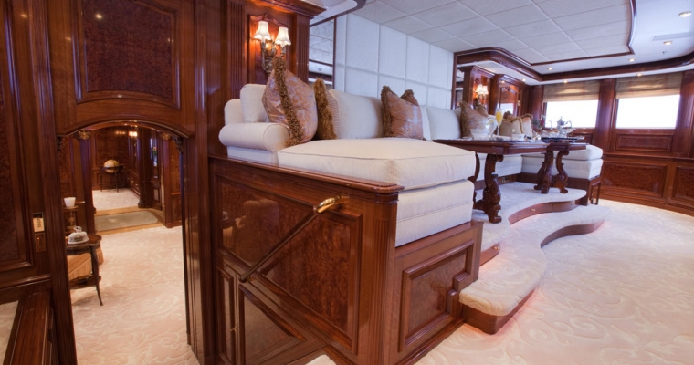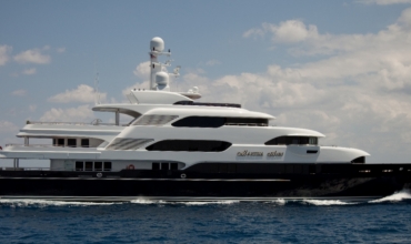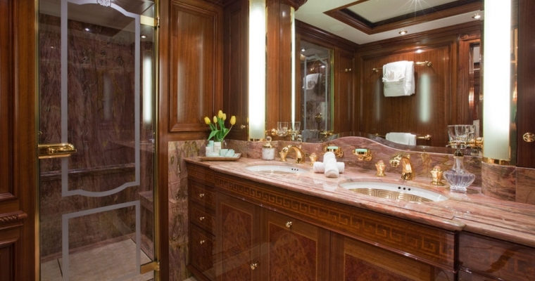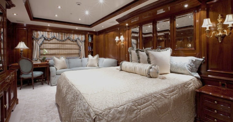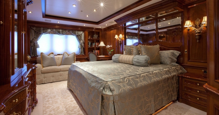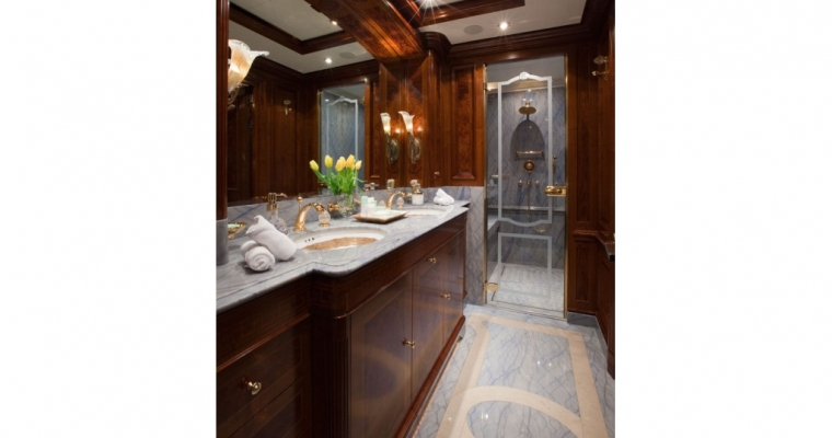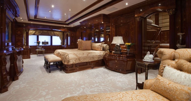 44 ft/13.41 Nautica / 2 x 350 hp (towed) 26 ft/ 7.9 m Royal Denship “limousine” /260 hp (seats 12 passengers / air-conditioned) 26 ft / 7.9 m Nautica / 2 x 150 hp 2 x Sea-Doo GTX Limited iS 260 waverunners, 1x Sea-Doo Spark 900 ACE, 2 x Seabobs, 2-1 x person kayaks, 1 x trimaran sailing dinghy, 1 x floating island, 1 x floating pool (with jelly fish net), assorted towable toys, snorkeling gear, extensive fishing gear, 1 x wake board, 1 x knee board, 2 x inflatable paddle boards, waterskis, various towables, 1 x 4 person Sea Sled, 1 x banana, 2 x 1 person donuts, beach toys, etc. SCUBA: 6 x sets / compressor 6 king staterooms + 1 staff cabin * At anchor stabilizers * Custom exterior deck lighting * Full-width Master Suite, Dining Salon, Skylounge forward area, Skylounge / Bridge Aft Deck * Interior volume (air-conditioned) is approximately 13,000 sq ft * Tenders / toys stowed in lazarette leaving all decks clear for guest entertainment * 6 wet bars: Main Deck, 2 x Skylounge / Bridge Deck, 2 x Sports Deck, Sun Deck * 3 large screen TV on outside decks: Skylounge / Bridge Deck, Sports Deck, Sun Deck * 7ft. 6in. headroom throughout * Crew stairway to service pantry on Skylounge and Guest Accommodation Decks * Circular glass elevator and dumb waiter from Guest Accommodation Deck to Sports Deck * Sports Deck: outside aft deck is 75ft in length ( 22.86m ) / separate Sun Deck forward on the top level * Jacuzzi /Swim Spa is 9 ft x 14 ft ( 2.7m x 4.26m ) * Kaleidescape throughout with tablet remote controls to access yacht\\\\\\\'s wide selection of movie & music libraries * State of the art systems including audio-visual with large screen TV’s throughout, WiFi, Ipod capable throughout, etc. * Spacious interior and exterior staircases on all levels * 15 built-in, adjustable chaise lounges on Sports Deck aft and sundeck ( + 2 in shade on Sundeck ) * Powder room on each deck: Main Deck, Skylounge /Bridge Deck, Sports Deck, Sun Deck * Bidet in each stateroom (not in staff cabin below)