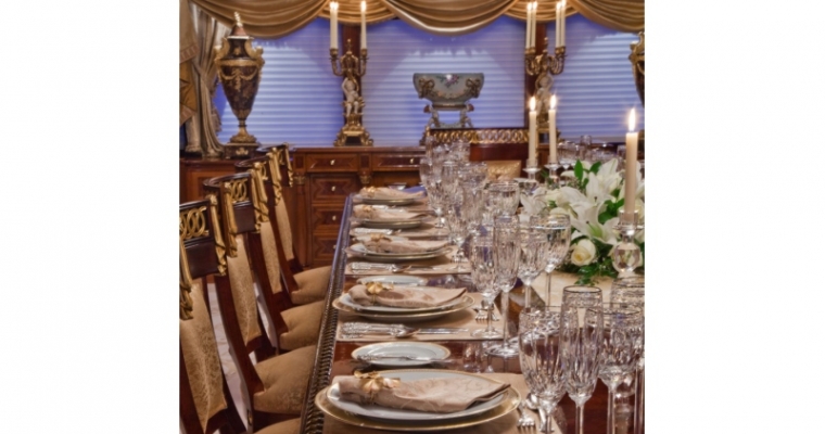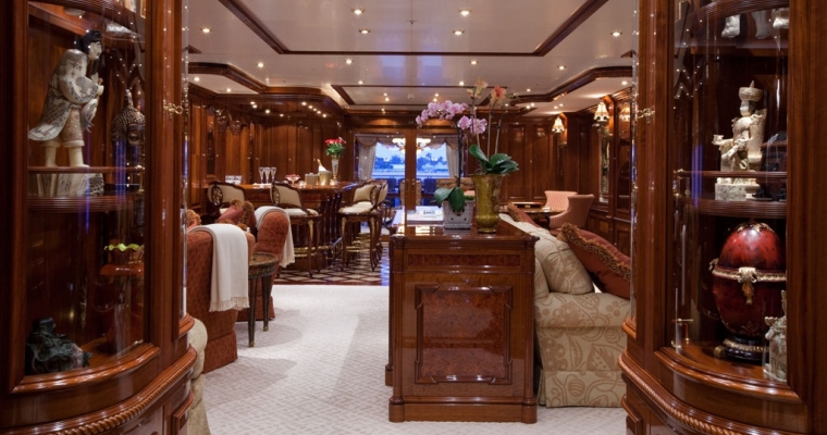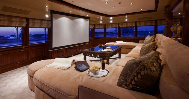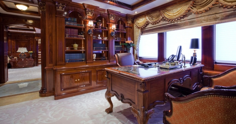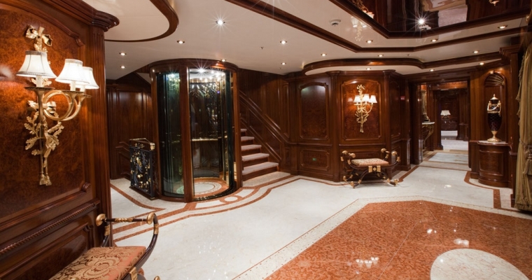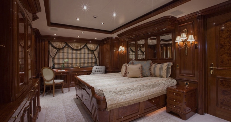 Kaleidescape central server with tablet remote control to access the wide selection of movie & music libraries Elevator from Guest Accommodation Deck to Sports Deck. 7 en suite staterooms KING. Full width Master Suite. Main deck Private library/study at entrance. Dressing room/closet forward to port. Sitting area with sofa/cocktail table and wet bar to port of bed. TV, lounge chair to starboard with built-in cabinets and desk His/hers bathrooms with central Jacuzzi tub Hers with vanity, dressing room/closet His with shower, vanity, closet Master lounge. Split level forward area of master suite with large sofa, *single Pullman bed to port*, occasional tables, TV. Access to exterior deck LOWER DECK – GUEST ACCOMMODATION DECK Central lobby with access to circular glass elevator, mini-refrigerator/service bar Crew service corridor from crew’s quarters to lobby provides unobtrusive access KING + Pullman. Aft port. Ensuite with double vanity sinks/shower Dressing room/closet. Sofa, desk, arm chair / breakfast table. TV KING + Pullman. Aft starboard. Ensuite with double vanity sinks/shower Dressing room/closet. Sofa, desk, arm chair / breakfast table. TV KING. Forward port. Ensuite with double vanity sinks/shower. Dressing room/closet. L-shaped corner sofa, desk to port. TV KING. Forward starboard. Ensuite with double vanity sinks/shower. Sofa, desk. TV STAFF CABIN: 3 singles (including upper/lower). Ensuite with shower. Closet, desk. TV NOTE: Suitable for children, nannies, supernumeraries KING. VIP STATEROOM / SKYLOUNGE (bridge) DECK. Amidships/forward of Skylounge Ensuite with shower/double vanity sinks. Sofa, vanity, arm chair, occasional table. TV Dressing room with mirrored closet