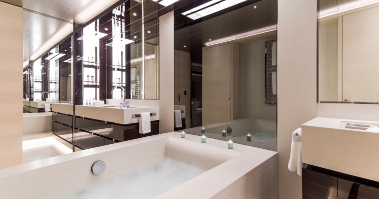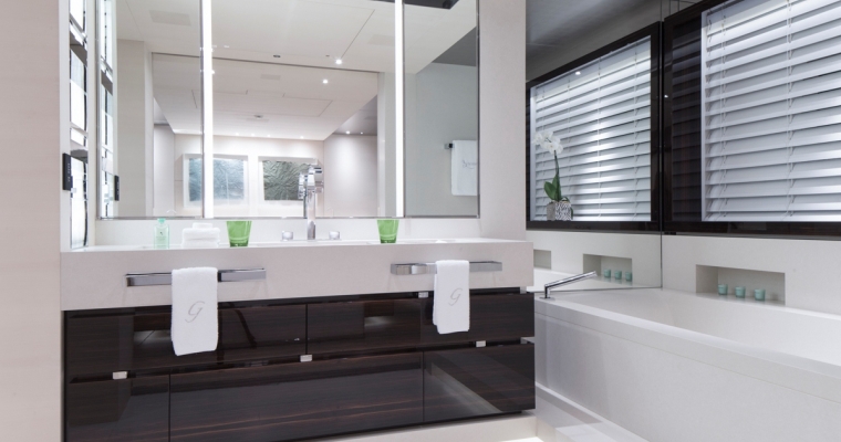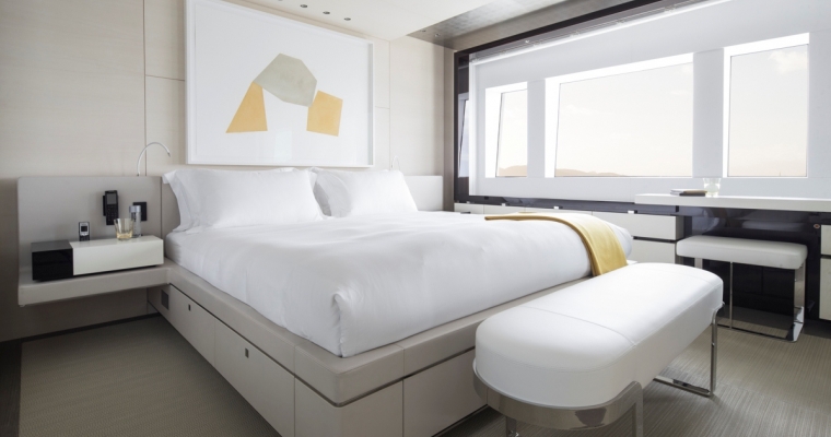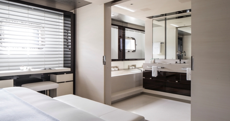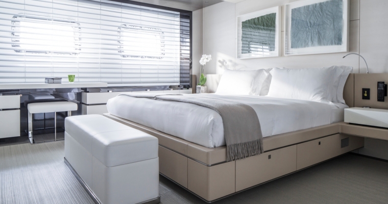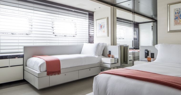 Superb accommodations for 12 guest in 7 luxurious cabins Main deck: Full beam master with king bed, His & Hers en suites each with own shower & bidet. Central tub & underfloor heating. 2 safes 2 x VIP cabins with European king beds, en suite w shower & bidet Lower deck: 2 x double cabins with European king beds,en suite w shower, tub & bidet 2 x twin cabins with 1 x Pullman berth in each. En suite w shower Interconnecting door between each double cabin and single cabin to allow conversion to a family suite Safes: 1 x safe in each guest cabin Bed dimensions: Master: 184cm x 215cm (74.4" x 84.6") VIP cabins: 170cm x 200cm (67" x 78.75") Double cabins: 170cm x 190cm (67" x 74.8")