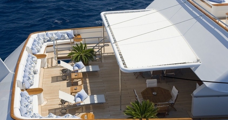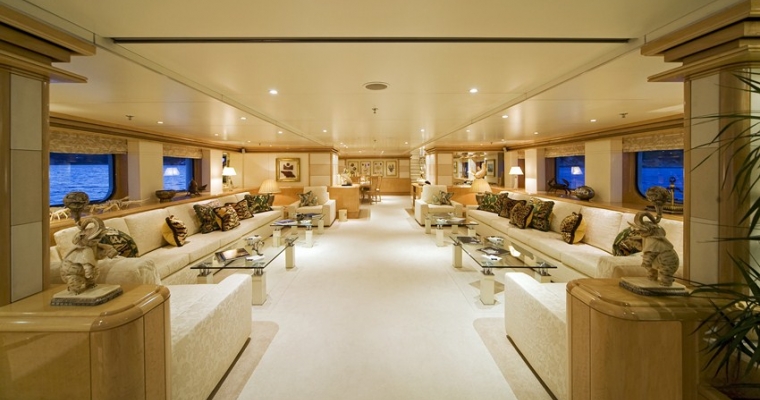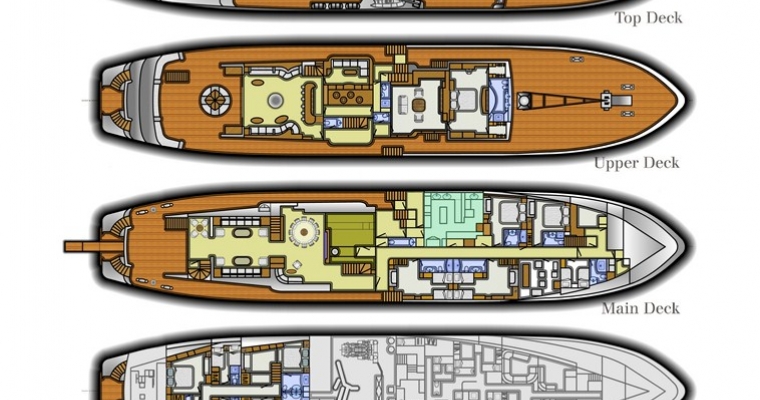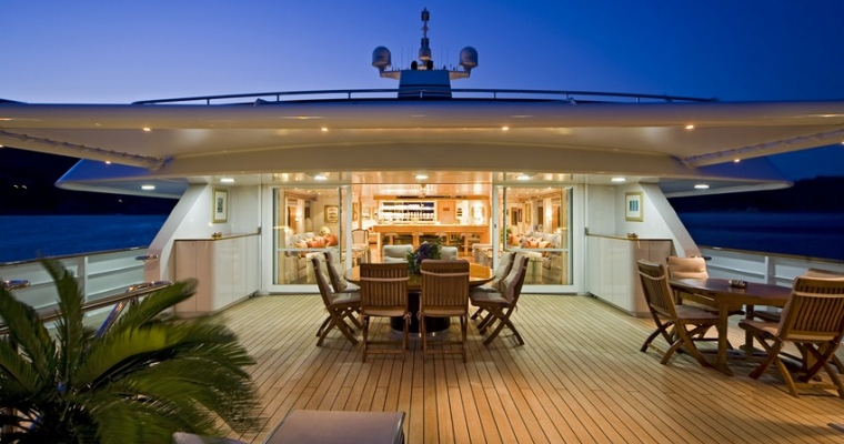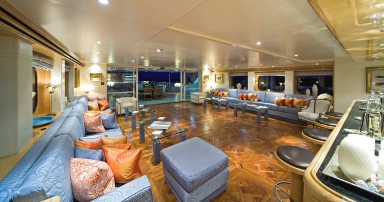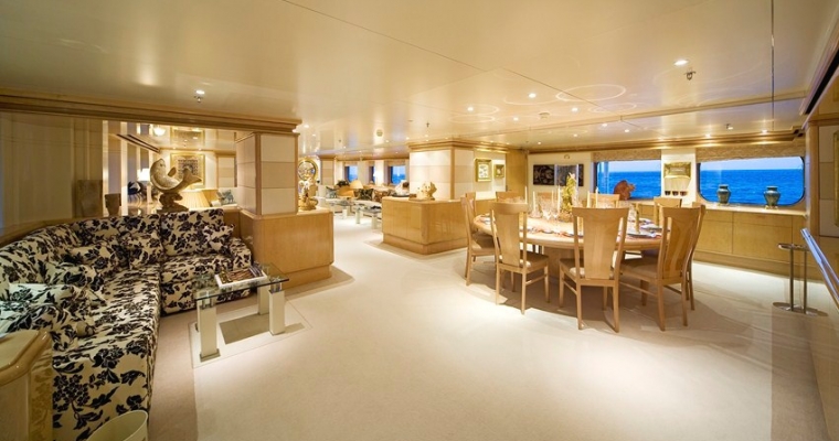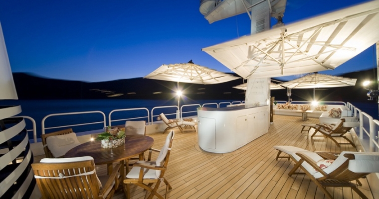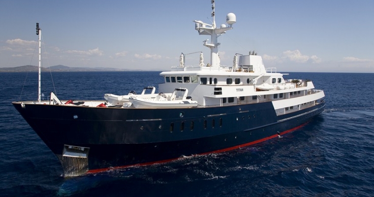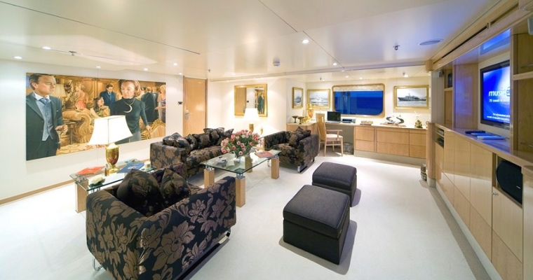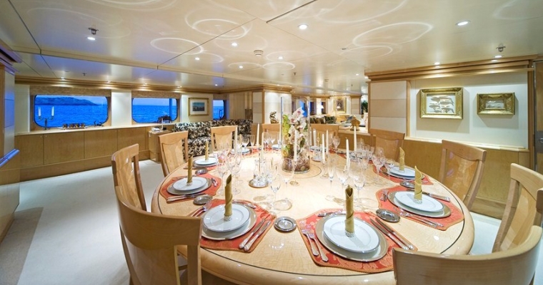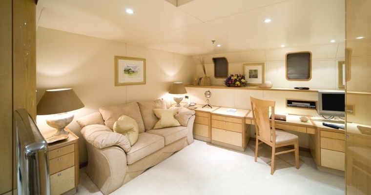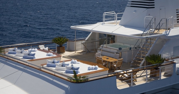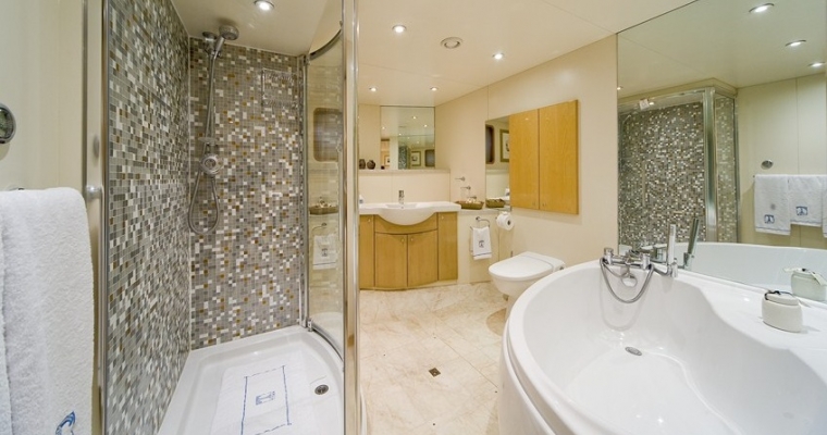 TITANIA has guest accommodation in 7 fantastic cabins, including two master suites, one on the main deck with a private jacuzzi and the other is an impressive newly installed second Master Suite on the upper deck with a panoramic sea view.she also has a VIP Cabin on the bridge deck plus four double cabins on the lower deck. There is an elevator going from the lower deck to the sun deck. She has a fully equipped gym on sun deck with fitness instructor and a beach club with sauna which can be converted into a night club. There is also a spa with massage facilities and a huge array of water toys with a very service orientated, charter friendly crew.