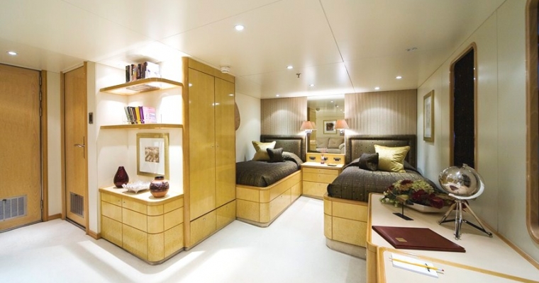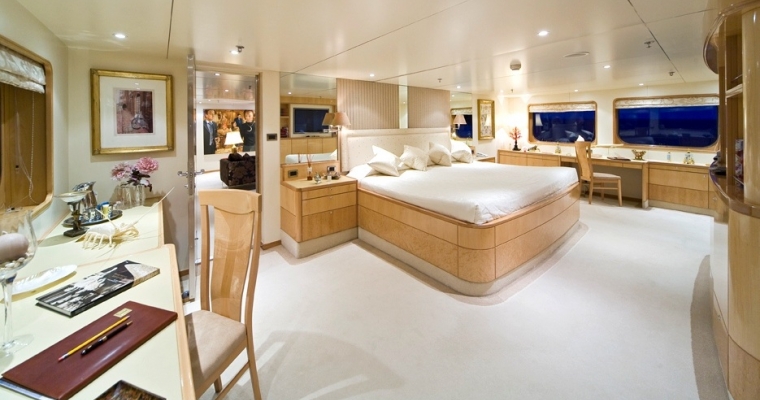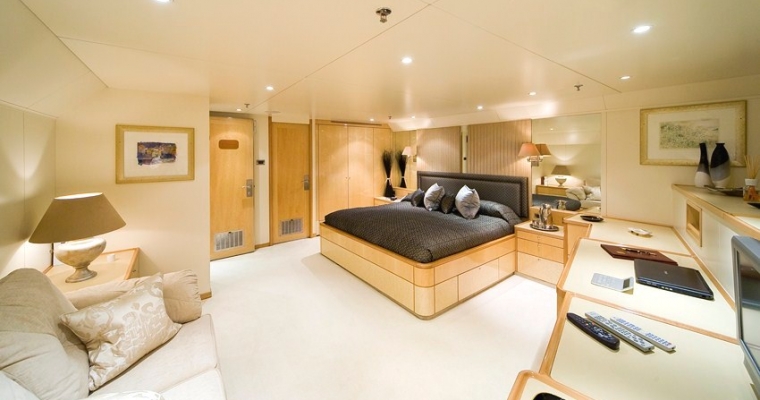 TITANIA has two master suites. One master suite is on the main deck forward (130m2) with private jacuzzi.The second master suite is on the upper deck forward with a panoramic view. VIP Cabin on Bridge deck Four double cabins on lower deck with king beds. The two forward have Pullman bunks (1700 x 750 mm). There is an elevator going from the lower deck to the pool deck.