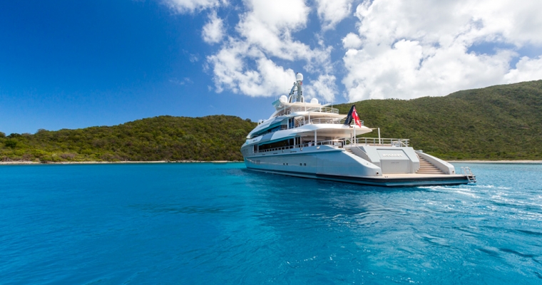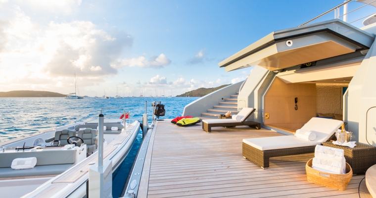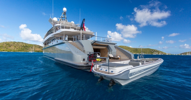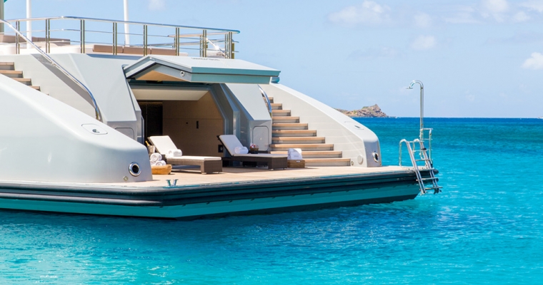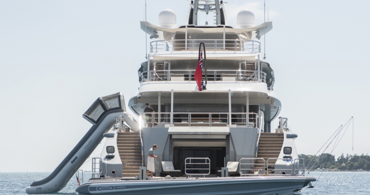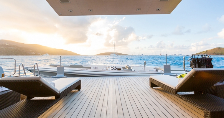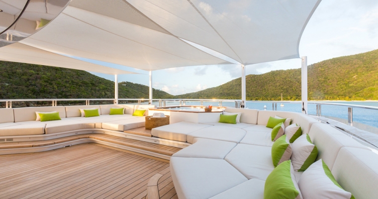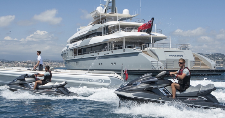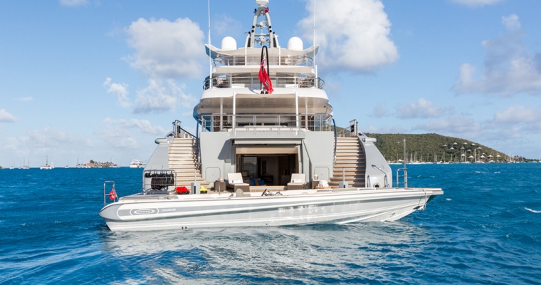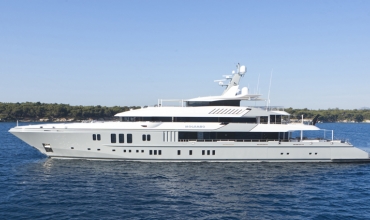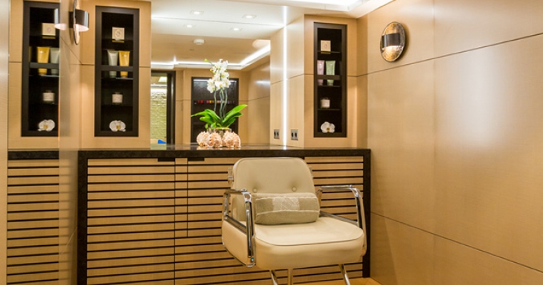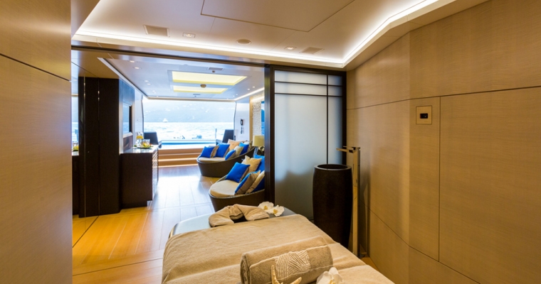 Mogambo is one of the latest deliveries from the Nobiskrug shipyard in Germany. Exterior and interior design by Reymond Langton result in a sleek and calm interior achieved with simple lines and details, flooded with light from full height windows and an athletic exterior full of spirit. An elevator gives access from the cabin deck through to the bridge deck. The main aft deck of Mogambo is very spacious with plenty of seating and sunbathing area and a outdoor dining area just aft of the main saloon entrance. There is a fold down television that swivels 180 degrees for both seating and dining viewing. Entering the main saloon from the main deck aft is direct to the formal sitting area for Mogambo. The main deck bar is in the middle section of the salon to port and made from ebonised walnut with a recessed marotte panel at the front. The main dining table is just forward and is diamante veneer with a high/low light box. Forward to starboard is the main lobby with access to the bridge deck and cabin deck with a 3 person lift. A day head with Japanese styled toilet is here for the main deck. The sky lounge is aft and has a flat screen TV with full surround sound and through sliding doors is the bridge deck outside dining for up to 14. Mogambo was back at the shipyard winter 2013/2014 where this dining area has been upgraded to now include a series of sliding doors enabling the area to be completely closed off from in the event of undesirable weather. Further aft is some outside lounge chairs which can be covered with awnings if needed. The sundeck has an outdoor cinema, gym, Jacuzzi for 15 people and bar… an area catering to all guests and clearly the most used area of the yacht. From the main aft deck is access to the swim platform which gives access to Mogambo’s beach club. A perfect place to relax, have a steam shower, enjoy a massage or use the hair salon.