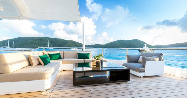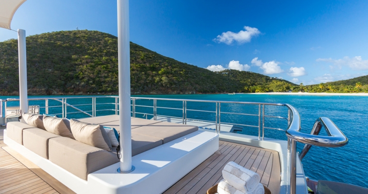 Forward is the master suite which is full beam and has an office with balcony ideal for breakfast or a chilled bottle of champagne. The master bedroom has a king sized bed, full A/V system and a walk through, his/hers bathroom with separate toilet and walk-in wardrobe. A large, glass walled rain shower and there is an extra-wide bath tub for 2. The surfaces in the master bathroom are antique brown granite. The lower cabin deck has four guest cabins all with queen beds and full ensuite facilities. All have showers except the aft port which has a bathtub. This aft port cabin also has a pullman for an additional person. The aft starboard cabin is convertible into a twin or double cabin. All cabins have access to the kaliedescape VOD system and satellite TV via the iPad controlled Crestron system. On the bridge deck is the VIP cabin which, like the starboard aft cabin, is convertible into a twin or queen sized bed with full ensuite facilities. Opposite to this cabin is another convertible twin/double cabin (new 2016)