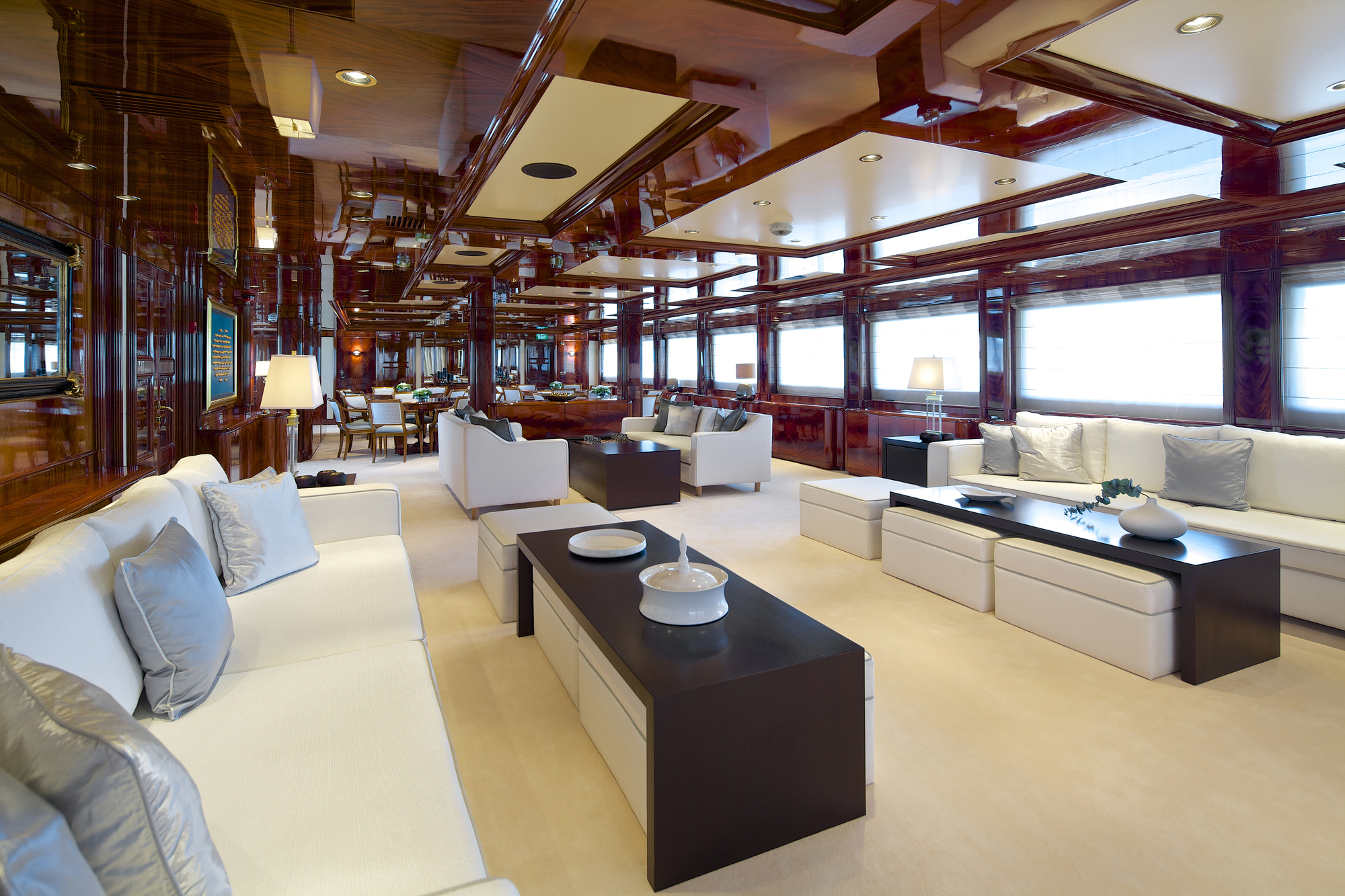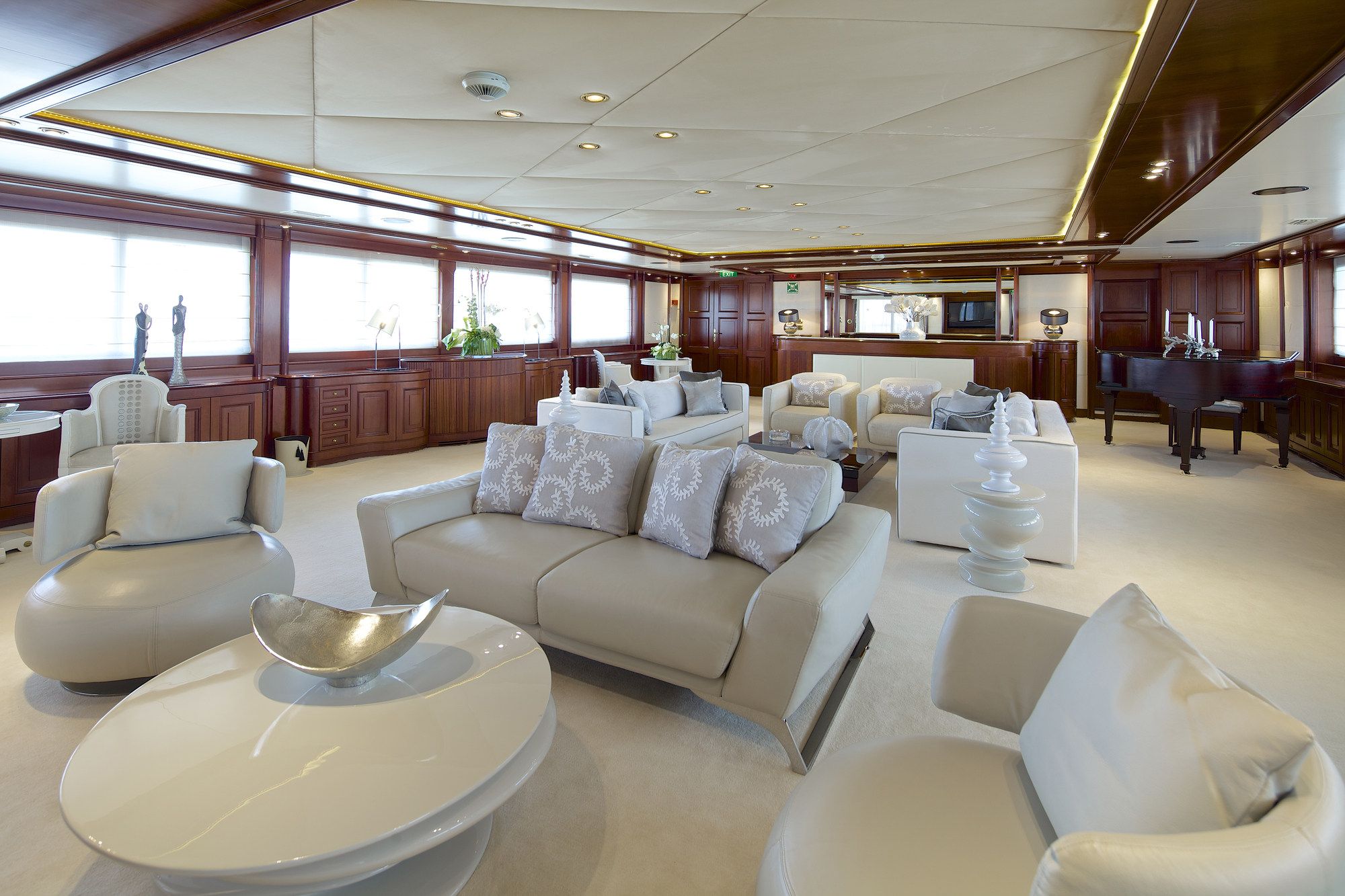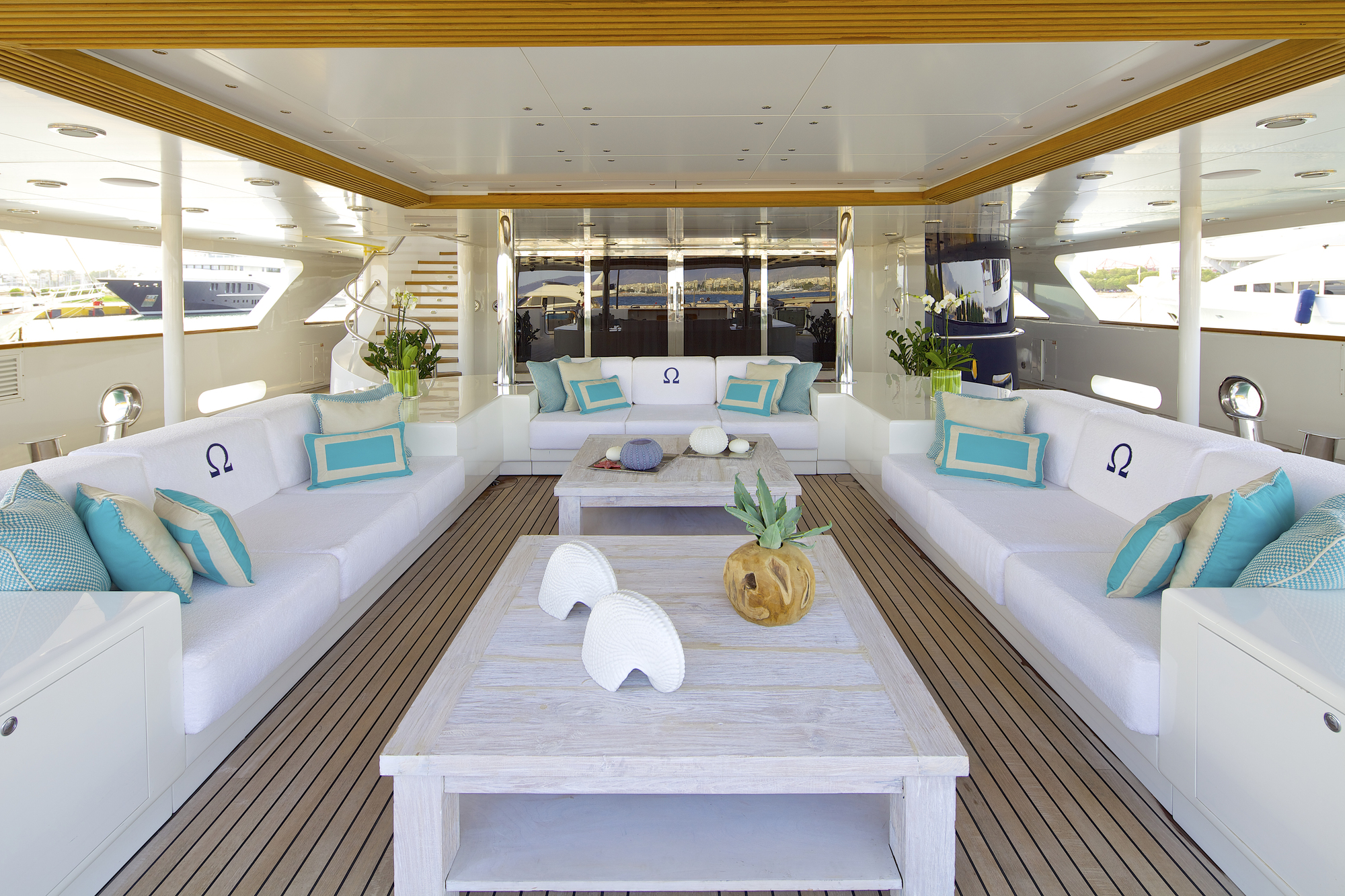 With harmonious lines and concave shapes defining the exterior of superyacht O’MEGA, it’s no surprise that she’s instantly recognisable when out on the water. Finished in arctic white, the outdoor living spaces are largely to be found towards the aft deck and on the upper deck. With comfortable furnishings abounding to provide numerous options for enjoying the climate whilst away on charter, there are also plenty of alfresco dining spaces conveniently situated underneath partial shading. Committed to providing a range of possibilities for such large charter parties, Studio Vafiadis have equipped the exterior of O’MEGA with a handful of lounge-like areas which can be easily serviced by the attentive. What’s more, with a retractable swim platform extending off the transom, charterers are also able to easily access the water to enjoy the tenders and toys on offer. INTERIOR DESIGN The stunning interior of O’MEGA is largely inspired by classic aesthetics, with a number of elegantly crafted soft furnishings allowing guests to unwind and socialise in the utmost comfort. With fabrics coming from the collections of Rubelli, Lelievre and Scardigli, charterers are sure to feel inspired by their surroundings in both the communal and guest spaces. Indeed, from the spacious main salon through to the dedicated dining room and the VIP salon, there is a sense of sophistication which helps to establish an appropriately luxurious ambience. As something of a counterpoint to such glamour, the home cinema which was integrated during the refit in 2011 is composed of modern fixtures and the latest in visual and audio systems. Getting between such impressive spaces is just as much of an awe-inspiring experience, with intricate marble flooring and engaging pieces lining the corridors. Other standout features which grace the interior of superyacht O’MEGA include fluted pillars, original oil paintings, and some of the most impressive dark mahogany joinery to be found on any superyacht.