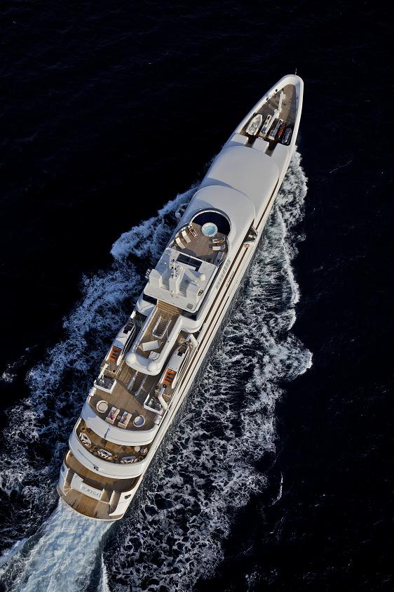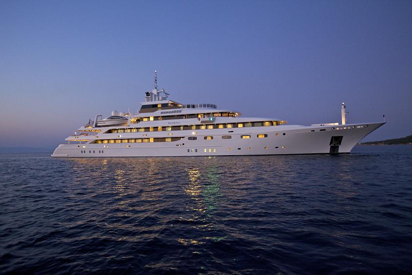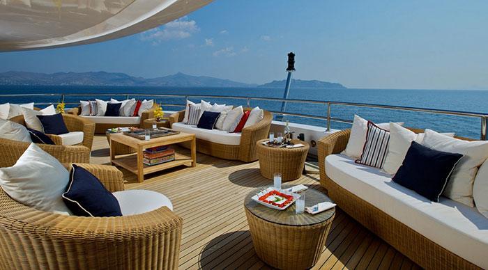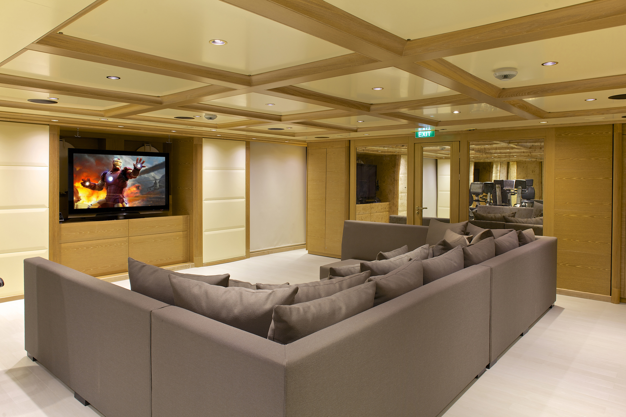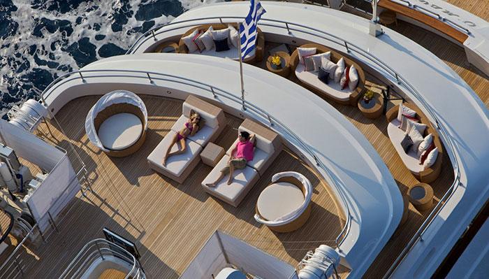 With harmonious lines and concave shapes defining the exterior of superyacht O’MEGA, it’s no surprise that she’s instantly recognisable when out on the water. Finished in arctic white, the outdoor living spaces are largely to be found towards the aft deck and on the upper deck. With comfortable furnishings abounding to provide numerous options for enjoying the climate whilst away on charter, there are also plenty of alfresco dining spaces conveniently situated underneath partial shading. Committed to providing a range of possibilities for such large charter parties, Studio Vafiadis have equipped the exterior of O’MEGA with a handful of lounge-like areas which can be easily serviced by the attentive. What’s more, with a retractable swim platform extending off the transom, charterers are also able to easily access the water to enjoy the tenders and toys on offer. INTERIOR DESIGN The stunning interior of O’MEGA is largely inspired by classic aesthetics, with a number of elegantly crafted soft furnishings allowing guests to unwind and socialise in the utmost comfort. With fabrics coming from the collections of Rubelli, Lelievre and Scardigli, charterers are sure to feel inspired by their surroundings in both the communal and guest spaces. Indeed, from the spacious main salon through to the dedicated dining room and the VIP salon, there is a sense of sophistication which helps to establish an appropriately luxurious ambience. As something of a counterpoint to such glamour, the home cinema which was integrated during the refit in 2011 is composed of modern fixtures and the latest in visual and audio systems. Getting between such impressive spaces is just as much of an awe-inspiring experience, with intricate marble flooring and engaging pieces lining the corridors. Other standout features which grace the interior of superyacht O’MEGA include fluted pillars, original oil paintings, and some of the most impressive dark mahogany joinery to be found on any superyacht.