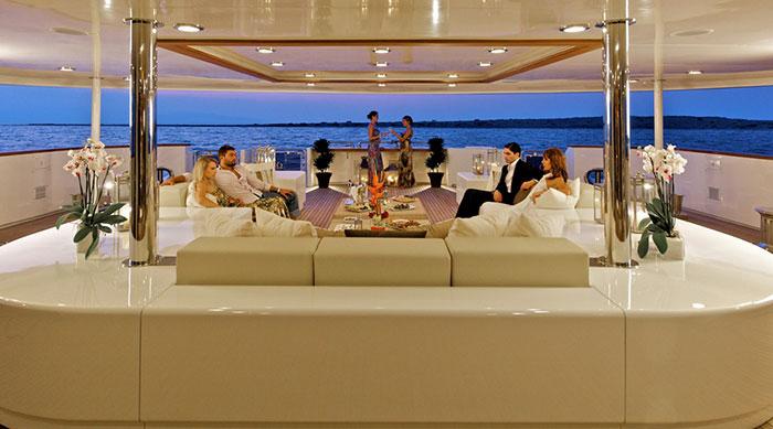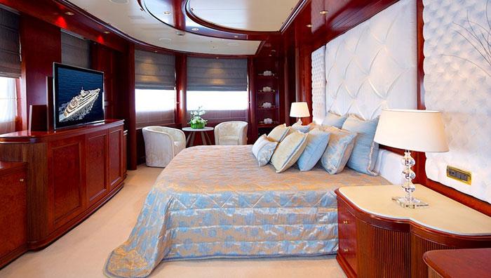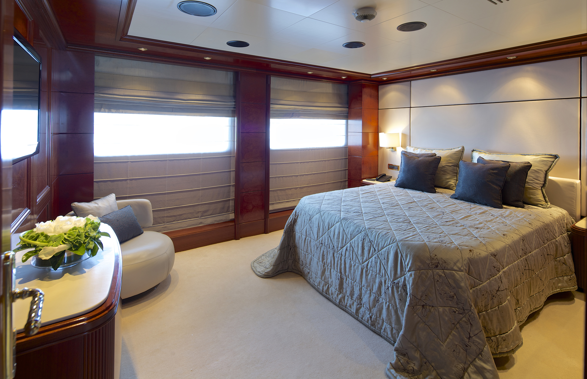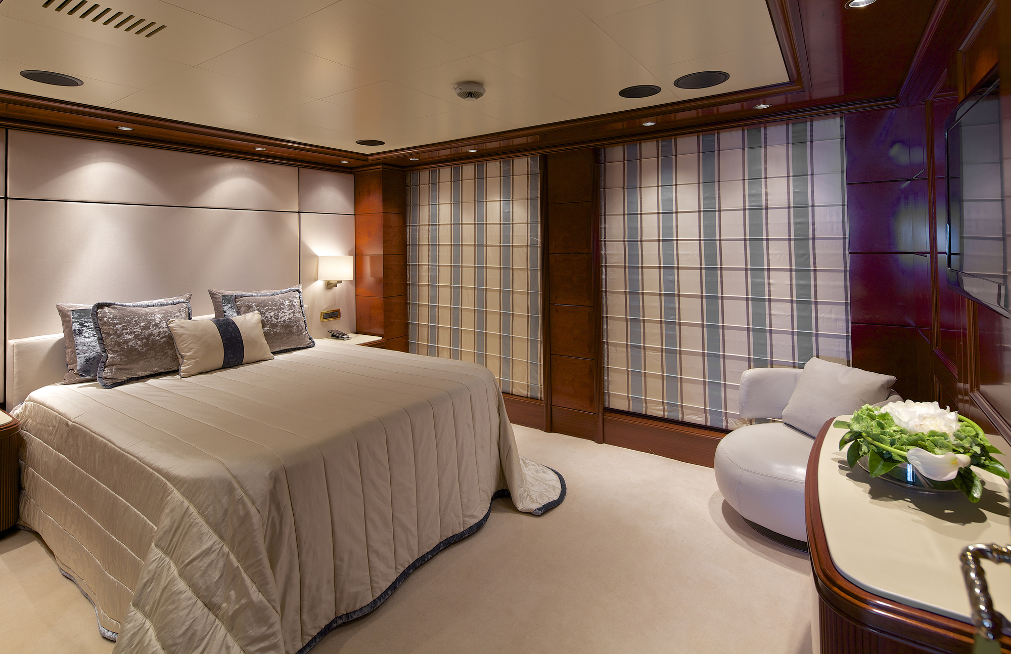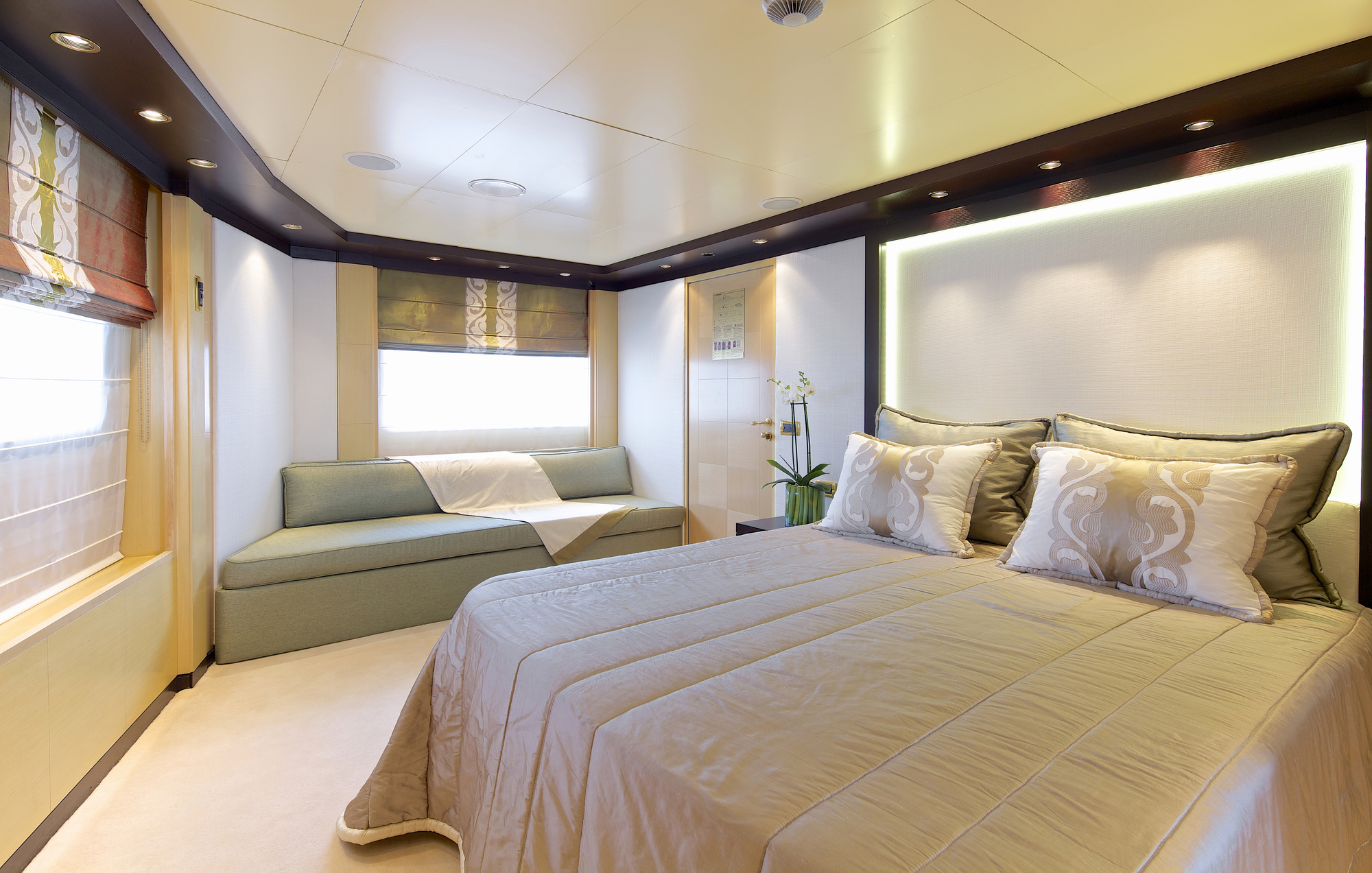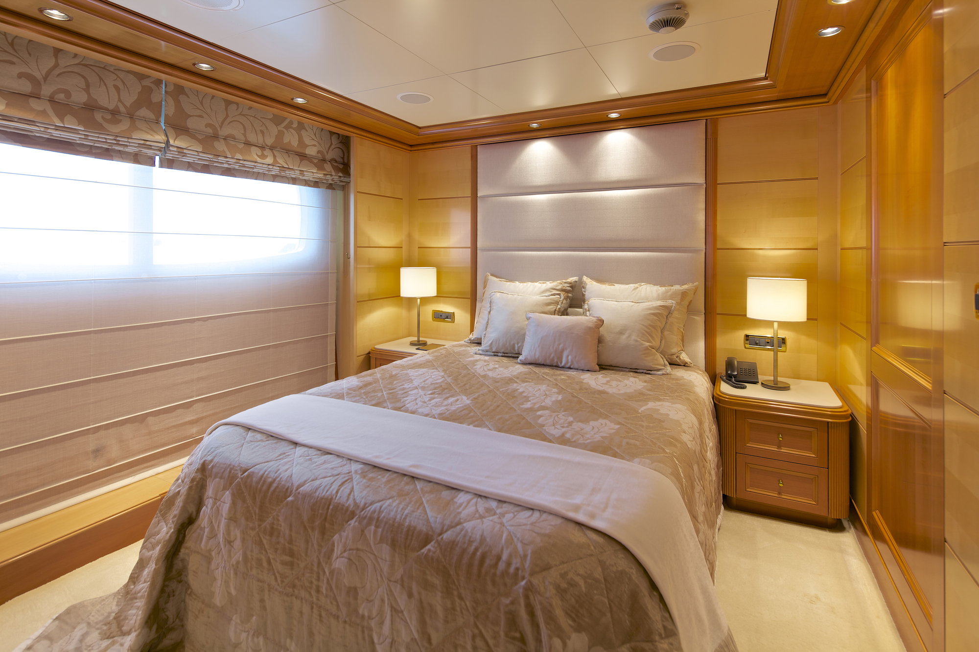 As such a highly voluminous vessel with accommodation for up to 30 guests, it should come as no surprise that motor yacht O’MEGA is complete with 14 exceptional staterooms. The most impressive of these suites is no doubt the master cabin situated forward on the upper deck. Offering panoramic views through semicircle windows which face forward, charterers occupying this cabin are able to wake up in only the most appropriate fashion Finished with yellow and white onyx, the bathroom adjacent to the suite forms the perfect complement to such an expertly designed stateroom. The 5 VIP cabins which are also available on O’MEGA are just as well-appointed. The VIP stateroom found on the bridge deck, for example, offers similarly outstanding views, and is only a little smaller than the master. The additional 4 doubles and 5 twins are superbly finished, with entertainment systems and comfortable fixtures populating the spaces.
