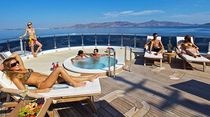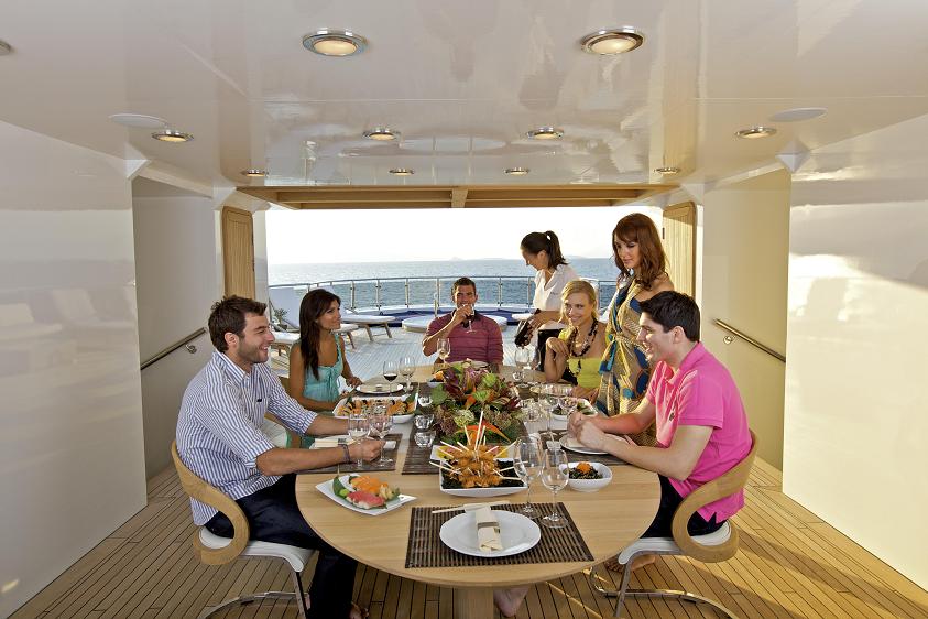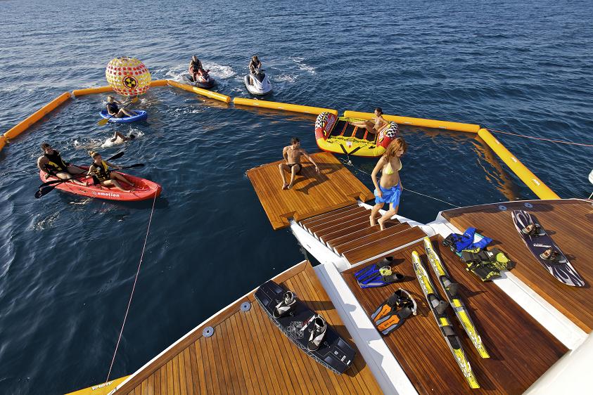 Tenders & Toys: 2 x 9.2m Fassmer enclosed life boat/limousine tender with air conditioning, audio equipment and leather upholstery for 22 guests (one tender in use at a time) 1 custom 6m RIB for 7 guests 1 x Jet Ski Sea Doo GTX 260 limited edition 2 Guests 1 x Jet Ski Sea Doo RXP-X 260 2 Guests 1 x Jet Ski Kawasaki ZXI 900 2 Guests Water Skis (Mono/Double/Children's) Tows 2 x Nuclear Globes Wakeboards Snorkeling Equipment Scuba Gear (4 sets) and Compressor Audio Visual Equipment and Deck Facilities: Cinema room with 65 inch screen seating 8 guests in La-Z-Boy armchairs Wii/Playstation 3 + games CD/DVD Library Plasma screens throughout Dolby stereo surround sound + DVD + CD in all cabins Retractable Swimming Platform Jacuzzi Beauty Salon/Massage Room Communications: High Speed Wireless Internet through VSAT broadband service, Inmarsat C, Inmarsat F77, VHF-DSC, GMDSS, Navtex Receiver