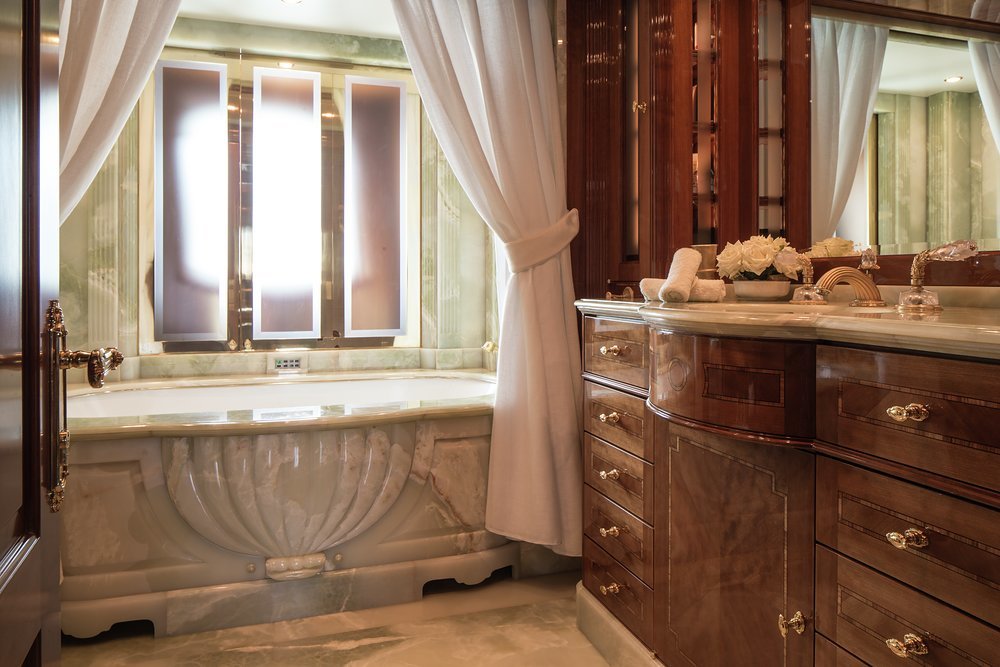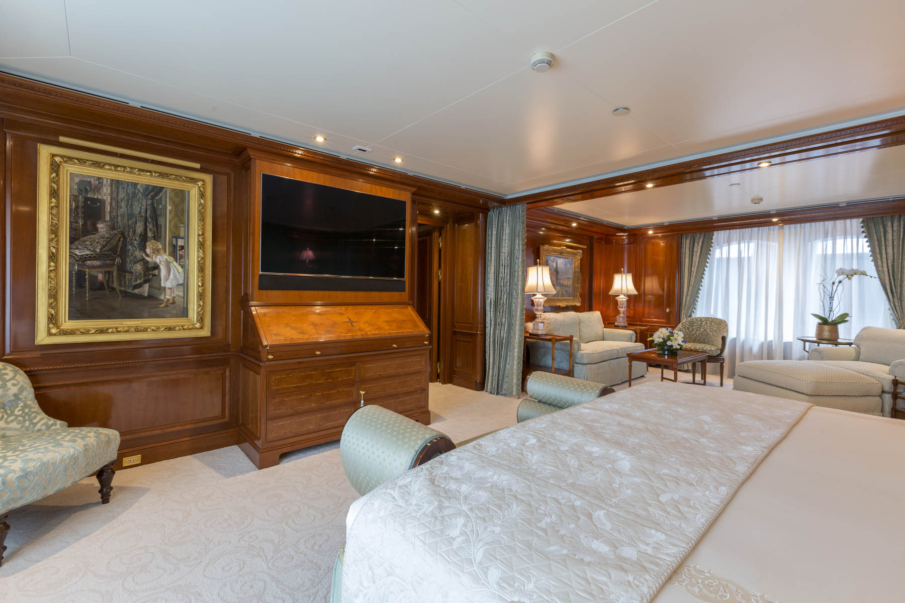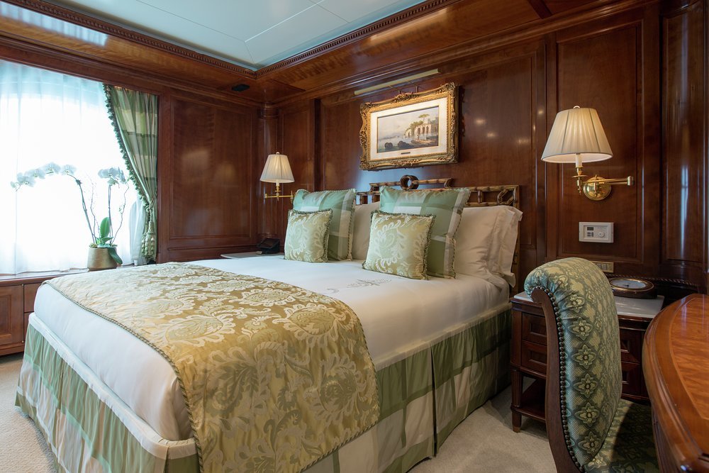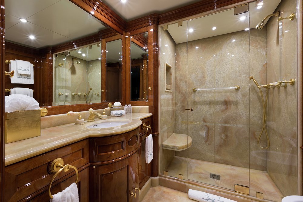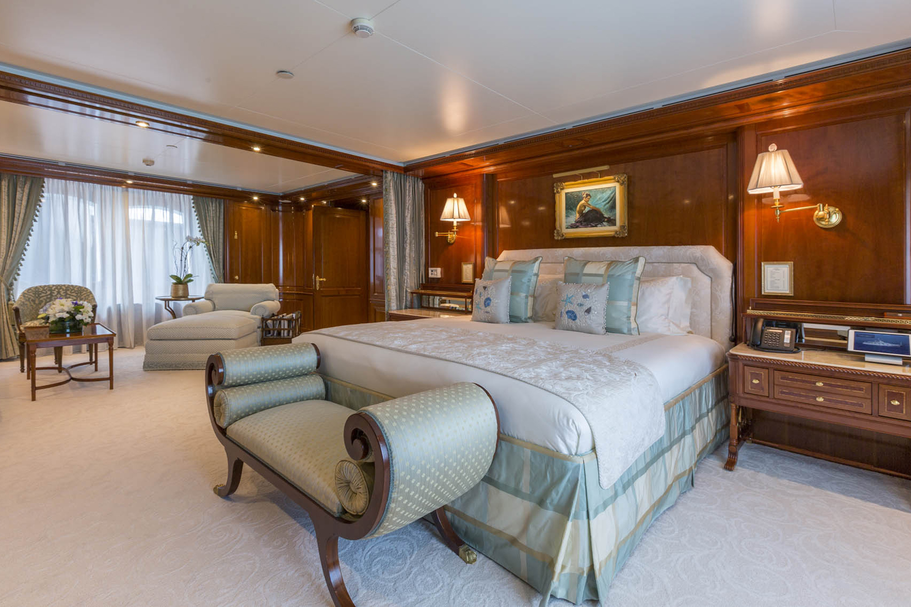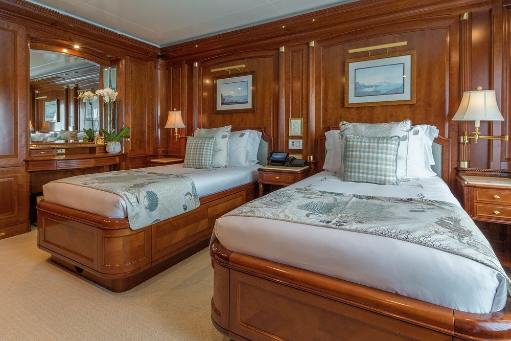 Master double with study, day head and shower. King size bed and his and hers bathrooms. Hers offers Jacuzzi tub with shower, bidet and toilet and his to port with shower, bidet and toilet. Forward again are large his and her wardrobes. VIP just aft of the Master, to port, offering a large walk-in wardrobe, queen size bed, bath with tub and shower, bidet and toilet on the main deck level with panoramic windows. Three double staterooms and one twin stateroom each with shower, bidet and toilet. a single sofa bed in the study. All cabins have a desk with mirror and seating. Bathroom products are Bulgari.