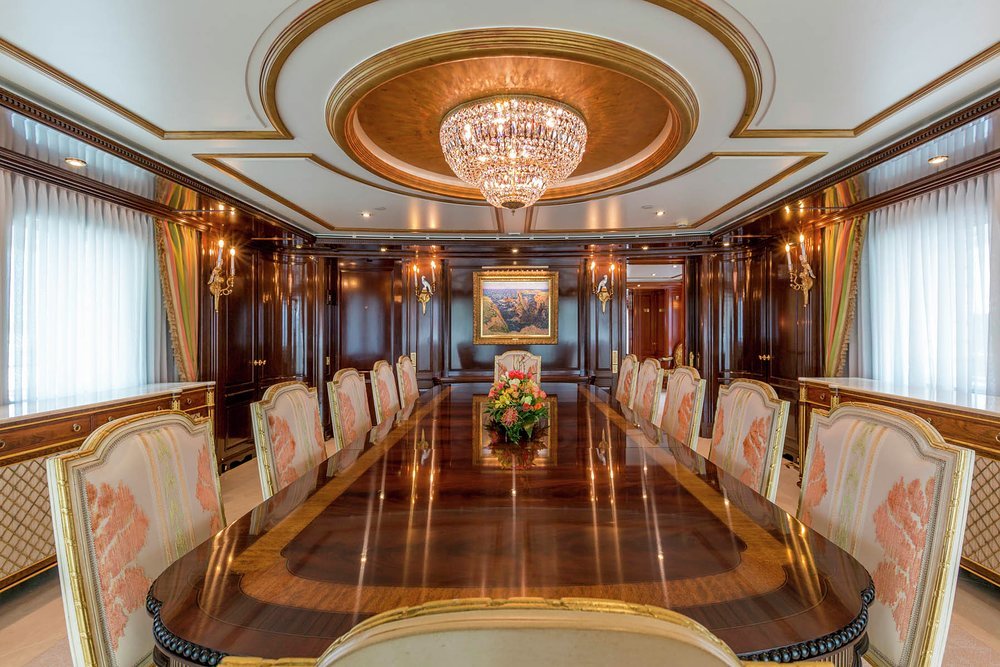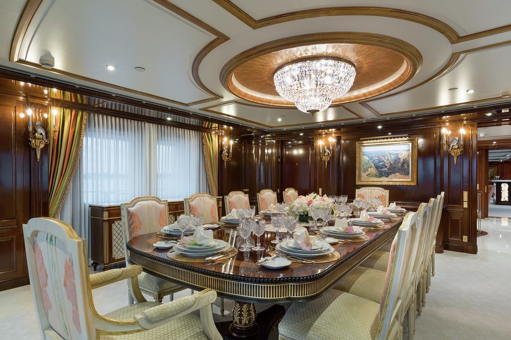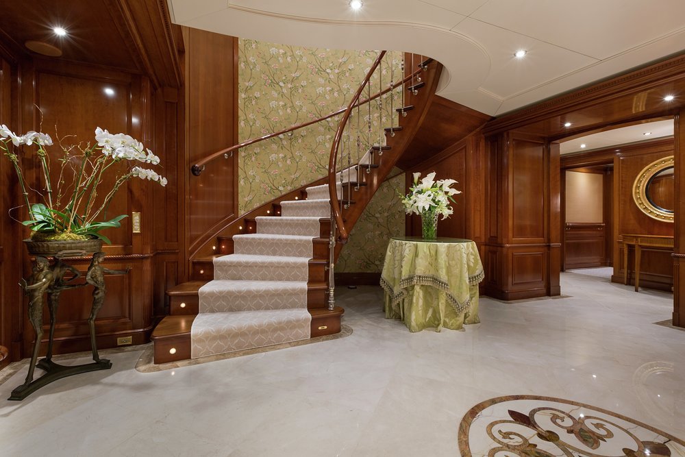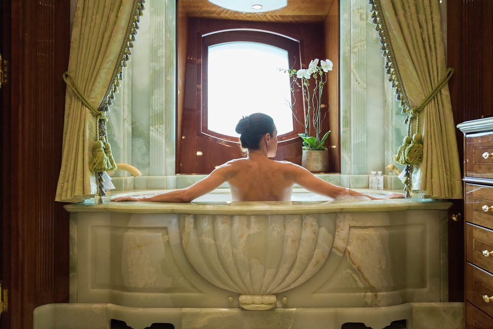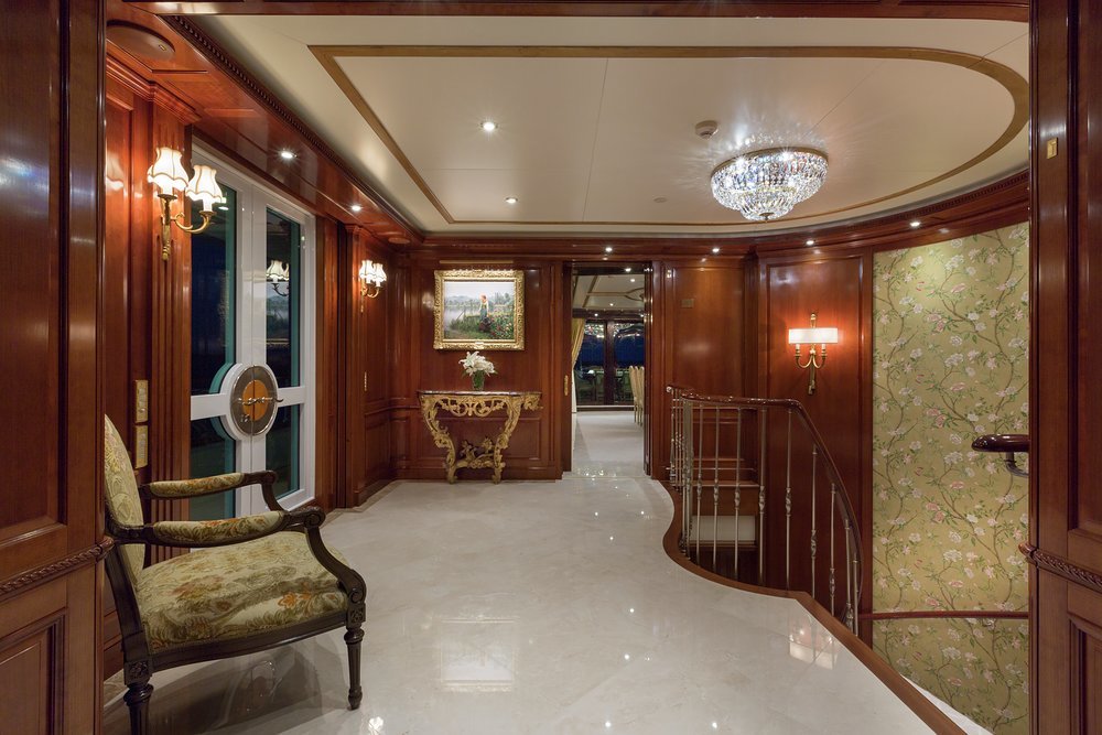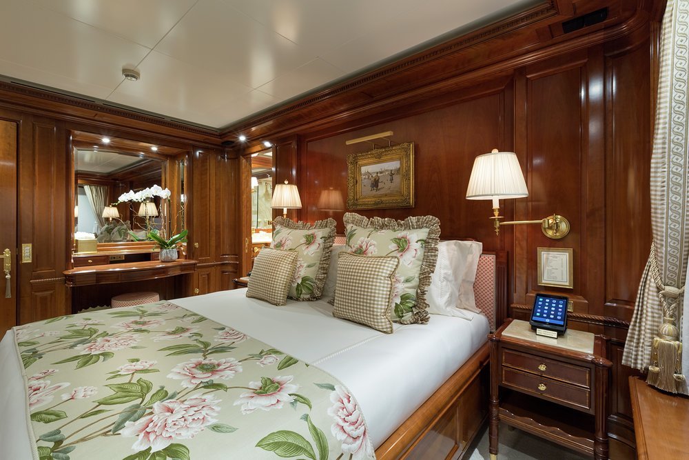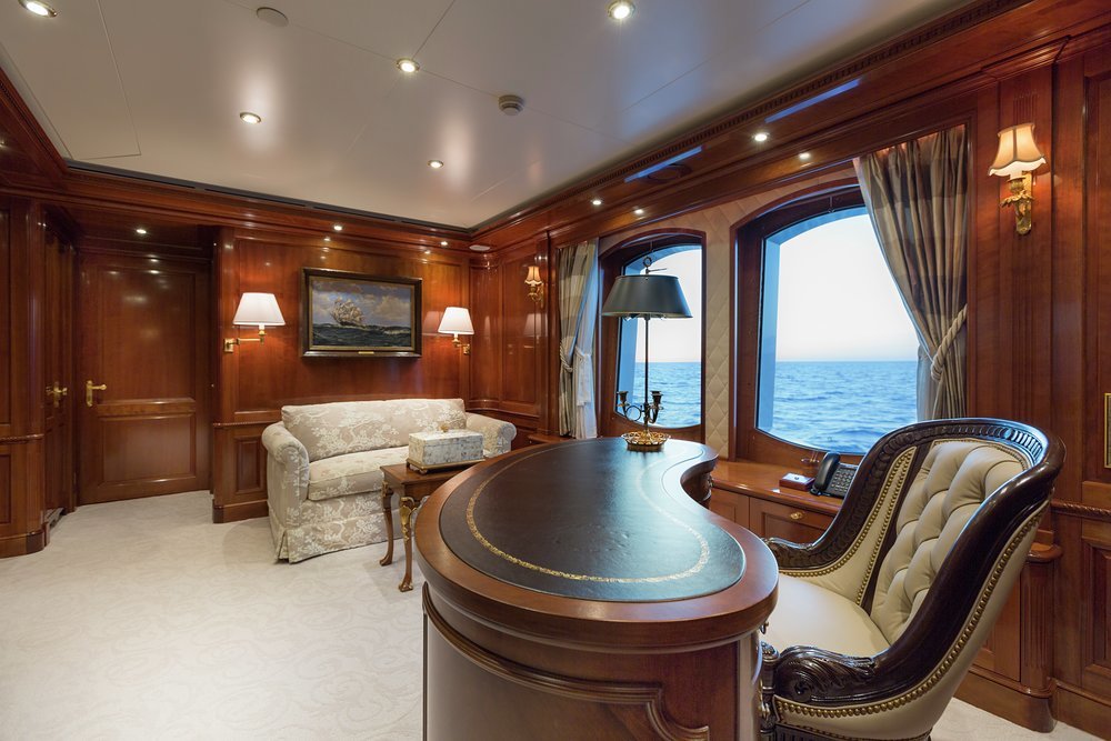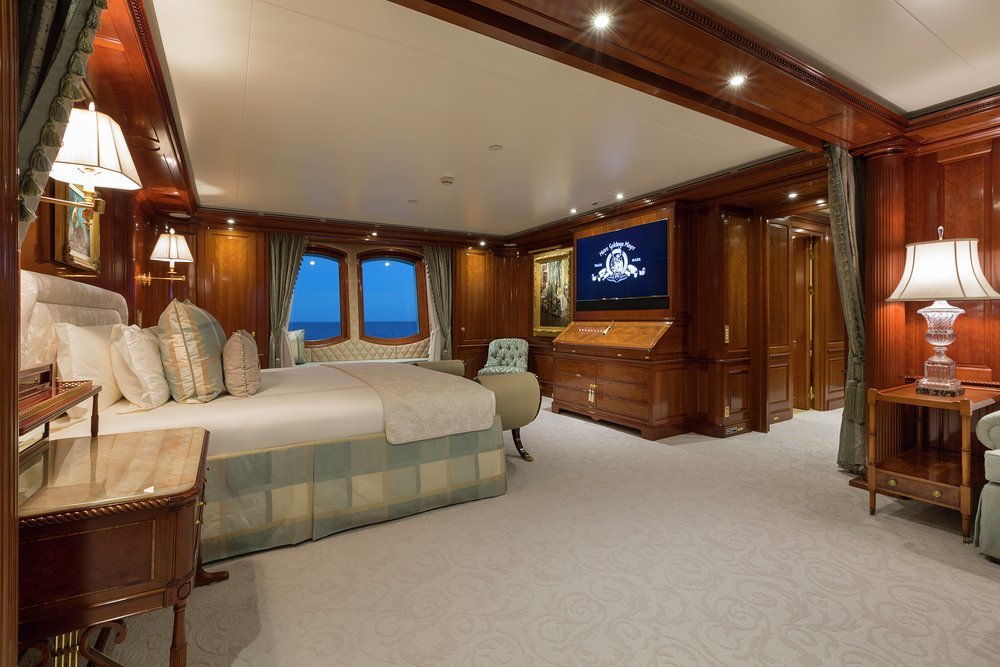 Master double with study, day head and shower. King size bed and his and hers bathrooms. Hers offers Jacuzzi tub with shower, bidet and toilet and his to port with shower, bidet and toilet. Forward again are large his and her wardrobes. VIP just aft of the Master, to port, offering a large walk-in wardrobe, queen size bed, bath with tub and shower, bidet and toilet on the main deck level with panoramic windows. Three double staterooms and one twin stateroom each with shower, bidet and toilet. a single sofa bed in the study. All cabins have a desk with mirror and seating. Bathroom products are Bulgari.
