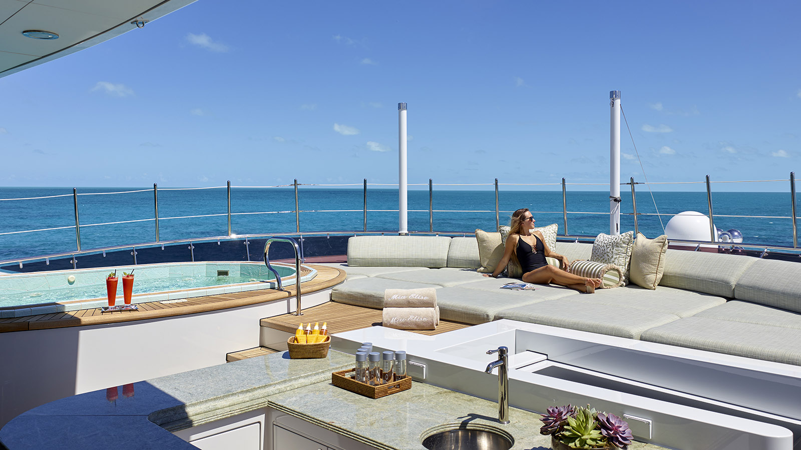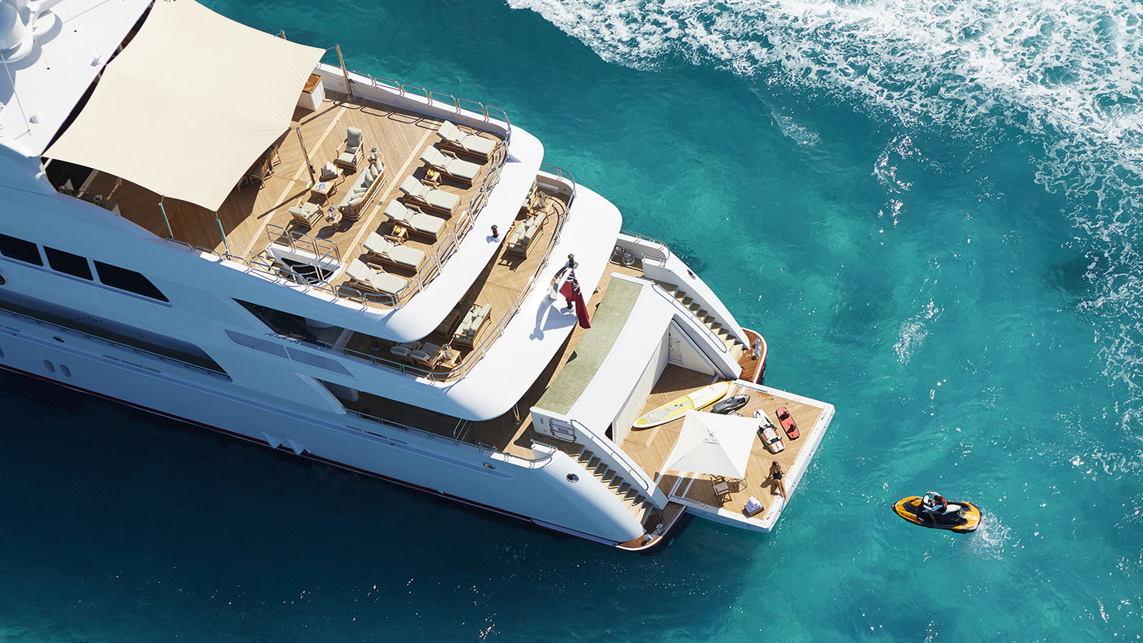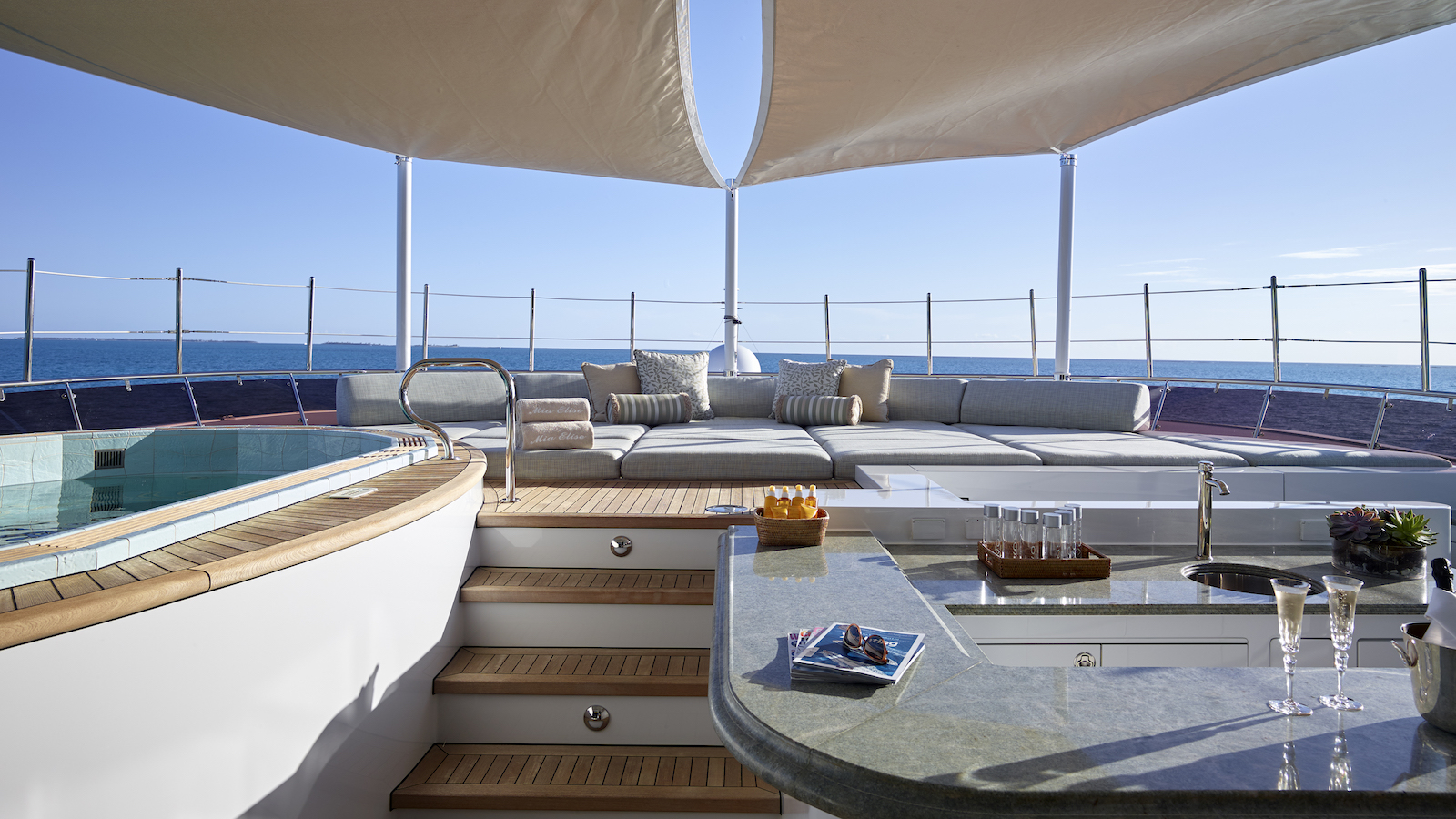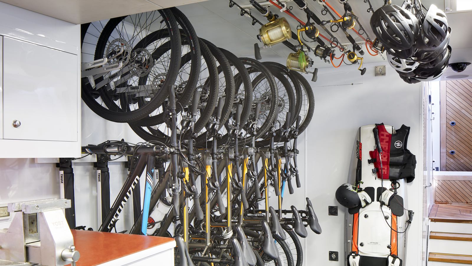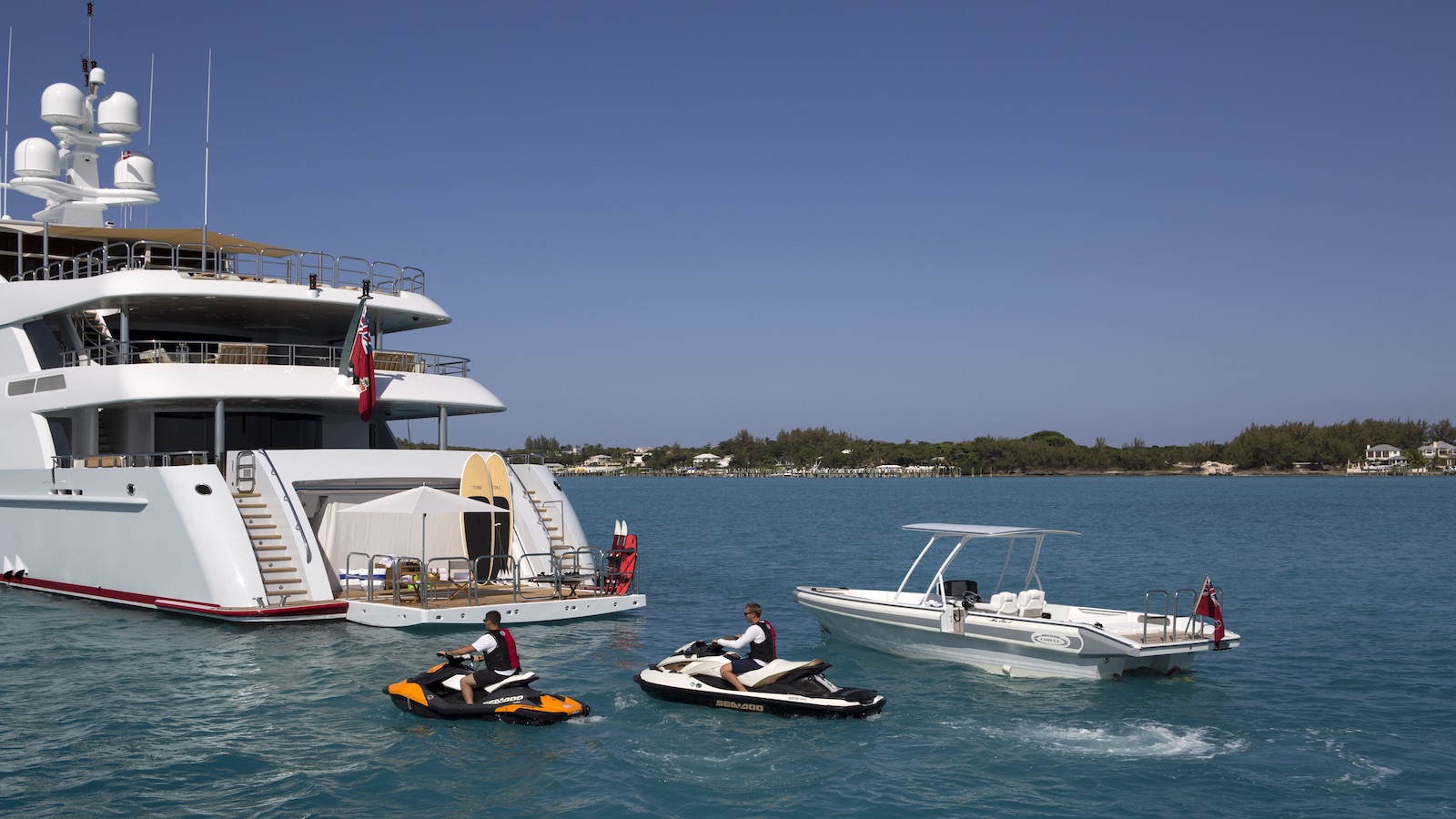 Tenders & Toys: 12.2m / 40ft Yellowfin/3 x 300 hp (towed) 8.4m / 27.5ft Novurania Chase / 295 hp 1 x RXT Sea-Doo, 1 x GTX Sea-Doo Jetski 1 x Sea-Doo Spark Jetski 1 x Jetsurf, 2 x stand-up paddle boards, waterslide, waterskis, wakeboards, towables including Big Mable, Unstable Mable, Paparazzi (3 person), Revolution (2 person spinning disc), Shark, banana 2 x single donuts, snorkelling gear, wetsuits, fishing gear 8 x bicycles (Crossover) Beach party setup: BBQ, tent, chairs and tables Not offered for charter to US residents while in US waters. Audio Visual Equipment and Deck Facilities: DirecTV (USA), Sky TI (UK) Playstation 4 Pro with virtual reality headset (2017) Communications: Satcom & cell VSAT. Wi-Fi throughout. Cell