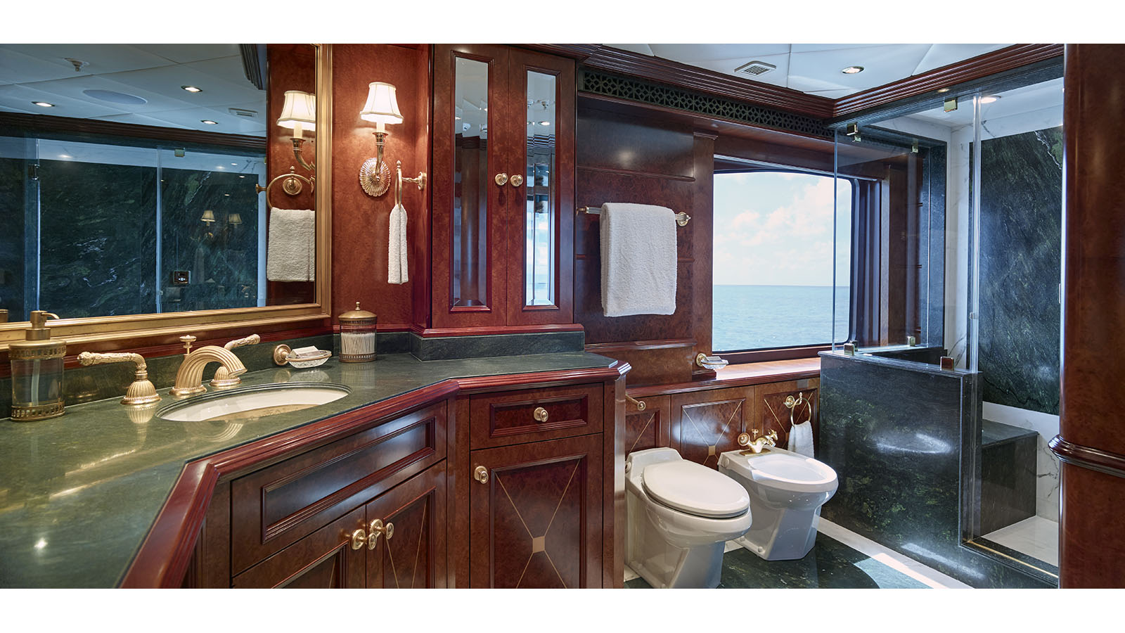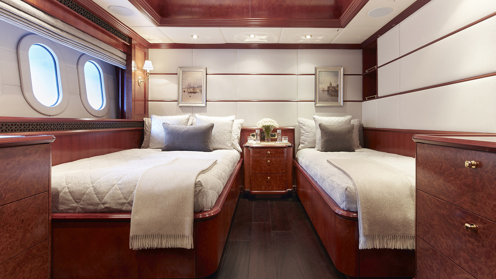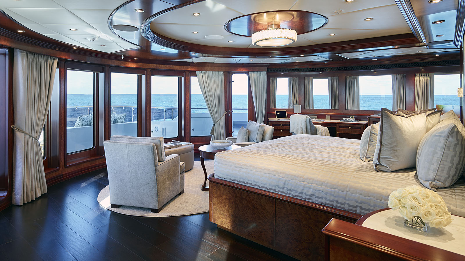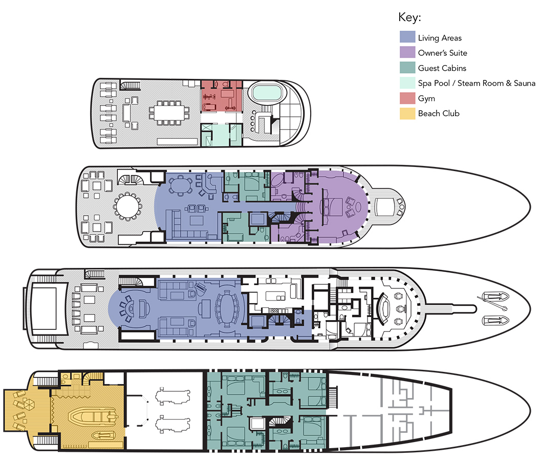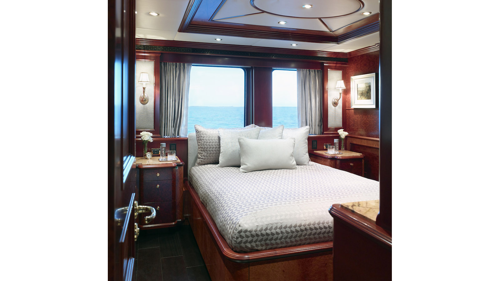 Guest Accommodation: 4 person elevator serving 3 decks. 7 en suite staterooms / convertible sofa in office on skylounge deck MASTER SUITE. KING. Skylounge deck forward The bed faces forward. 180 degreee panoramic windows Forward: seating area with sofa, 2 arm chairs. Sliding glass doors open to a private deck with a large sunpad area Vanity/desk to starboard. Pop-up TV to port and a drop down TV at the foot of the bed. Hers bathroom. Port. Jacuzzi under a picture window. Separate steam shower His bathroom with picture window. Starboard. Large steam shower Walk-in cedar closets Private panoramic deck accessible only from the master suite with large sunpad area Private access to the sundeck via an interior staircase and hydraulic controlled sliding hatch (forward of the elevator) QUEEN. Port forward of the skylounge. Shower. Vanity/desk 7th Stateroom: Office with convertible QUEEN sofa. Starboard forward of the skylounge. Shower ____________ ACCOMMODATION DECK: Guest foyer with seating bench and guest service area with wine fridge. KING. Port aft. L- shaped sofa with ottoman. Tub, double sinks KING. Starboard aft. Steam shower with bench. Double sinks KING + Pullman. Starboard forward. Shower DOUBLE, Single and Pullman. Port forward. Shower