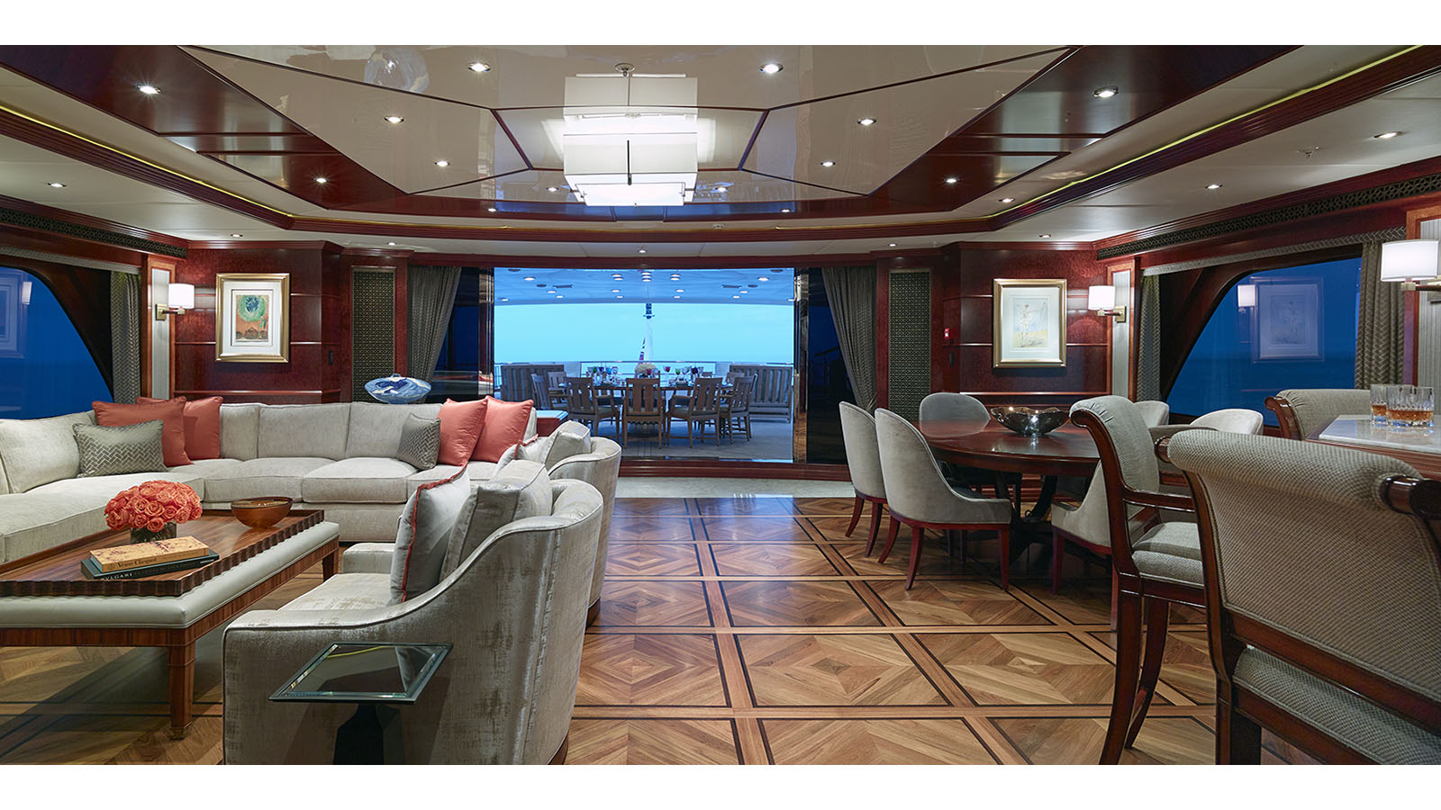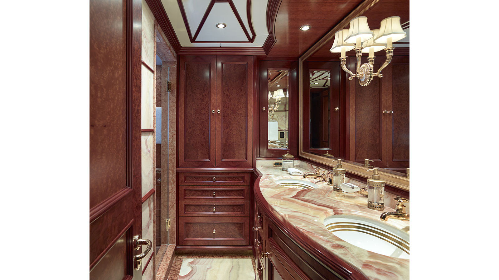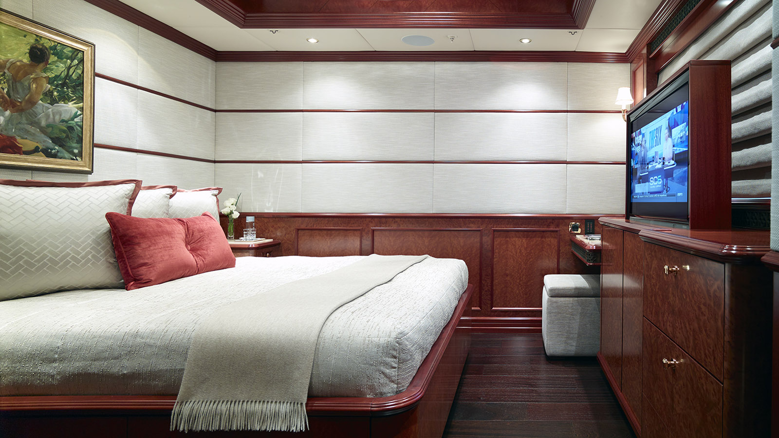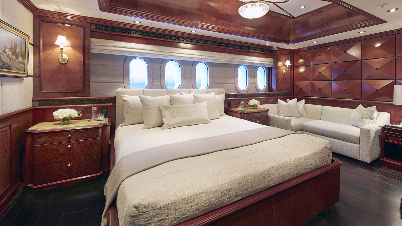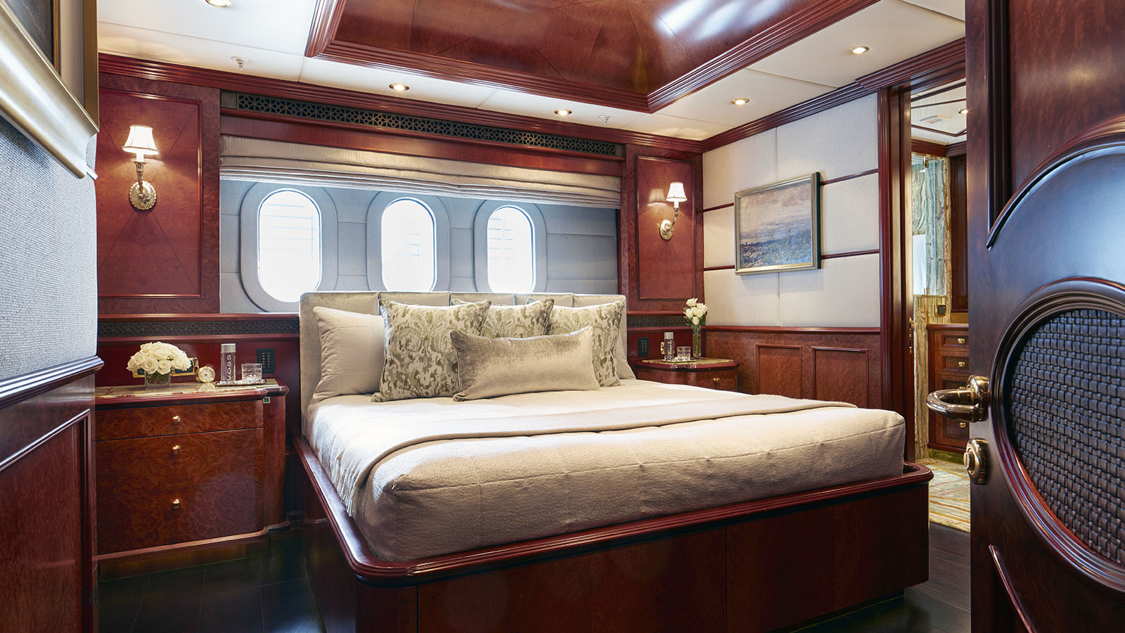 Guest Accommodation: 4 person elevator serving 3 decks. 7 en suite staterooms / convertible sofa in office on skylounge deck MASTER SUITE. KING. Skylounge deck forward The bed faces forward. 180 degreee panoramic windows Forward: seating area with sofa, 2 arm chairs. Sliding glass doors open to a private deck with a large sunpad area Vanity/desk to starboard. Pop-up TV to port and a drop down TV at the foot of the bed. Hers bathroom. Port. Jacuzzi under a picture window. Separate steam shower His bathroom with picture window. Starboard. Large steam shower Walk-in cedar closets Private panoramic deck accessible only from the master suite with large sunpad area Private access to the sundeck via an interior staircase and hydraulic controlled sliding hatch (forward of the elevator) QUEEN. Port forward of the skylounge. Shower. Vanity/desk 7th Stateroom: Office with convertible QUEEN sofa. Starboard forward of the skylounge. Shower ____________ ACCOMMODATION DECK: Guest foyer with seating bench and guest service area with wine fridge. KING. Port aft. L- shaped sofa with ottoman. Tub, double sinks KING. Starboard aft. Steam shower with bench. Double sinks KING + Pullman. Starboard forward. Shower DOUBLE, Single and Pullman. Port forward. Shower