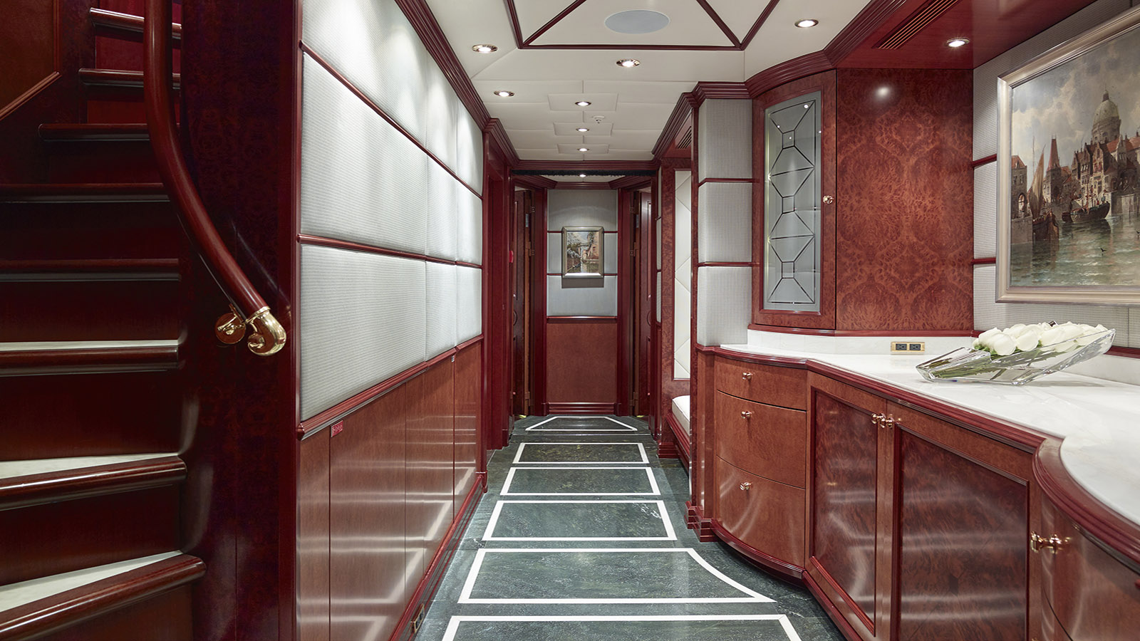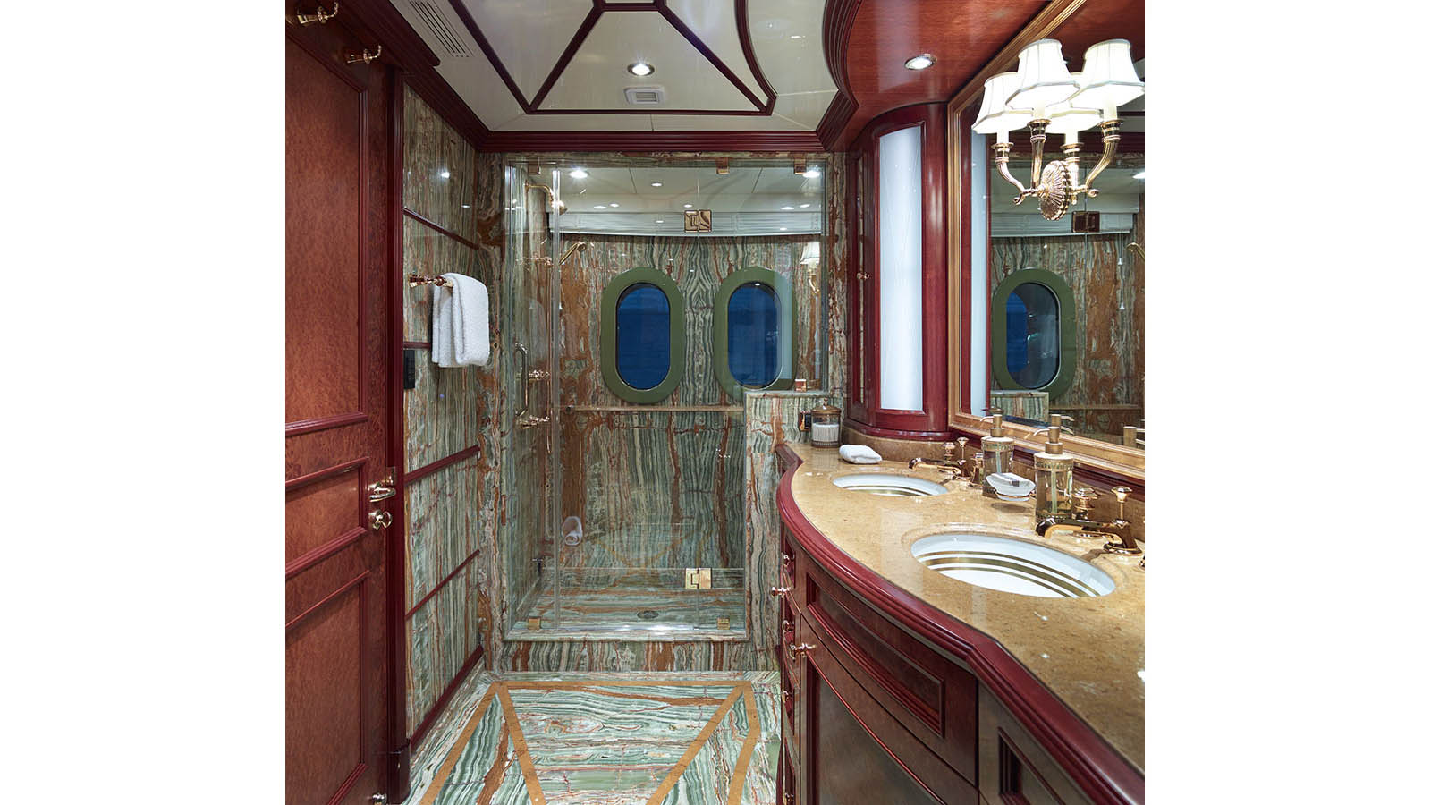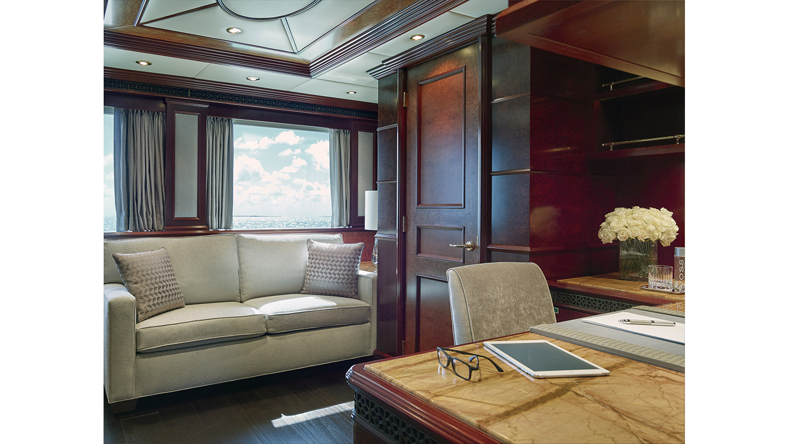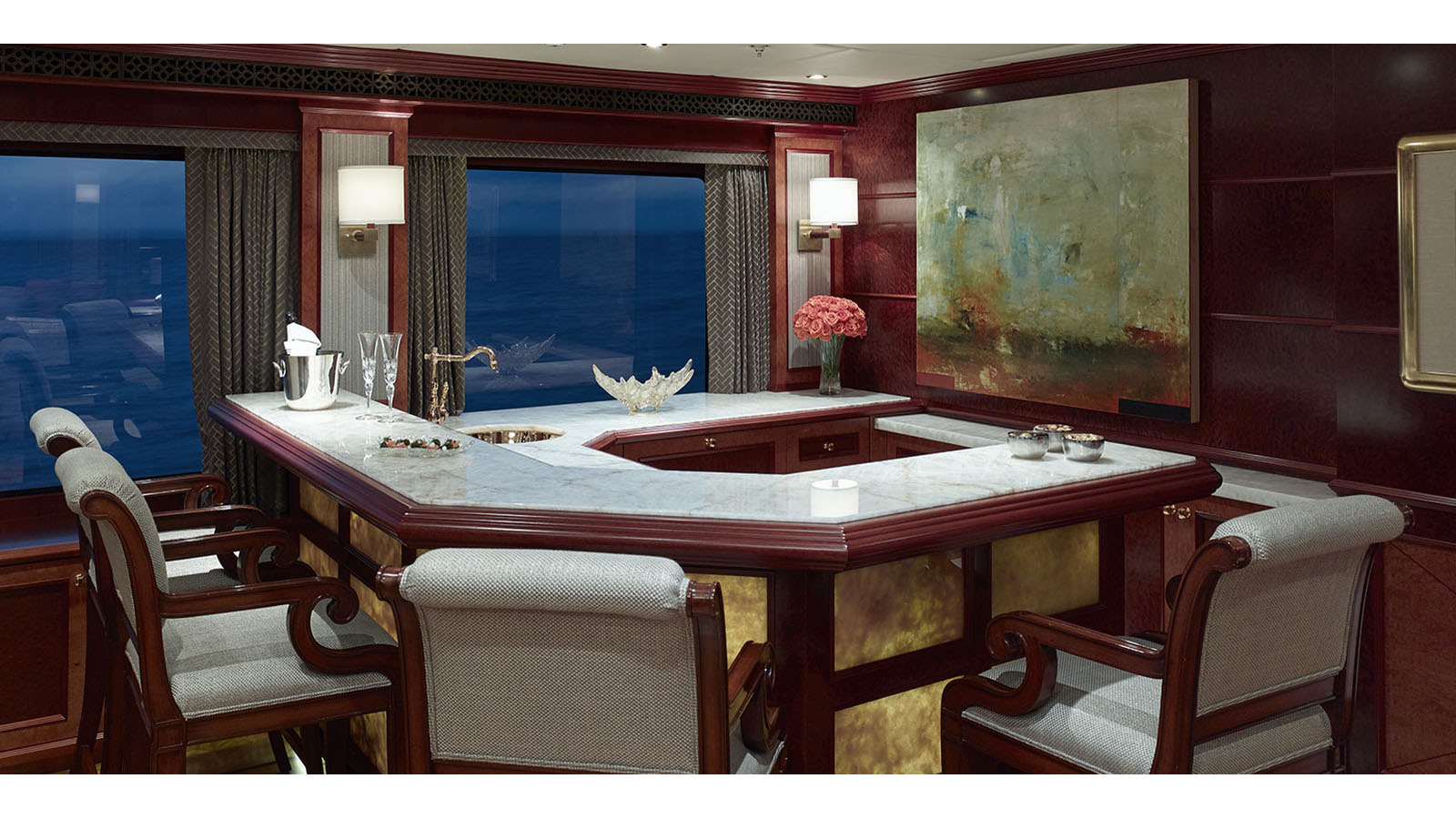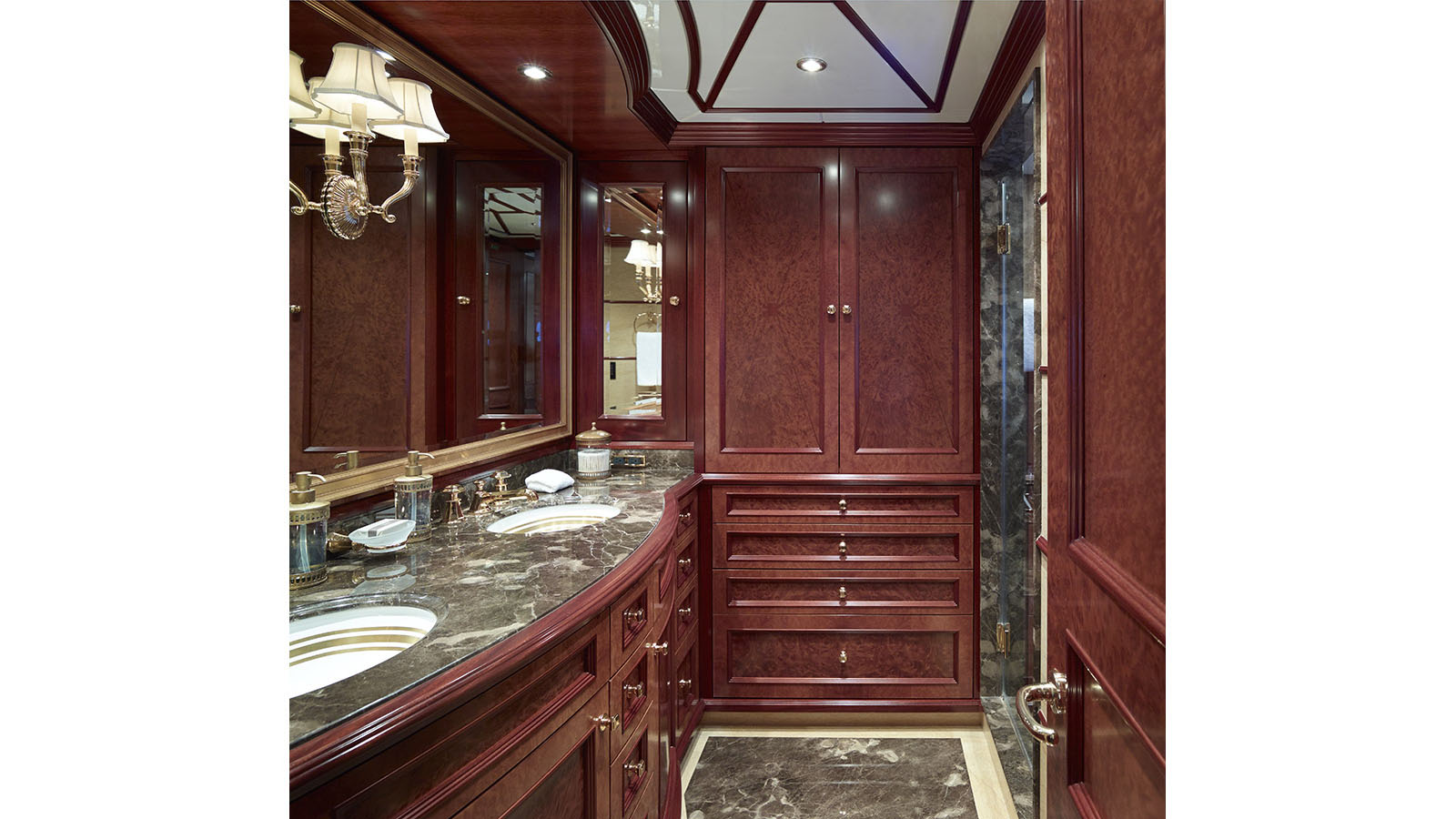 Guest Accommodation: 4 person elevator serving 3 decks. 7 en suite staterooms / convertible sofa in office on skylounge deck MASTER SUITE. KING. Skylounge deck forward The bed faces forward. 180 degreee panoramic windows Forward: seating area with sofa, 2 arm chairs. Sliding glass doors open to a private deck with a large sunpad area Vanity/desk to starboard. Pop-up TV to port and a drop down TV at the foot of the bed. Hers bathroom. Port. Jacuzzi under a picture window. Separate steam shower His bathroom with picture window. Starboard. Large steam shower Walk-in cedar closets Private panoramic deck accessible only from the master suite with large sunpad area Private access to the sundeck via an interior staircase and hydraulic controlled sliding hatch (forward of the elevator) QUEEN. Port forward of the skylounge. Shower. Vanity/desk 7th Stateroom: Office with convertible QUEEN sofa. Starboard forward of the skylounge. Shower ____________ ACCOMMODATION DECK: Guest foyer with seating bench and guest service area with wine fridge. KING. Port aft. L- shaped sofa with ottoman. Tub, double sinks KING. Starboard aft. Steam shower with bench. Double sinks KING + Pullman. Starboard forward. Shower DOUBLE, Single and Pullman. Port forward. Shower