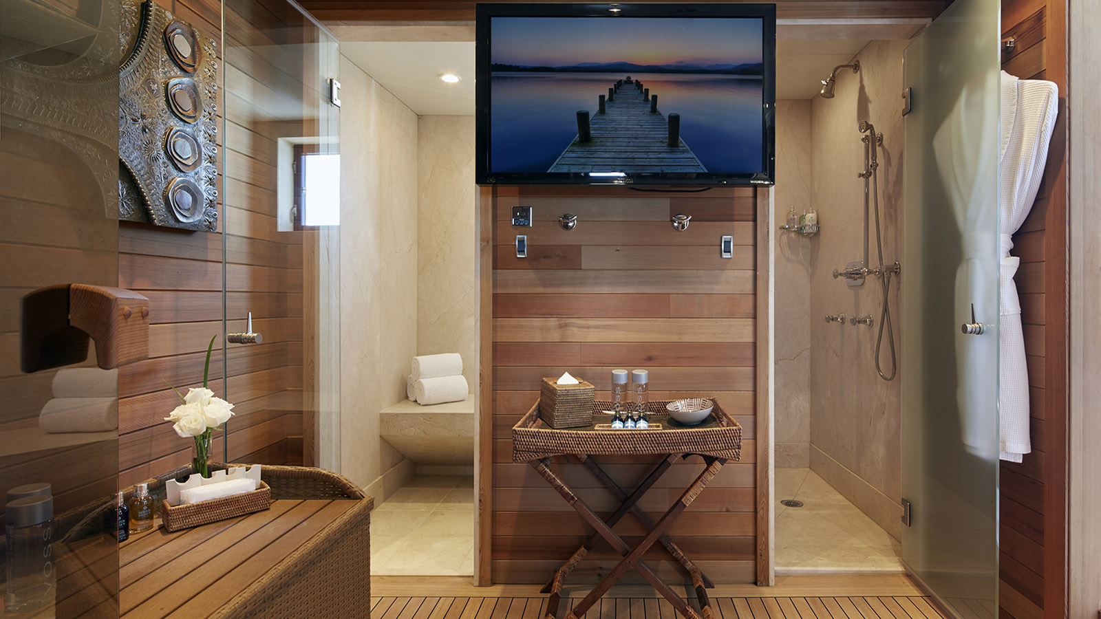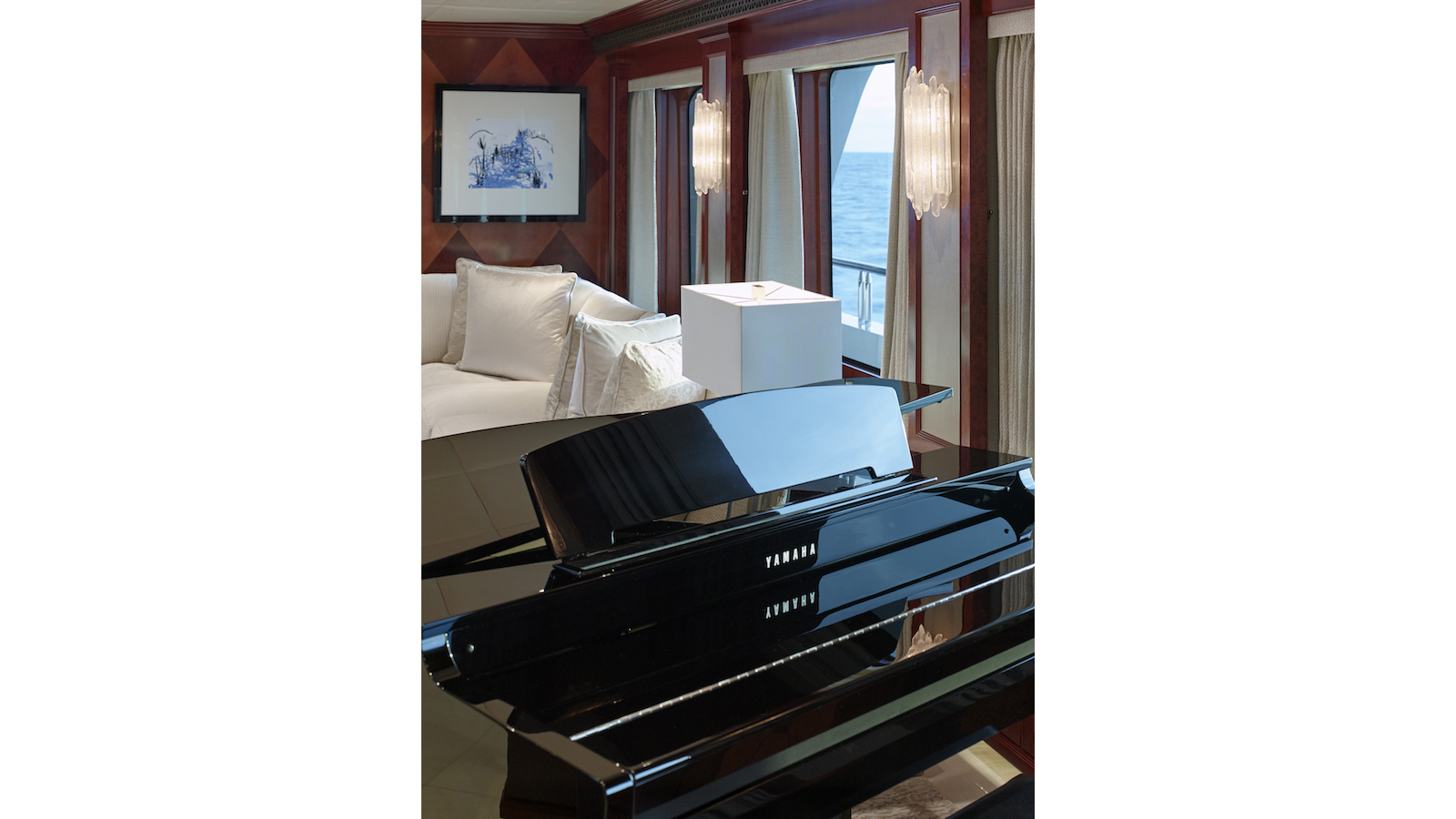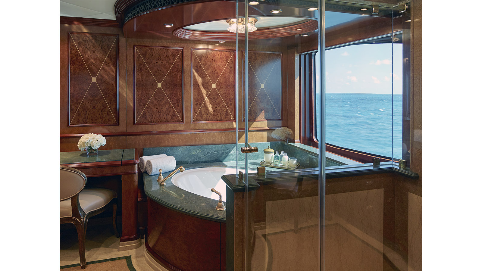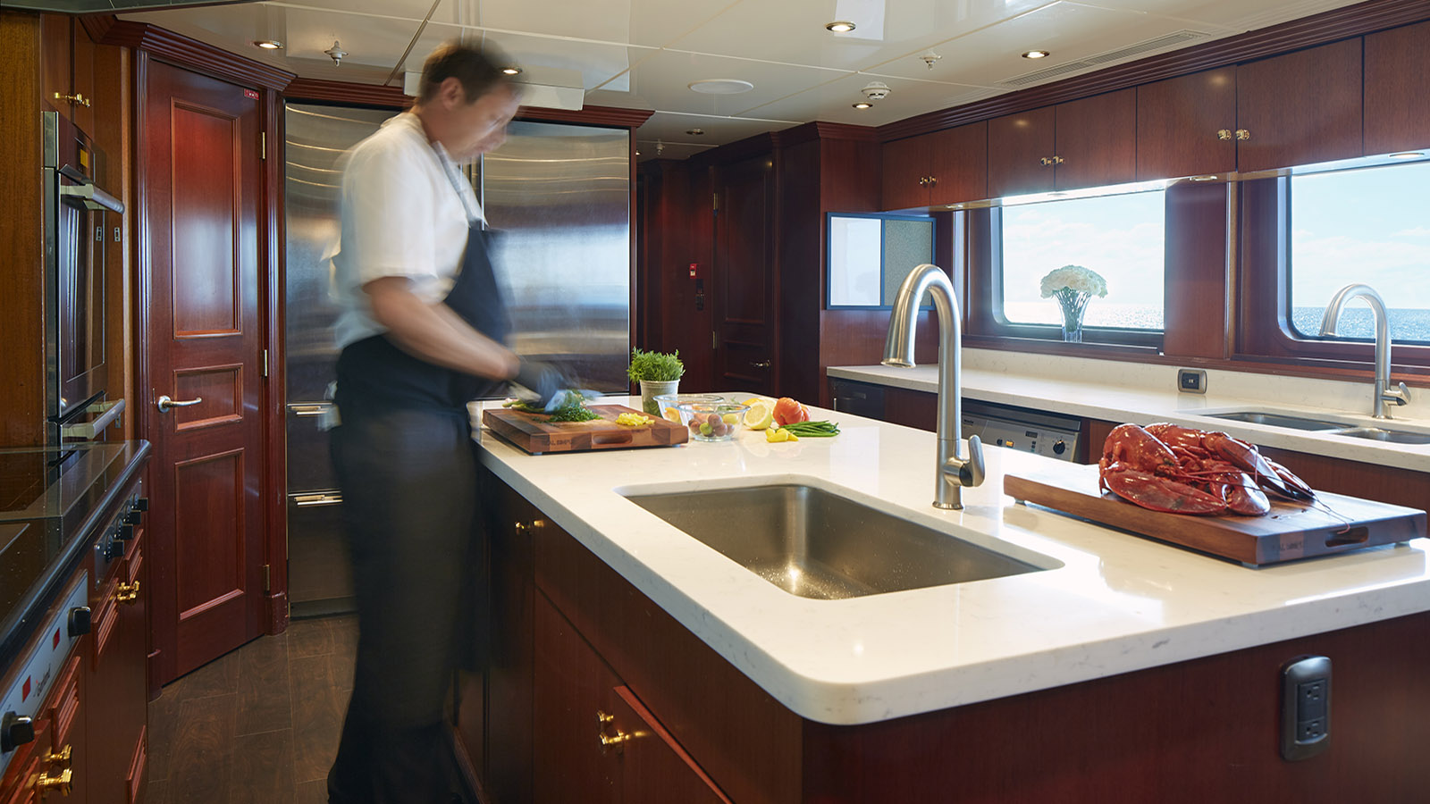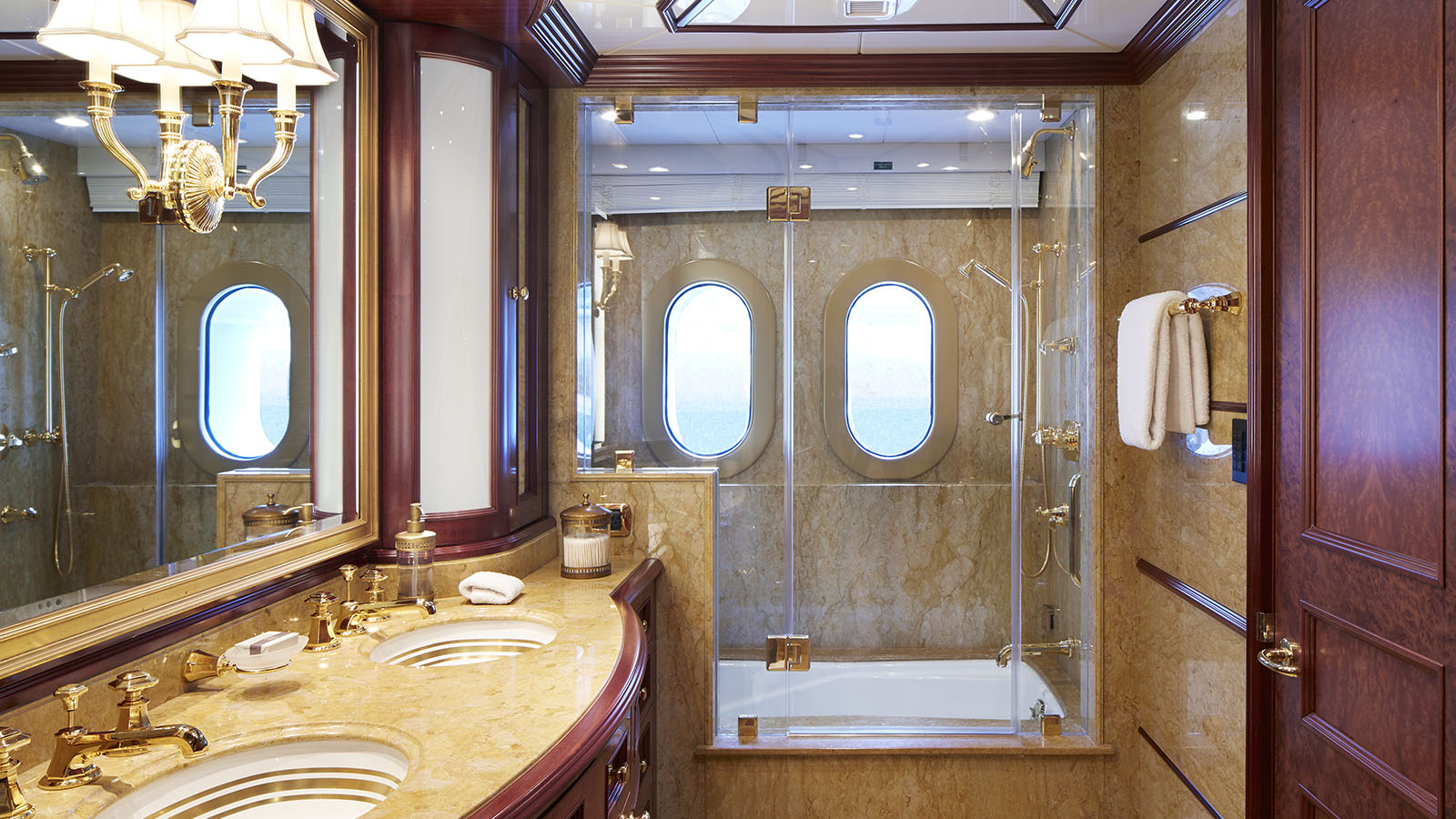 Guest Accommodation: 4 person elevator serving 3 decks. 7 en suite staterooms / convertible sofa in office on skylounge deck MASTER SUITE. KING. Skylounge deck forward The bed faces forward. 180 degreee panoramic windows Forward: seating area with sofa, 2 arm chairs. Sliding glass doors open to a private deck with a large sunpad area Vanity/desk to starboard. Pop-up TV to port and a drop down TV at the foot of the bed. Hers bathroom. Port. Jacuzzi under a picture window. Separate steam shower His bathroom with picture window. Starboard. Large steam shower Walk-in cedar closets Private panoramic deck accessible only from the master suite with large sunpad area Private access to the sundeck via an interior staircase and hydraulic controlled sliding hatch (forward of the elevator) QUEEN. Port forward of the skylounge. Shower. Vanity/desk 7th Stateroom: Office with convertible QUEEN sofa. Starboard forward of the skylounge. Shower ____________ ACCOMMODATION DECK: Guest foyer with seating bench and guest service area with wine fridge. KING. Port aft. L- shaped sofa with ottoman. Tub, double sinks KING. Starboard aft. Steam shower with bench. Double sinks KING + Pullman. Starboard forward. Shower DOUBLE, Single and Pullman. Port forward. Shower