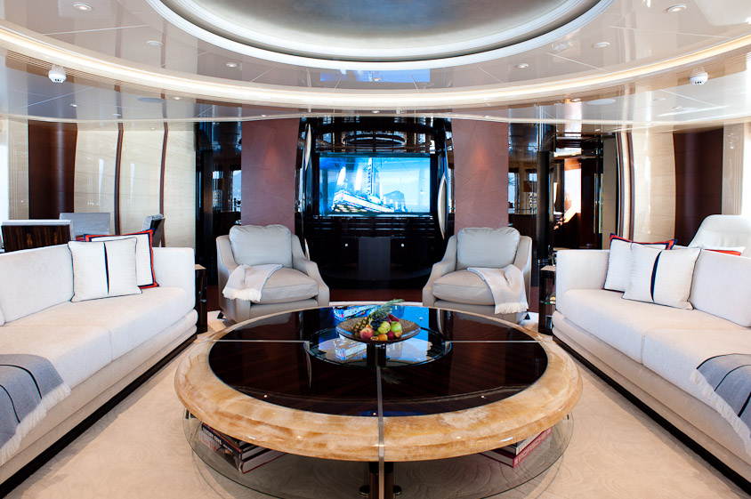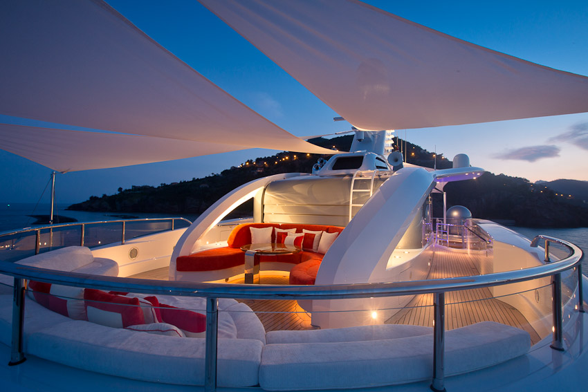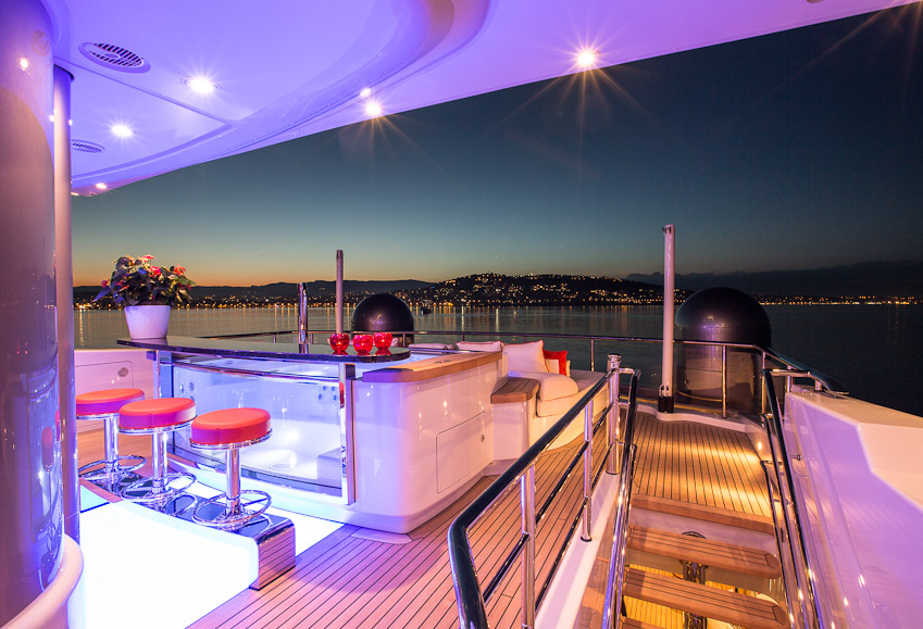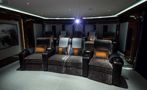 Tenders & Toys: 27 ft (8.22m) Novurania Chase 450 hp inboard diesel 23 ft (7m) Novurania Chasae w/ 350hp inboard diesel 2x 2 person waverunners 2x Hobie Quest Kayaks 1x Seabob 2x paddle boards Snorkel gear Plethora of inflatable and towable toys Rave Sports Water Trampoline SCUBA: 4x Full sets gear, compressor (Rendezvous only) Beach tents & chairs, portable BBQ Spa Equipment: Massage table, stone warmer, towel warmer for facials, pedicure/manicure (Services arranged from ashore at Charterer's expense) Variety of Board Games & Card Games, Playing Cards, Library Xbox 360 Elite (Located in Cinema) (Equipment inventory for the above is available upon request)Audio Visual Equipment and Deck Facilities: iPod stations in all staterooms and common areas. Xbox, Kaleidescape server w/ approx 1700 movie titles. Crestron controls throughout, surround sound in all staterooms. TV sizes and locations: 65" Upper Salon 52" Bridge deck sports bar 50" Main deck lounge 42" All Staterooms Cinema located forward on lower deck Projection screen w/ surround sound. Seating for 9 w/ individual reclining seats. Screen dimensions: Diameter 8.54ft (2.6m), Height 4.16ft (1.27m), Width 7.46ft (2.27m) Communications: VSAT, WiFi throughout