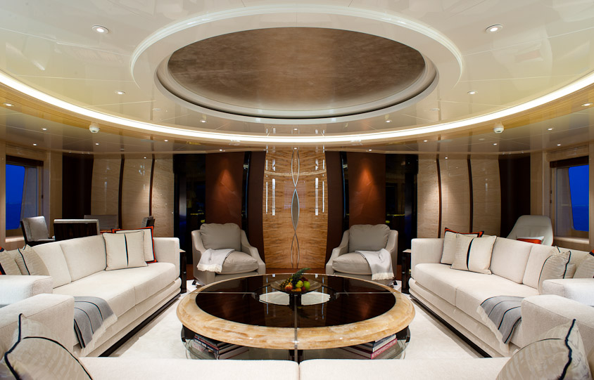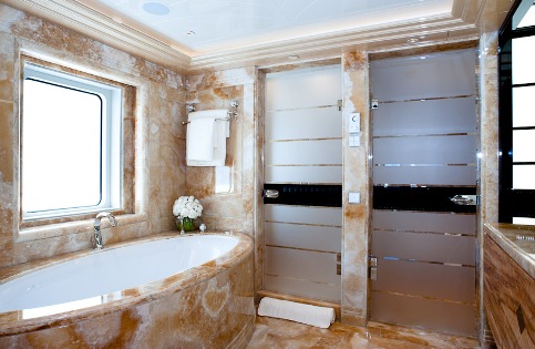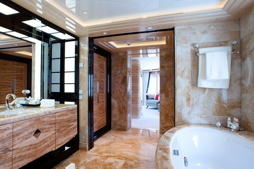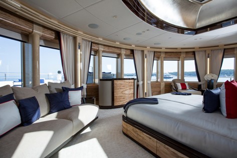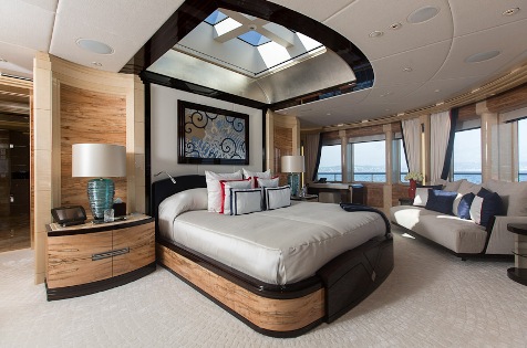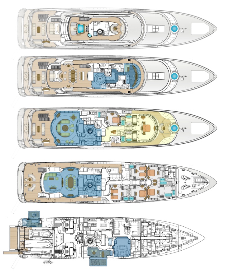 **Five level elevator encircled by a central staircase. Accessible from all decks. UPPER DECK FORWARD/Owner's Private Deck Emperor King center line bed faces forward w/ large sky light over head and 180 degree panoramic view, vanity desk, sofa, refrigerator and ample closet space. Separate His and Hers bathrooms to Port and Starboard. Each with Jacuzzi and shower(Hers w/ bidet) accessed via open walk through wardrobe. Sliding doors with full length mirror close off the area between bathrooms and wardrobes. Private office to starboard in Owner's lobby with personal espresso machine. Starboard access to owner's private walk around terrace with Jacuzzi, sun pads on either side, built in settee facing forward. Stairway access port/starboard to main deck There is a comfortable Queen size guest suite on the upper deck aft of the master suite. A hidden door in the paneling give this extra cabin direct access to the deck's pantry and to the crew passage to reach the galley and crew areas below. Ideal for Security/Nanny or Children. Main Deck **Remaining 5 Guests Suites are located on the main deck. All guest suites have large windows. VIP King, Starboard forward w/ en suite jacuzzi tub and shower. Walk-in closet and dressing area King Port Forward w/ en suite jacuzzi tub and shower King Port Amidships w/ en suite over sized rain shower and hand showers Twin Port Amidships w/ en suite over sized rain shower and hand shower Twin Starboard Aft w/ en suite overs sized rain shower and hand shower Optional awning on all outside decks. Separate crew passage to all levels for privacy