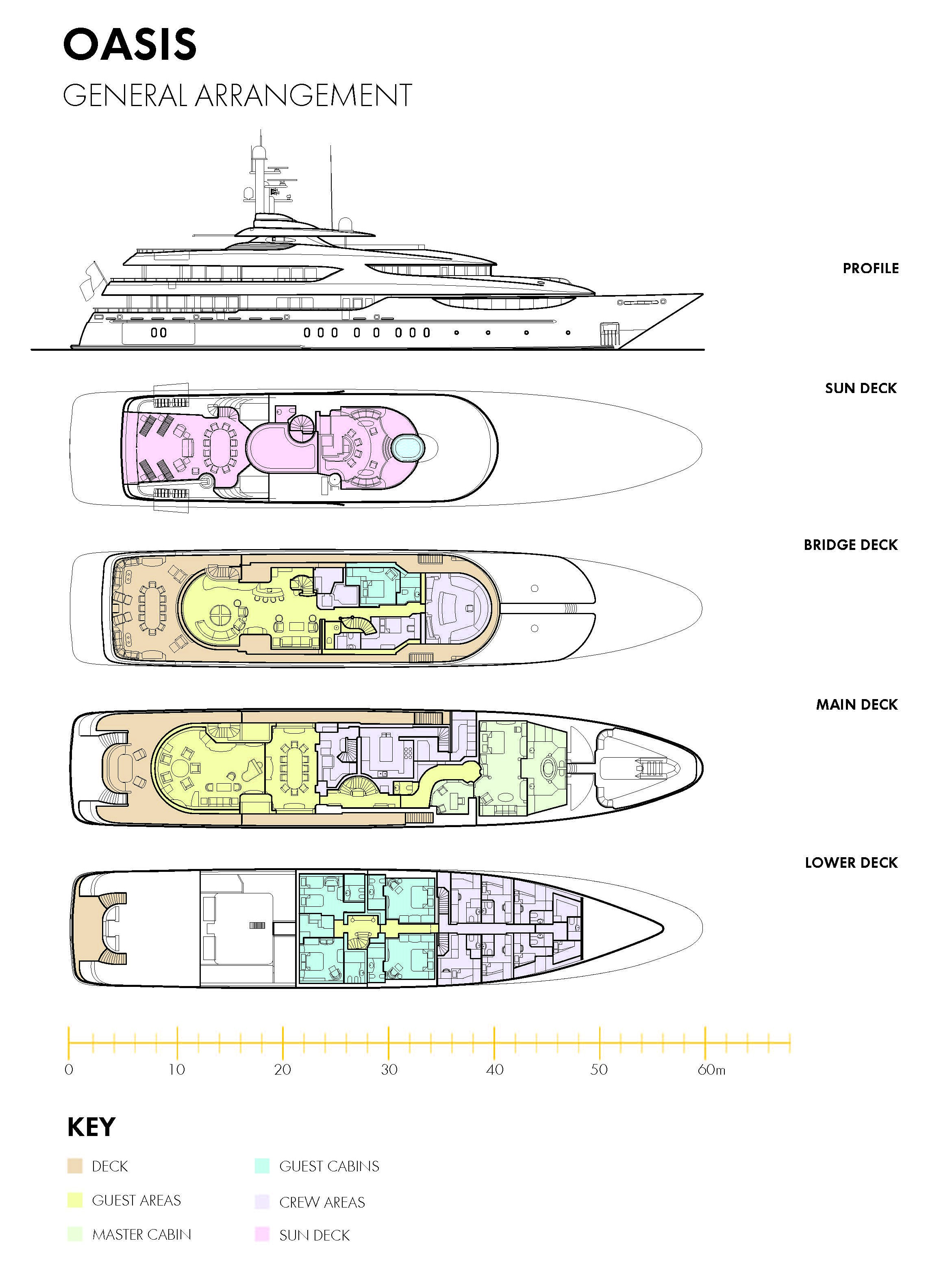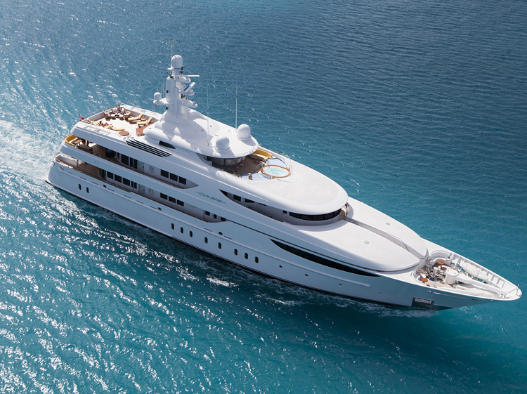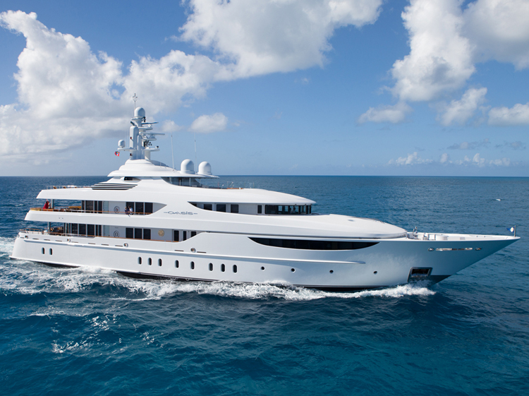 Tenders & Toys: 2 x 7.5m ‘Vikal’ custom sports tender, Volvo Penta 240 hp 2 x SeaDoo GTX 3 Man Waverunners 1 x Laser sailing dinghy 2 x ocean kayaks with foot operated blades as well as paddles. 1 x two person, 1 x one person 4 X Seabob electric aquatic scooters 2 x Segways 2 x Jetsurf 2 x Stand up paddle boards Kite surf equipment for the trained Windsurfer 1 x bicycle Wide range of inflatables ideal for children including climbing pyramid Kneeboard, wakeboards, waterskis, towables Diving equipment Oasis is an RYA approved PWC training school.Audio Visual Equipment and Deck Facilities: Outdoor cinema Oasis has just installed a large ceramic projection screen on the sundeck. AV system is controlled via Ipad. - Each stateroom / entertainment area has its own satellite receiver for DSTV - Disco with lighting & mood lighting on sundeck - IPOD interface, X-box, Playstation, and camcorder interface - Guest features include access to yacht’s ‘track & position’, Conning and CCTV Sundeck – Large area forward partially covered with overhead, incl. jacuzzi, open feature shower, bar and BBQ. Full fair weather enclosure on centerline with 5.1 sound disco / gym, 42” drop down Plasma, powder room. Aft sundeck features open, or covered dining with expansive sun-lounging space. Upper Deck Aft – Covered table seating for 12, perimeter seating with cocktail tables, bar facilities. Upper Deck Skylounge – Two seating areas with large sofas, entertainment center with 5.1 sound & 60” Plasma, bar with seating, and powder room fwd. Main Deck Aft – Covered table seating for 8, access to swim platform and passerelle. Main Deck Salon & Dining – Large sofa, games table, entertainment center with 5.1 sound and 60” Plasma. Formal dining room with seating for 12. Powder room fwd. Foredeck – Seating area. All cabins with plasma flat screens Communications: VSAT antenna for voice and HSD – 512kb/128kb F77, F33, 2 x GSM terminals Voice, HSD (ethernet and wireless) throughout yacht Mitel telephone exchange Fax 3 x VHF radio terminals SSB, Sat C NewspaperDirect – print on demand daily newspapers available V-Sat and 3G capabilities onboard to get the best possible coverage.