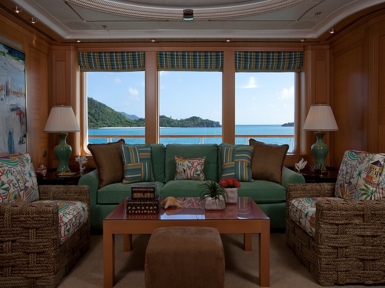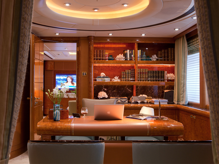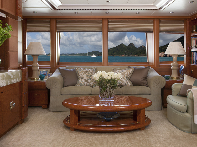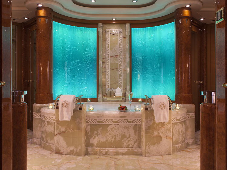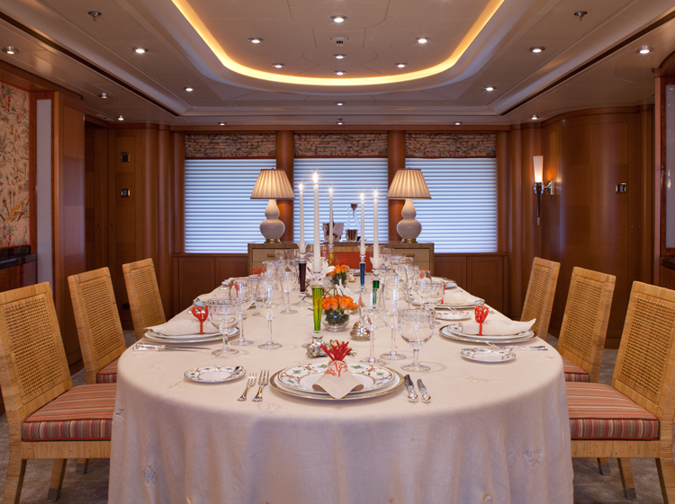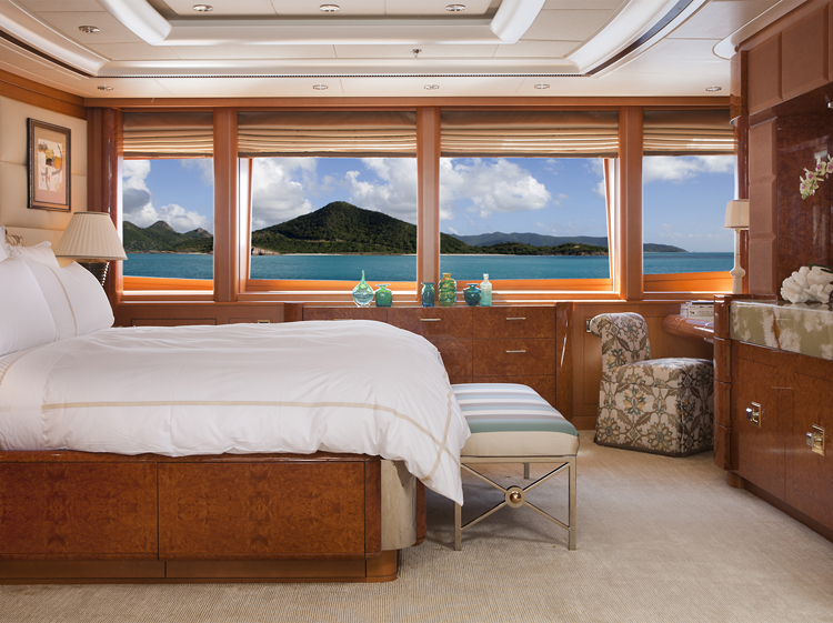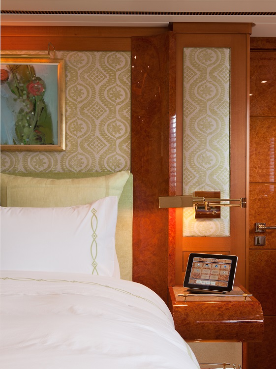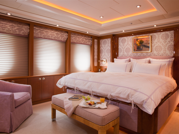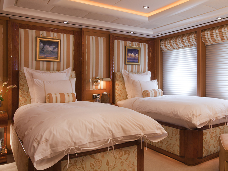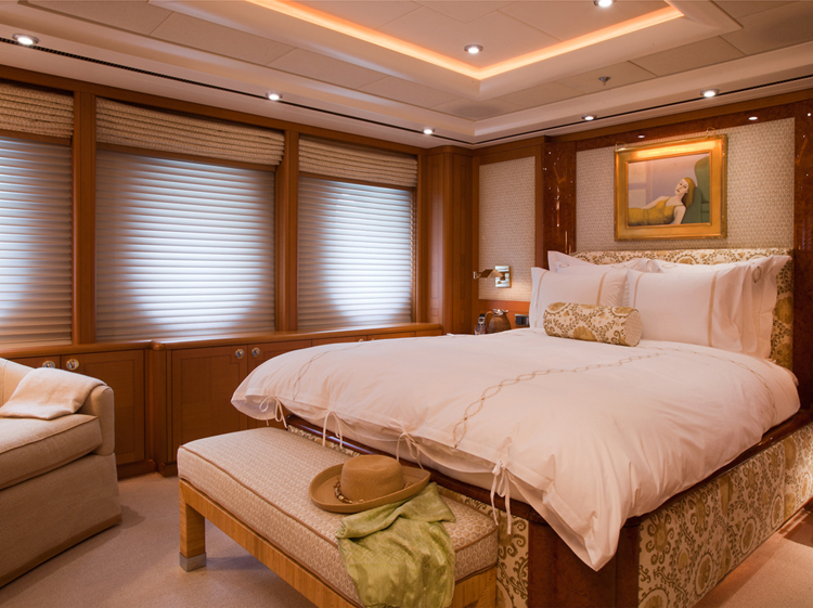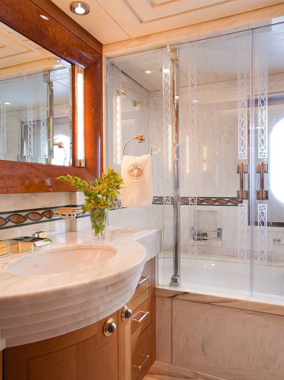 Oasis offers accommodation for 12 guests in six cabins. Master Stateroom – Main Deck – forward: King bed, ensuite marble bathroom with his and hers facilities, Jacuzzi tub, walk-in shower, walk-in closets, annexed lounge, private office. 5.1 sound in stateroom and lounge with 50” Plasma screens, 42” Plasma in office, Ipad control for all room functions including local entertainment, lighting, temperature, blinds and shades. Dimensions: The total 99m2(1,060sq.ft.) of owner's quaters' are comprised of as follows: Stateroom - 45m2 (482sq.ft.) Combined bathroom & dressing rooms - 28m2 (300sq.ft.) Office - 12m2 (128 sq.ft.) Corridor - 14m2 (150 sq.ft.) VIP Stateroom – Upper Deck – port: Queen bed, ensuite marble bathroom with walk-in shower, walk-in closet. 5.0 sound with 42” Plasma, Ipad control for all room functions including local entertainment, lighting, temperature, blinds and shades. Guest Stateroom – Lower Deck – port: King bed, ensuite marble bathroom with walk-in shower. 5.0 sound with 42” Plasma, Ipad control for all room functions including local entertainment, lighting, temperature, blinds and shades. Guest Stateroom – Lower Deck – starboard: King bed, ensuite marble bathroom with walk-in shower. 5.0 sound with 42” Plasma, Ipad control for all room functions including local entertainment, lighting, temperature, blinds and shades. Guest Stateroom – Lower Deck – port: Twin single beds, ensuite marble bathroom with tub and shower. 5.0 sound with 42” Plasma, Ipad control for all room functions including local entertainment, lighting, temperature, blinds and shades. Guest Stateroom – Lower Deck – starboard: Queen bed, ensuite marble bathroom with tub and shower. 5.0 sound with 42” Plasma, Ipad control for all room functions including local entertainment, lighting, temperature, blinds and shades.