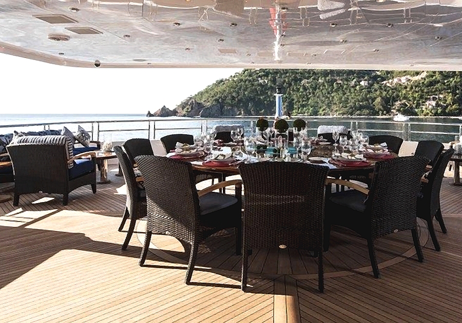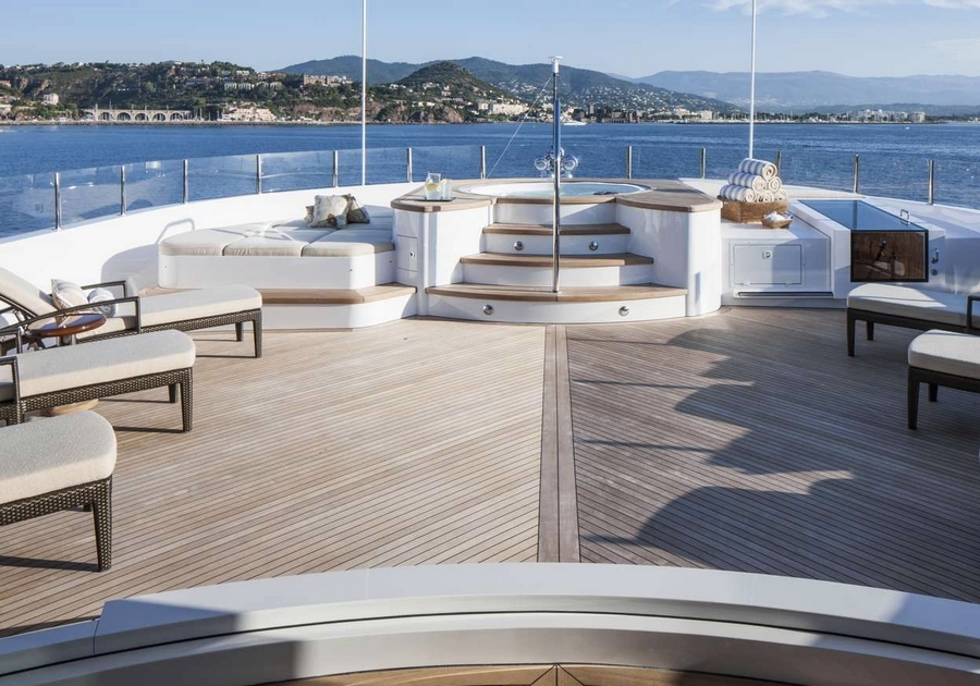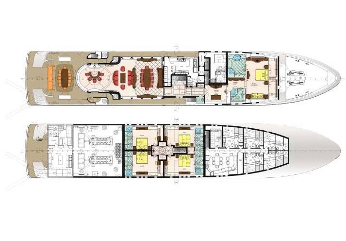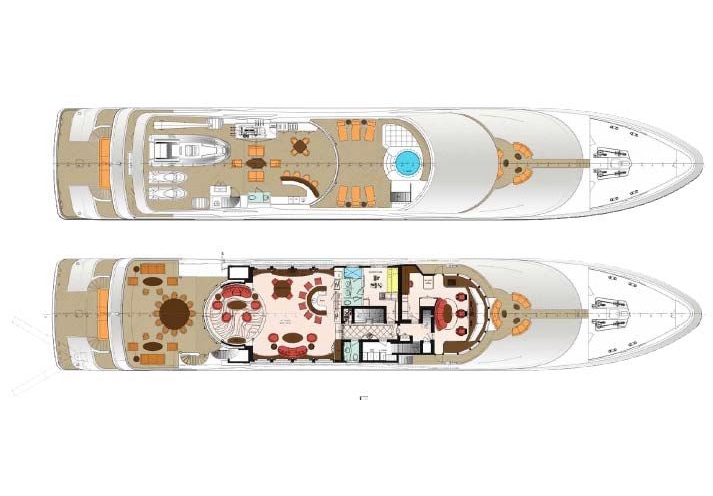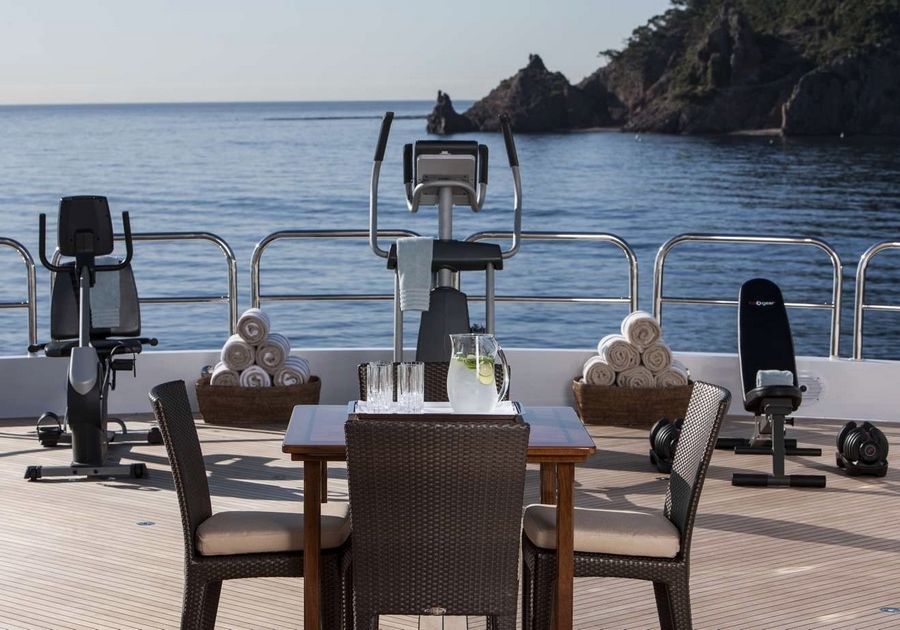 Tenders & Toys: 1 x 39' Nor-Tech center console tender with twin Yamaha 350hp engines 1 x 7m Novurania tender with 225hp engine 2 x waverunners (3 man) 1 x kayak (2 man) 2 x Paddle Boards 1 x wakeboard 1 x kneeboard 1 x waterski Inflatables: chariot, donuts, 8 pax lounge island, Inflatable Jungle gym Snorkelling gear Fishing gear Driving green and floating golf balls Exercise equipment: 2 x treadmills, Stationary Bike Cybex multifunctional weight and cable machine deluxe incline bench, hex dumbbell weights, yoga mats Audio Visual Equipment and Deck Facilities: Aft deck and upper aft deck are equipped with radiant heat and forced A/C. State-of-the-art audio-visual systems with satellite TV. Kalidascape controls. Televisions including lift systems or auto closing systems, stereo, cinema, DVD equipment, etc. Audio visual equipment, surround sound. Computer equipment or network, uninterrupted power sources (UPS), special cabling, etc. DECK Exercise equipment: 2 X professional treadmills Cybex Cable Bravo Trainer Hex Dumbbells (10 - 100lbs) Putting green, driving green and floating golf balls Stationary Bike Jacuzzi Zero speed stabilizers Ultimate dance party on top deck Barbeque Communications: Satcom & cellular communications; VSAT, Wi-Fi internet access,