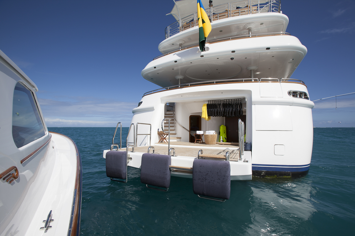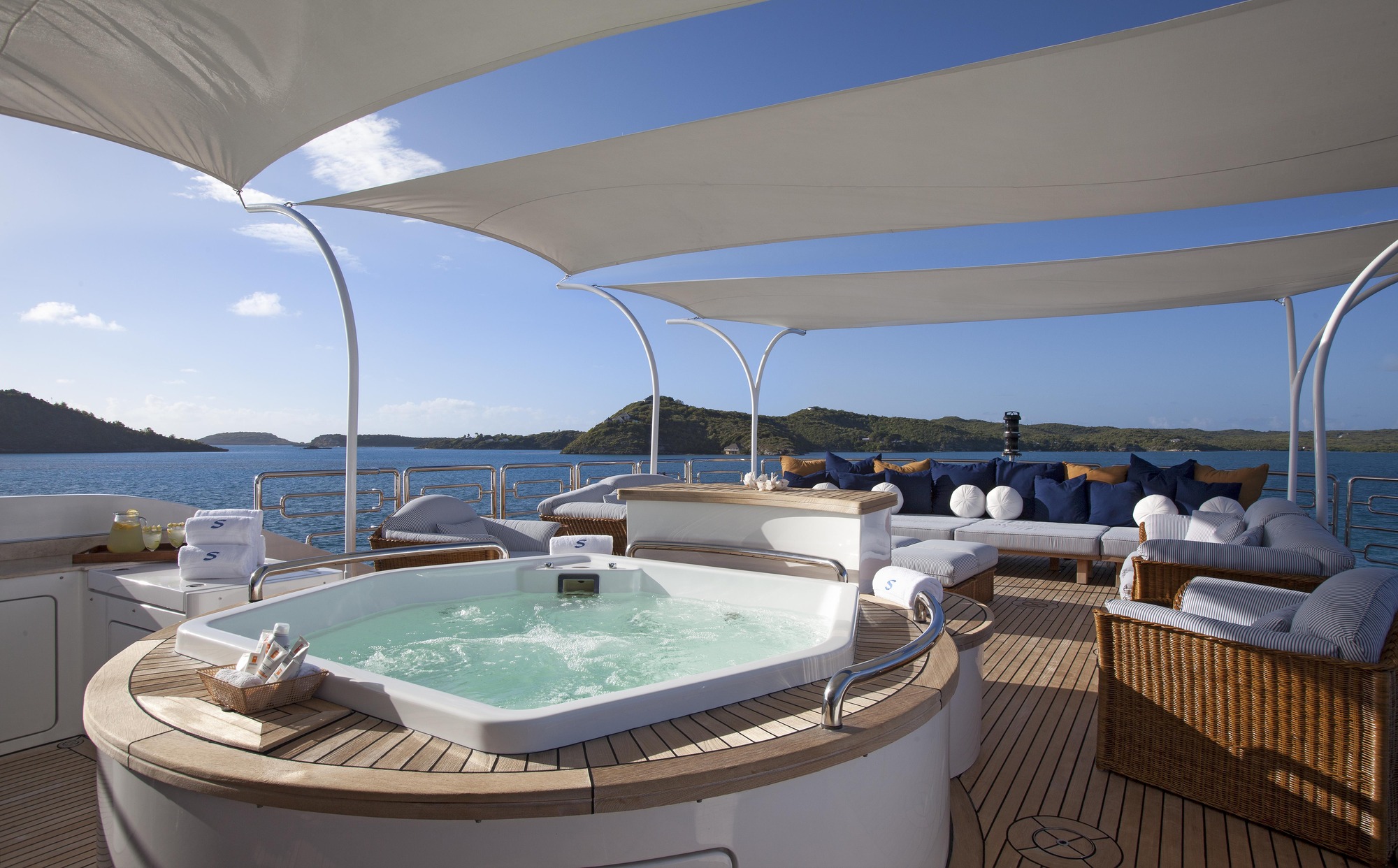 Tenders & Toys: 1 x 36 ft. 1995 Hinckley Jet Drive Picnic Boat Tender 1x 15ft Nautica wide-body tender with 90ph engine 2 x 850cc wave runners 1 x stand up jet ski 2 x Seabobs 2 x paddle boards 2 x 1-person kayak 2 x 2-person kayaks Trampoline, two tubes, snorkeling gear, 5 person inflatable toboggan, wake boards, water skis, lots of inflatable toys, water ski instructor Audio Visual Equipment and Deck Facilities: Jacuzzi on Sun Deck, Self-Contained Massage Studio, Sauna, Exercise Equipment: Elliptical, Recumbent Bike, Treadmill, Assorted Weights, Yoga Mats, Workout Bands Communications: - 1x Seatel 6004 KU - 1x F77 - 1x Iridium - 1x Furuno model DELCOM 15 satellite Sat Com C - 2x Fixed GSM cell phones - Sat and or LTE Internet and WIFI through out